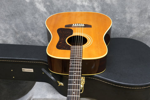 1979 Guild D40 square shouldered dreadnought in good condition. It has a solid spruce top, mahogany back & sides and a mahogany neck with a rosewood fingerboard. There are a couple of replaced bridge pins and its supplied in a non original hard case. The D40 is often referred to as the Bluegrass model and was made famous by Richie Havens at Woodstock in '69.