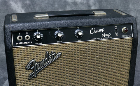1966 Fender Champ in very good condition. This amp is 110V and comes supplied with a new step-down transformer. This little black-era Fender amp delivers five watts of pure tube tone through its recently re-coned, period correct Oxford speaker. (dated to 1967)