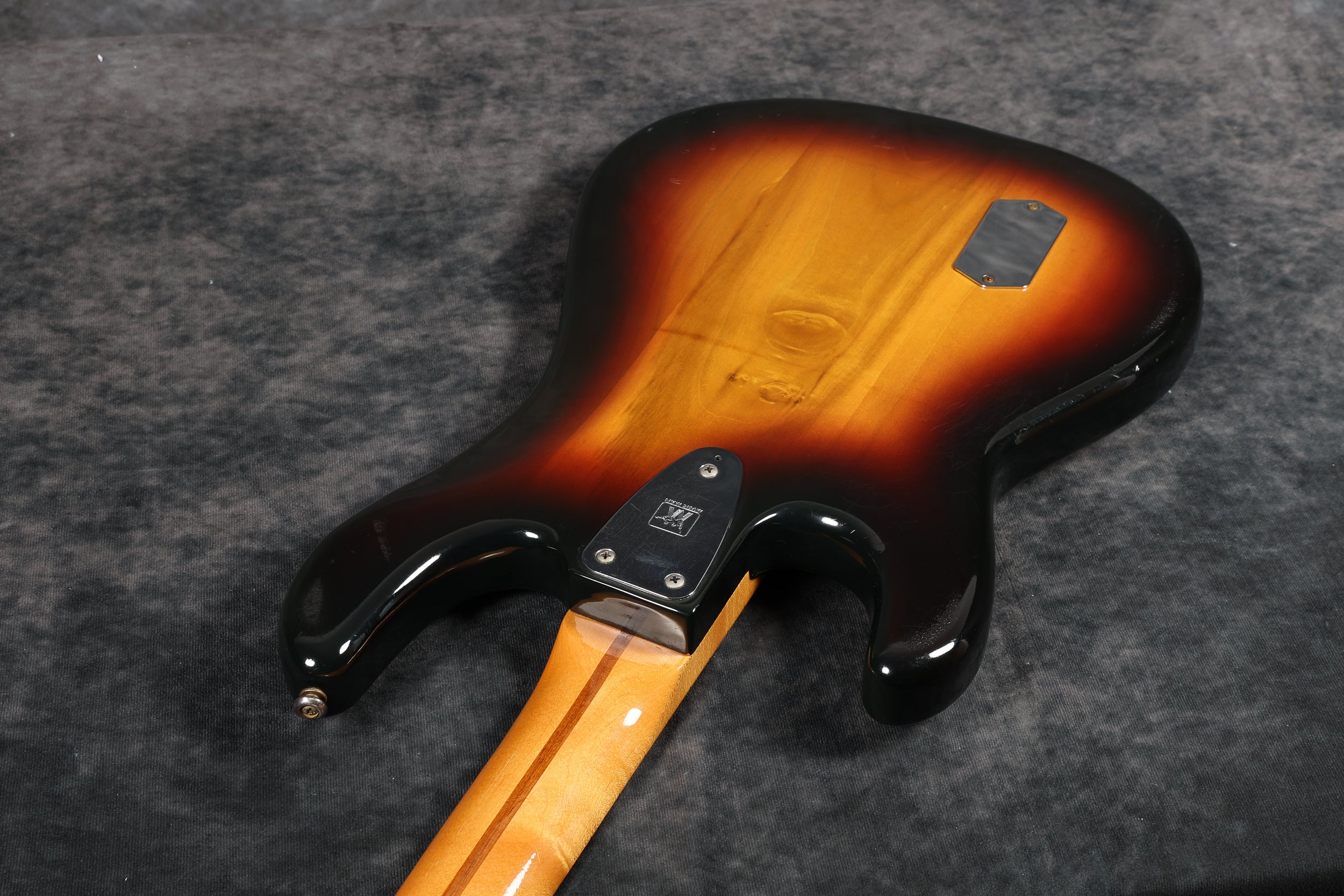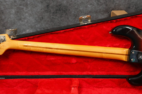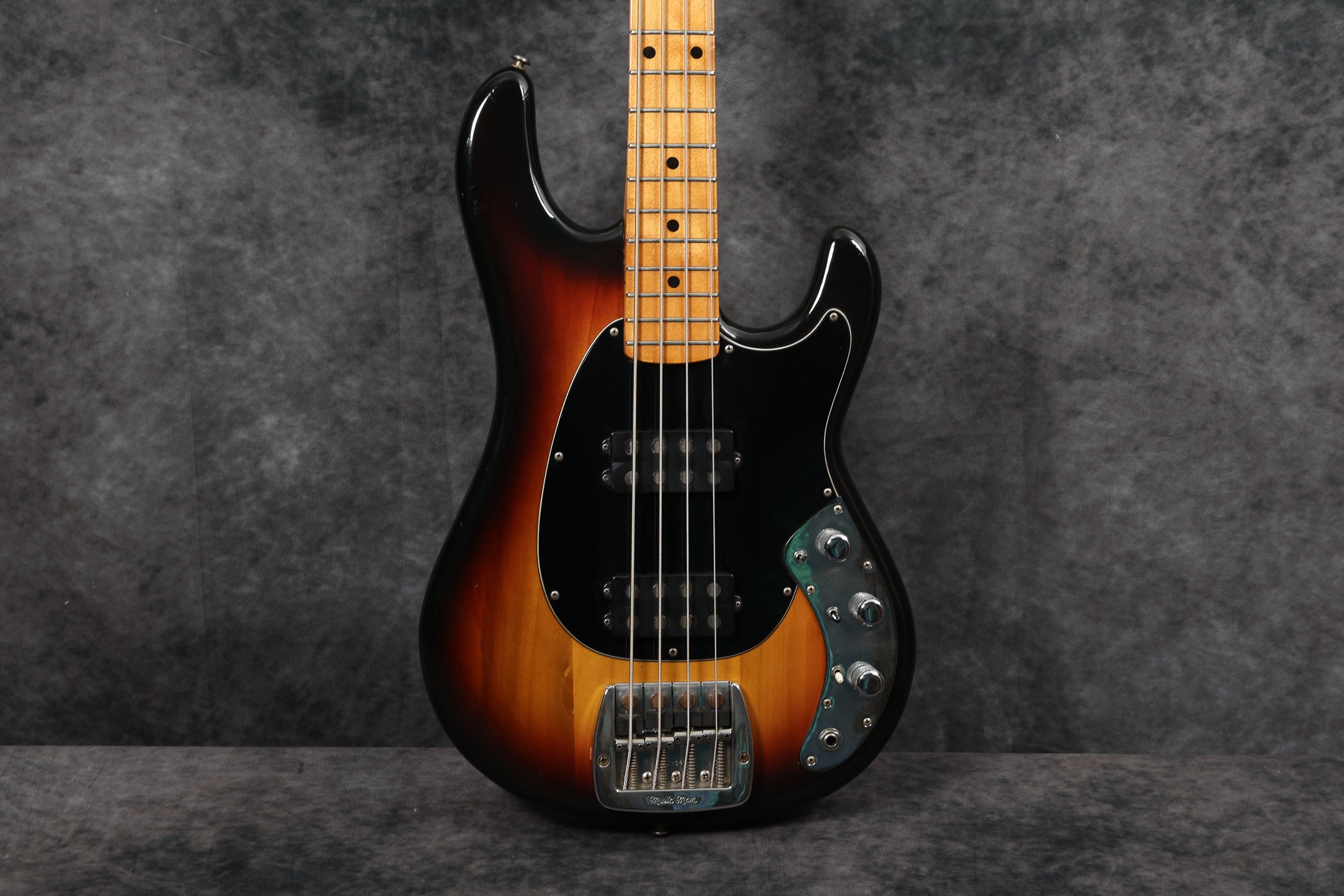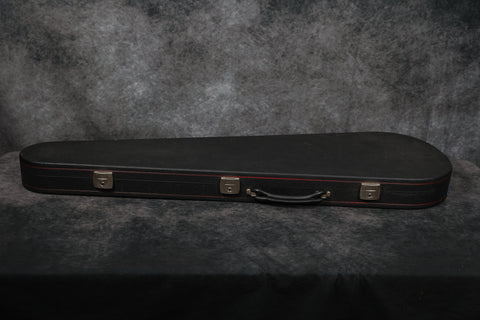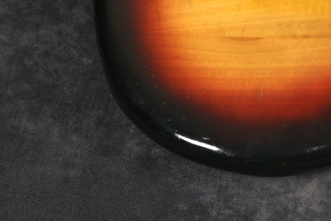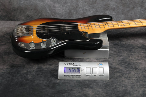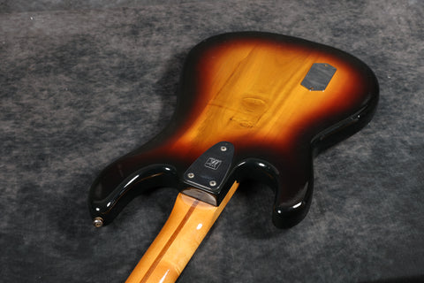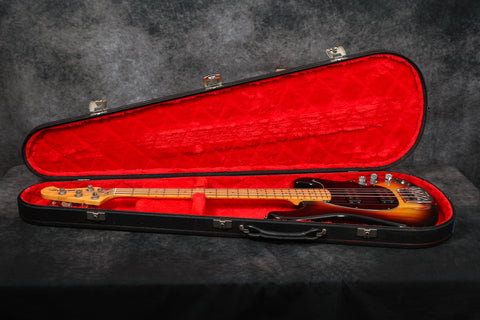 1979 Music Man Sabre bass in very good + condition. Sunburst finish with a maple neck & fretboard. Black pickguard, 2-band EQ, Contoured body, 2 humbucking pickups, internal micro powered pre-amp, brightness + phase in/out, and pickup selector switches. New mute sponge, the pickup selector switch has been replaced, and it's supplied in a non-original case. Otherwise original and complete.