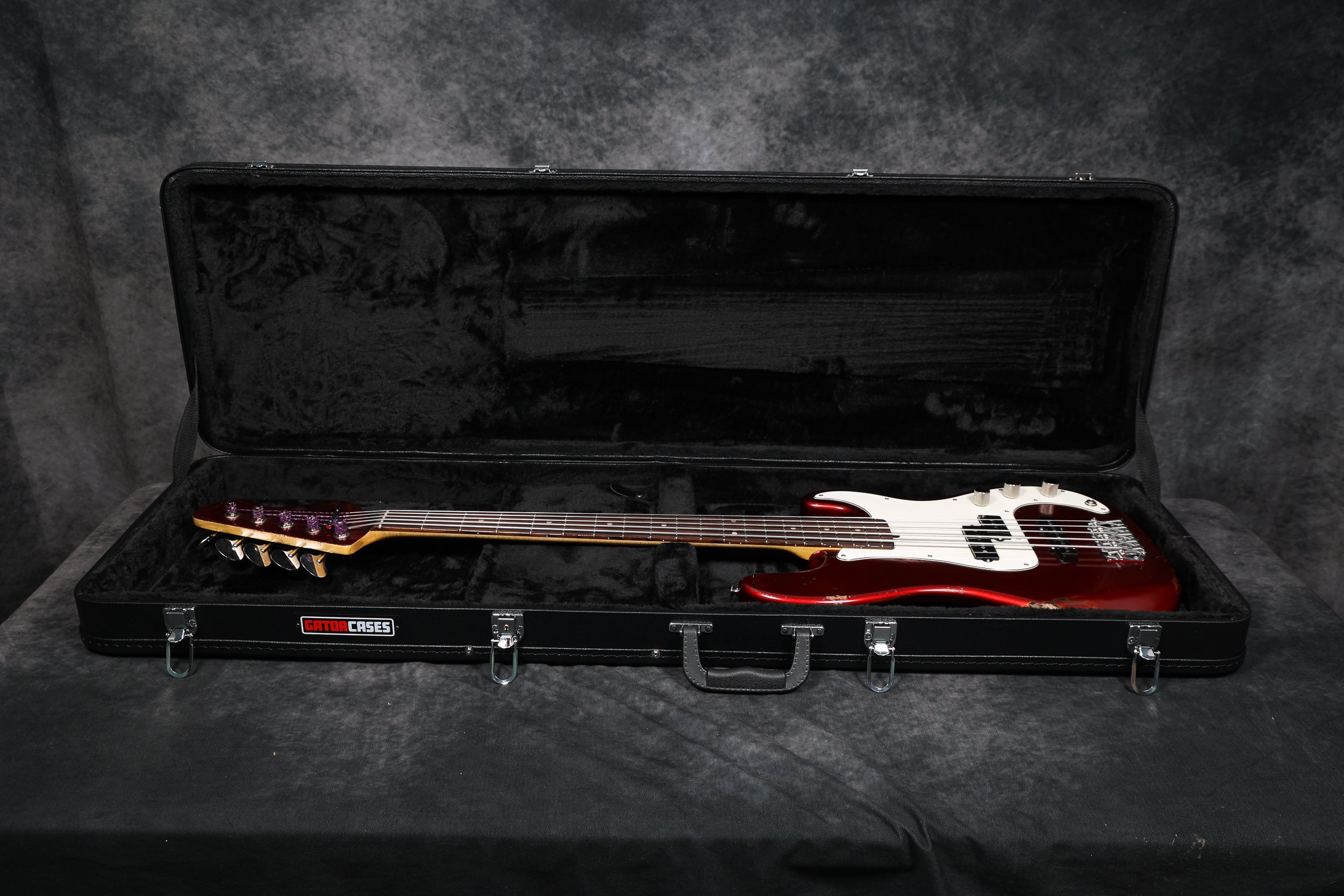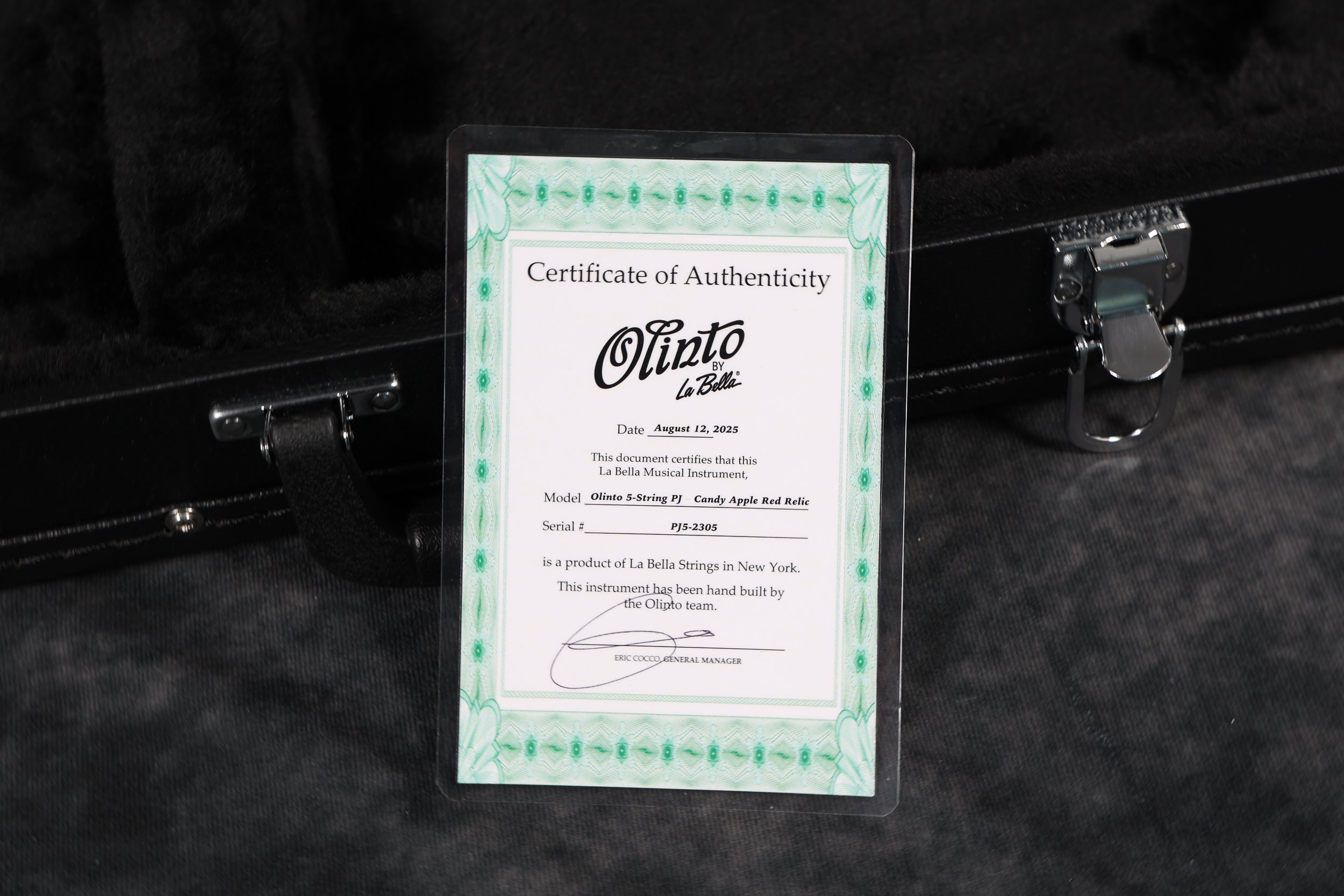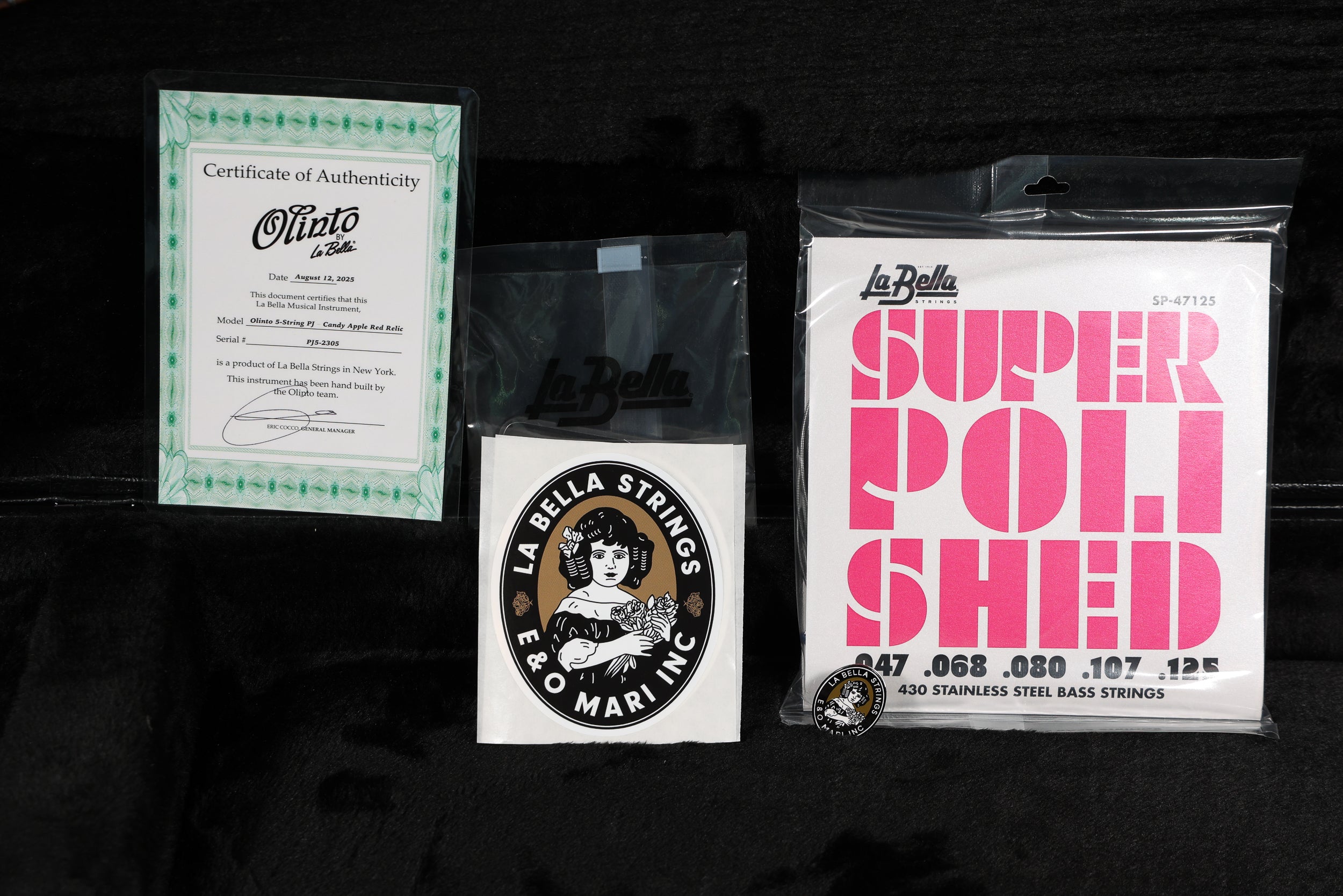 Brand new Olinto 5-String PJ in Candy Apple Red with a matching headstock. It has an alder body, with a maple neck and a dark Madagascar rosewood fingerboard. Aside from sounding amazing, this bass looks amazing, too; the Candy Red finish is spectacular! This bass is shipped in a Gator GWE-BASS hard case and comes with a certificate of authenticity, a set of La Bella Super Polished strings, a La Bella sticker & pin badge and an Allen wrench.