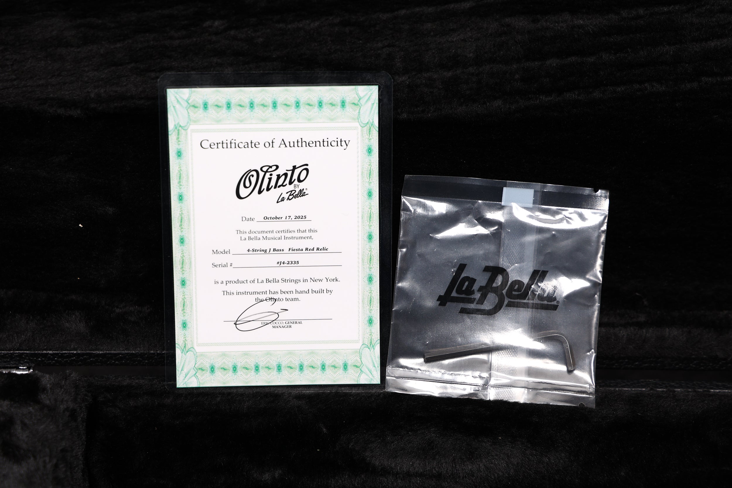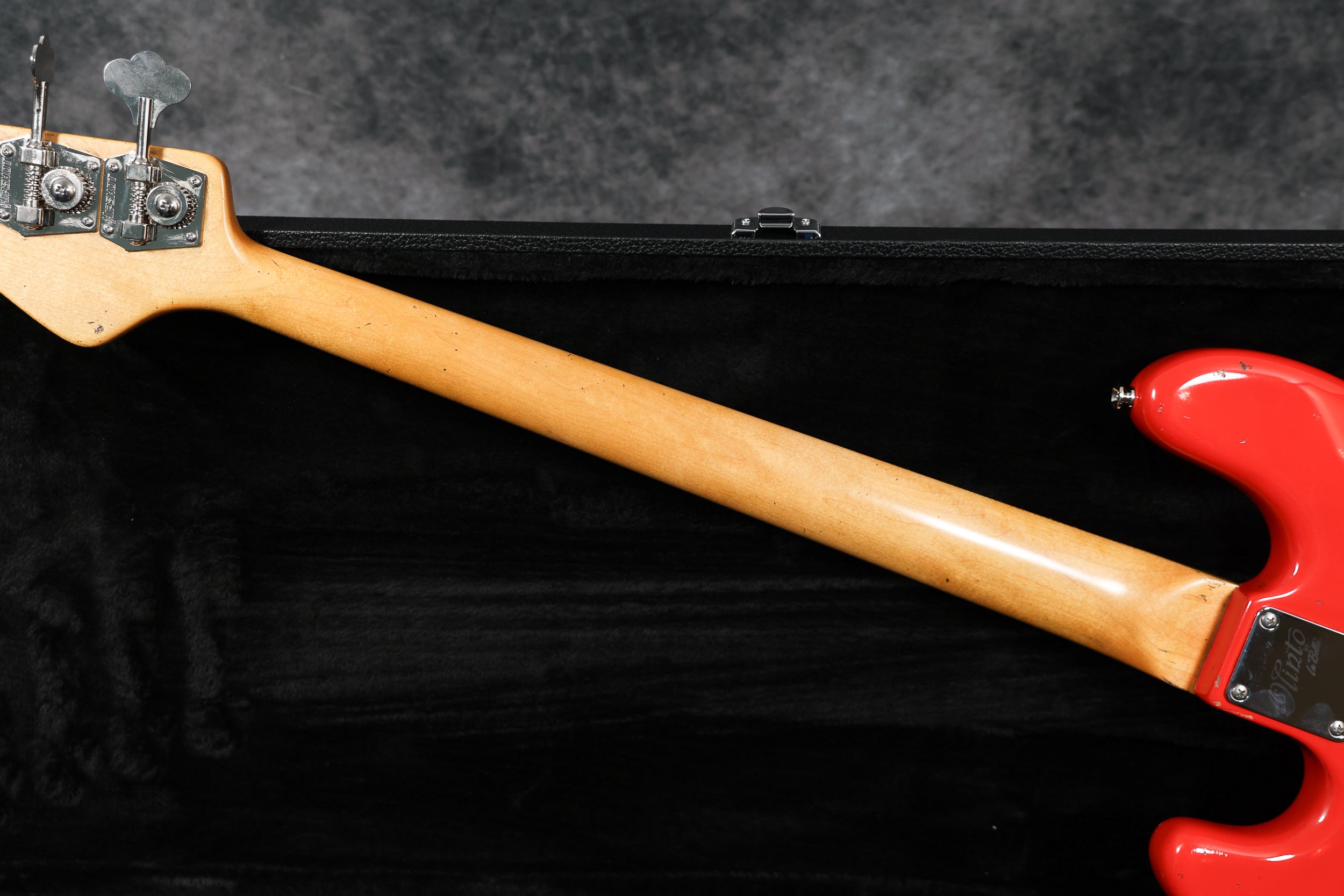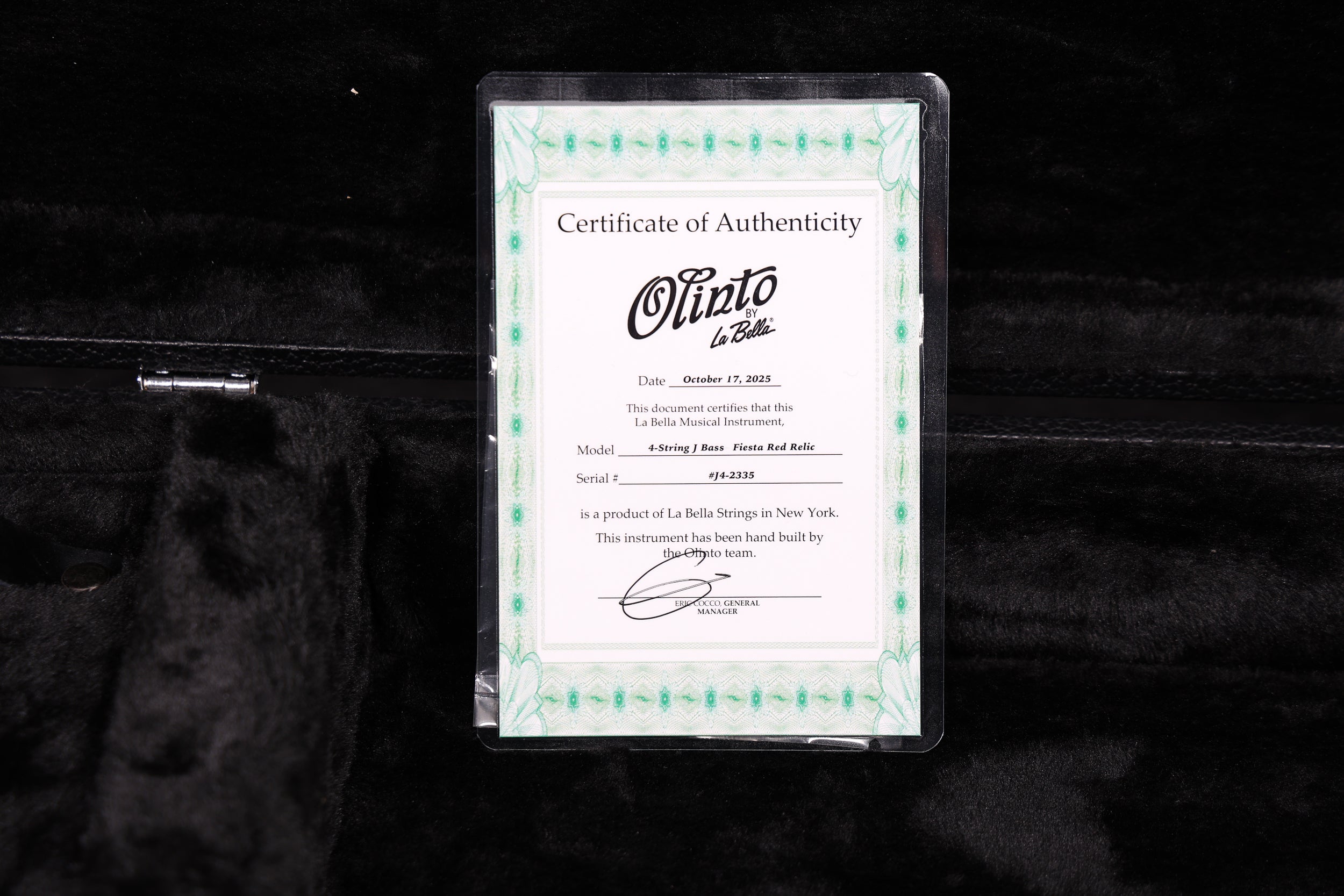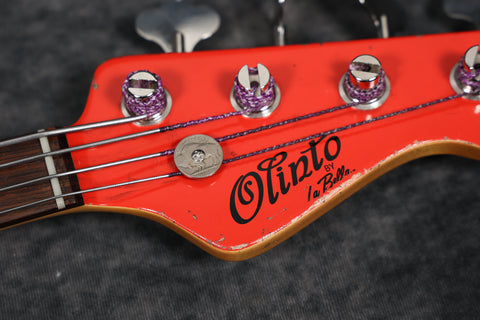 Brand new Olinto 4-String J in Fiesta Red relic with a matching headstock. It has a 2-piece ash body, with a maple neck and an Indian Rosewood fingerboard. It's a beautiful bass to play and can be set up with really low action. This is a top-quality, US-made and vintage-inspired instrument.