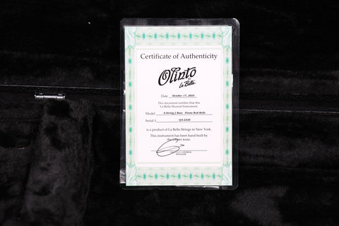This bass is shipped in a Gator GW-BASS hard case and comes with a certificate of authenticity and an Allen wrench. It's strung with Olinto OSF-4 flatwound strings.