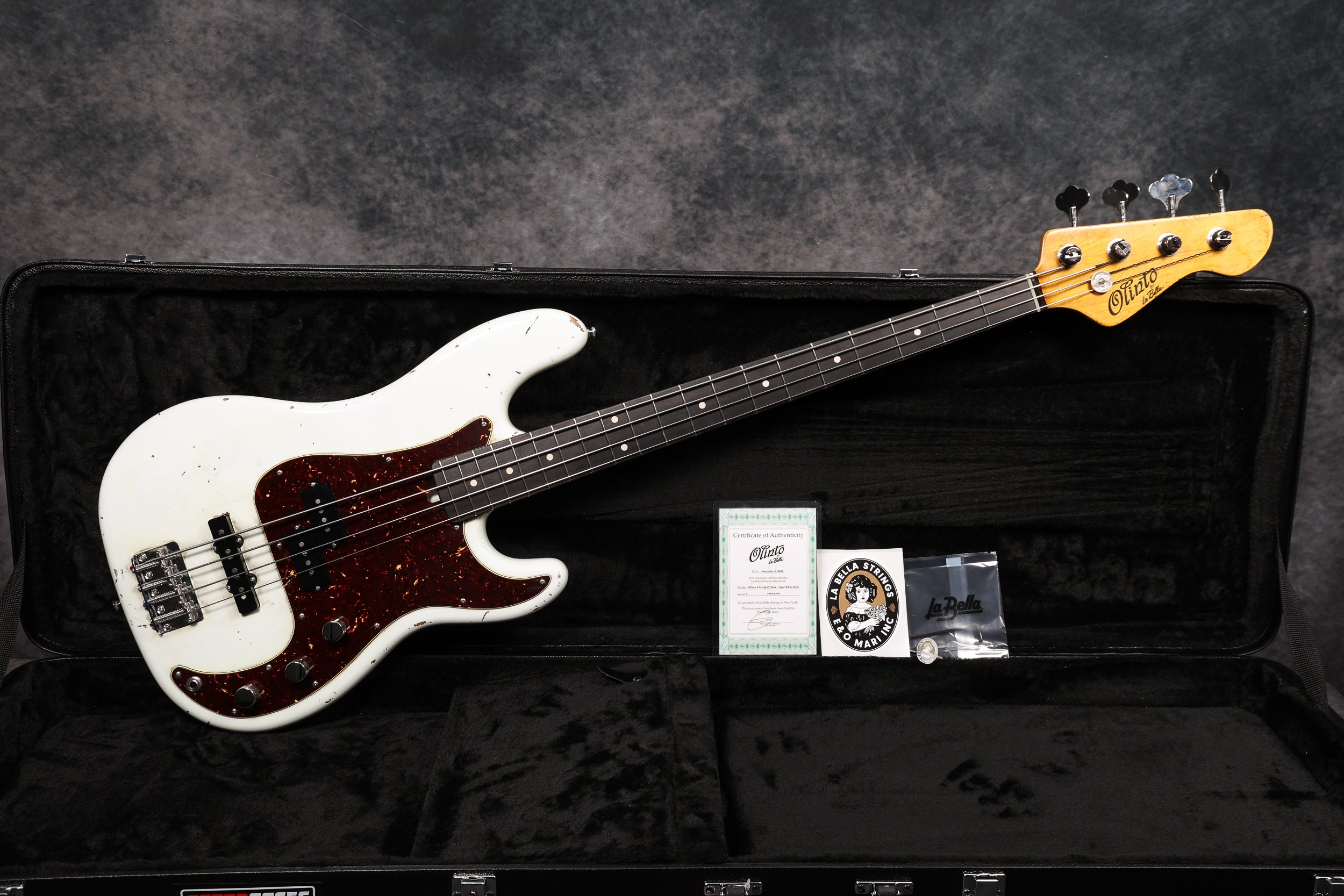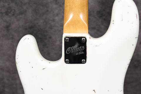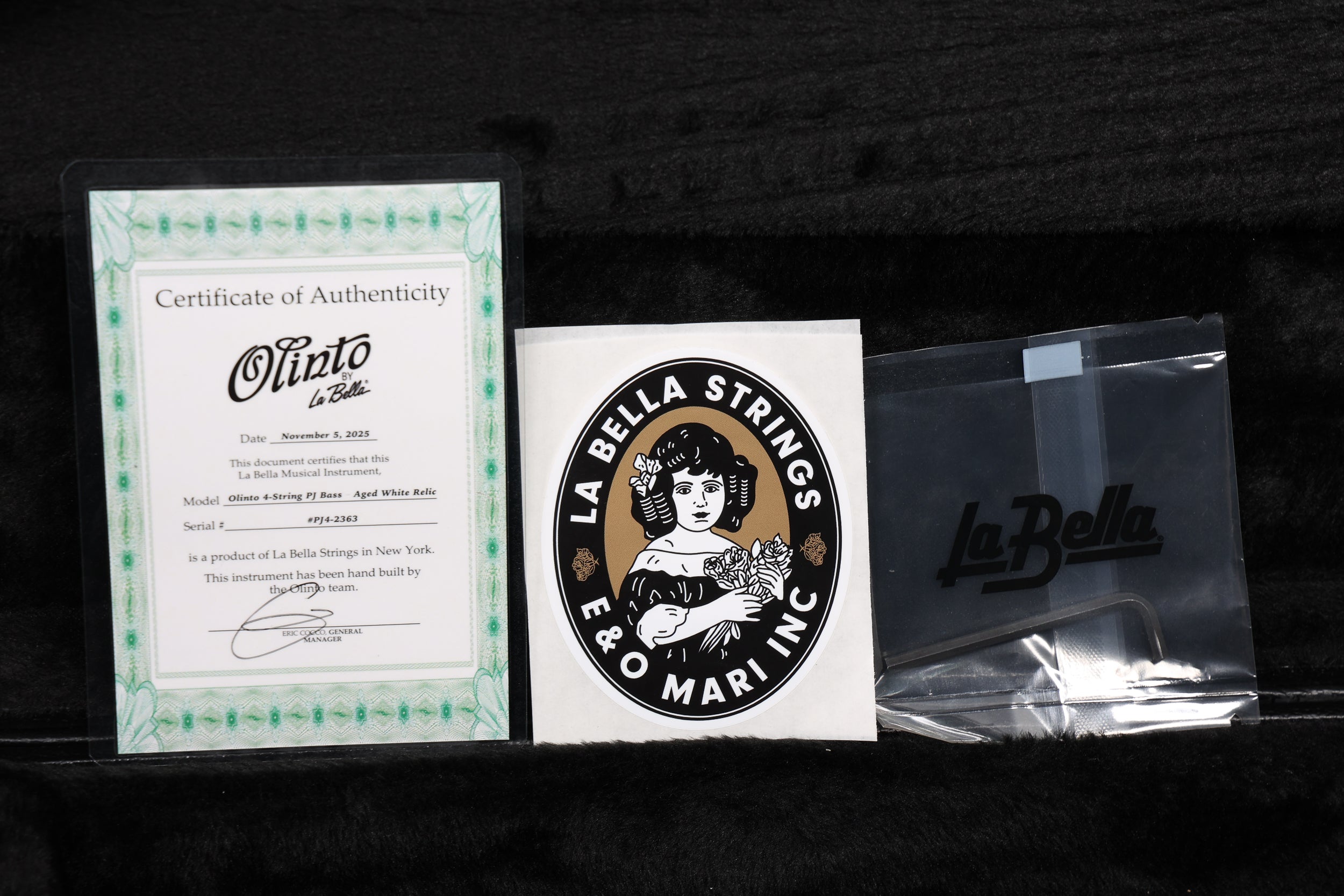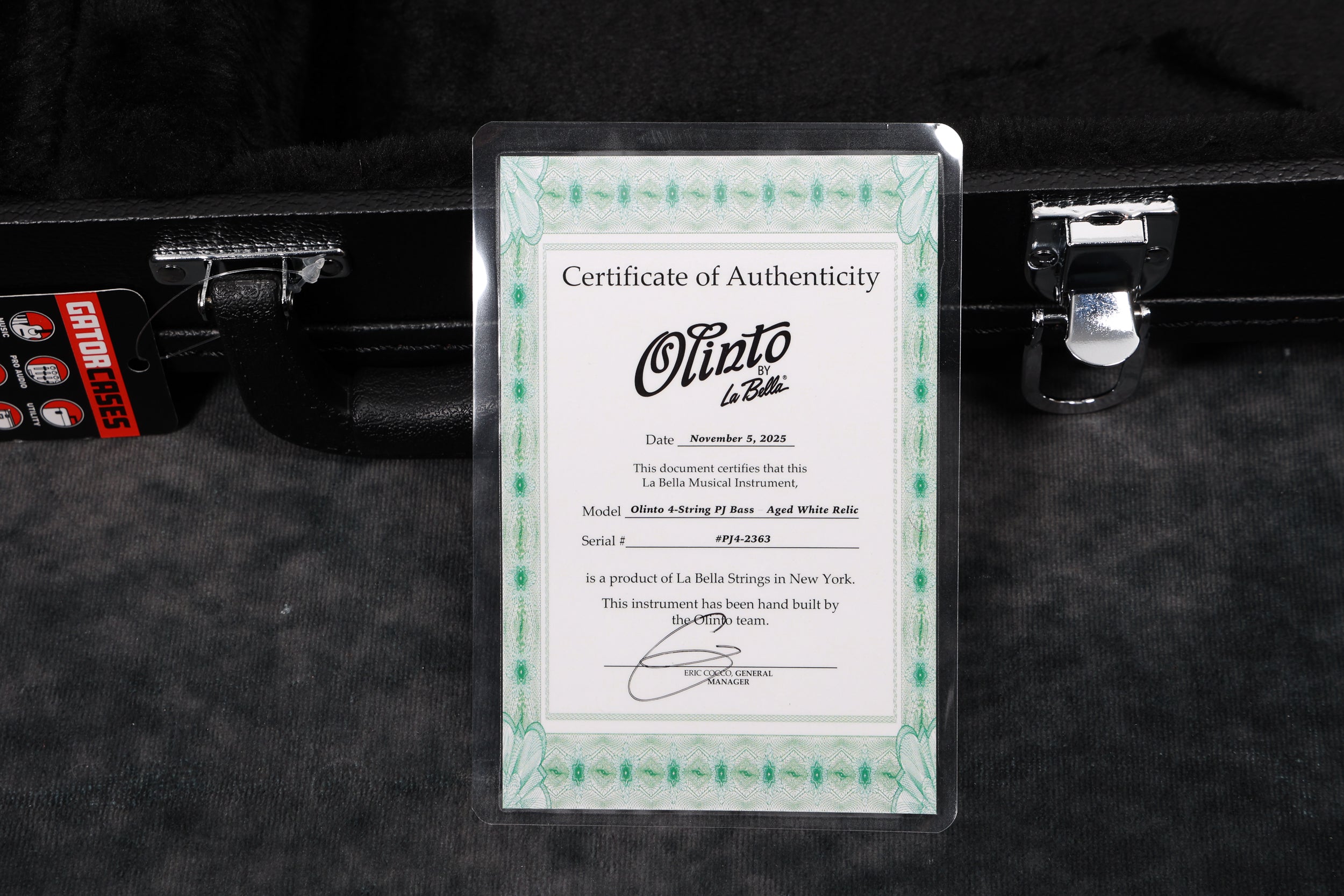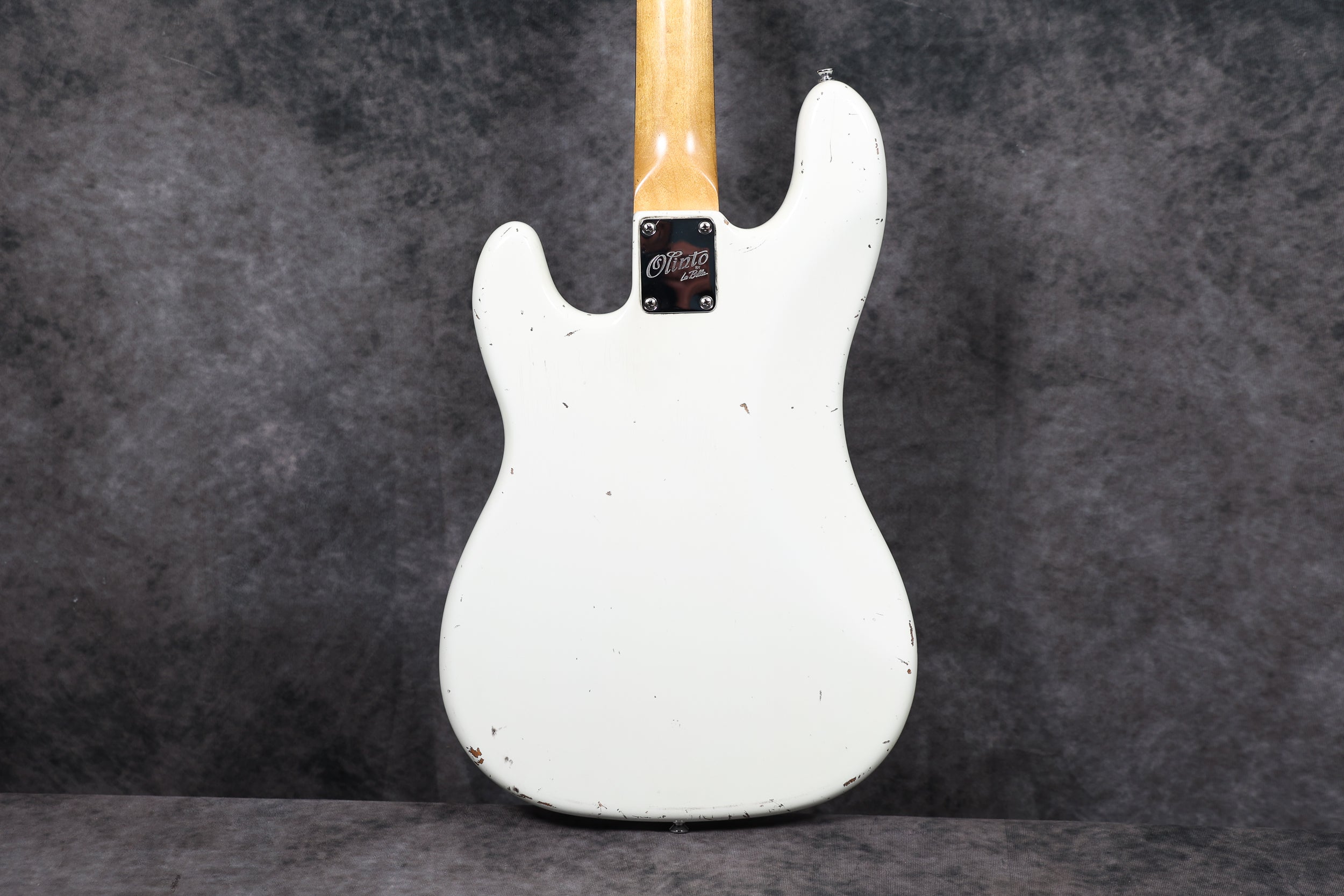 Brand new Olinto 4-String PJ - Aged Olympic White relic. It has a 2-piece alder body, with a maple neck and an ebony fingerboard. This is a great sounding and feeling bass, and that finish looks great! This bass is shipped in a Gator GWE-BASS hard case and comes with a certificate of authenticity, a La Bella sticker, a pin badge and an Allen wrench.
