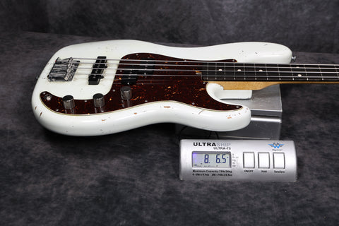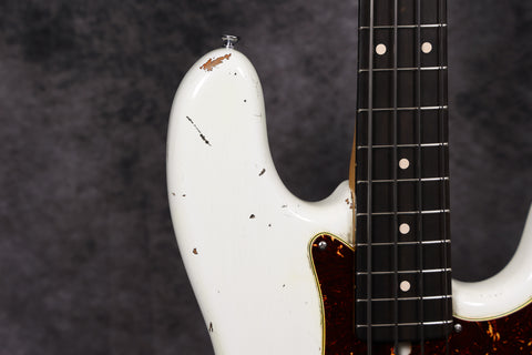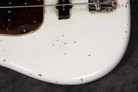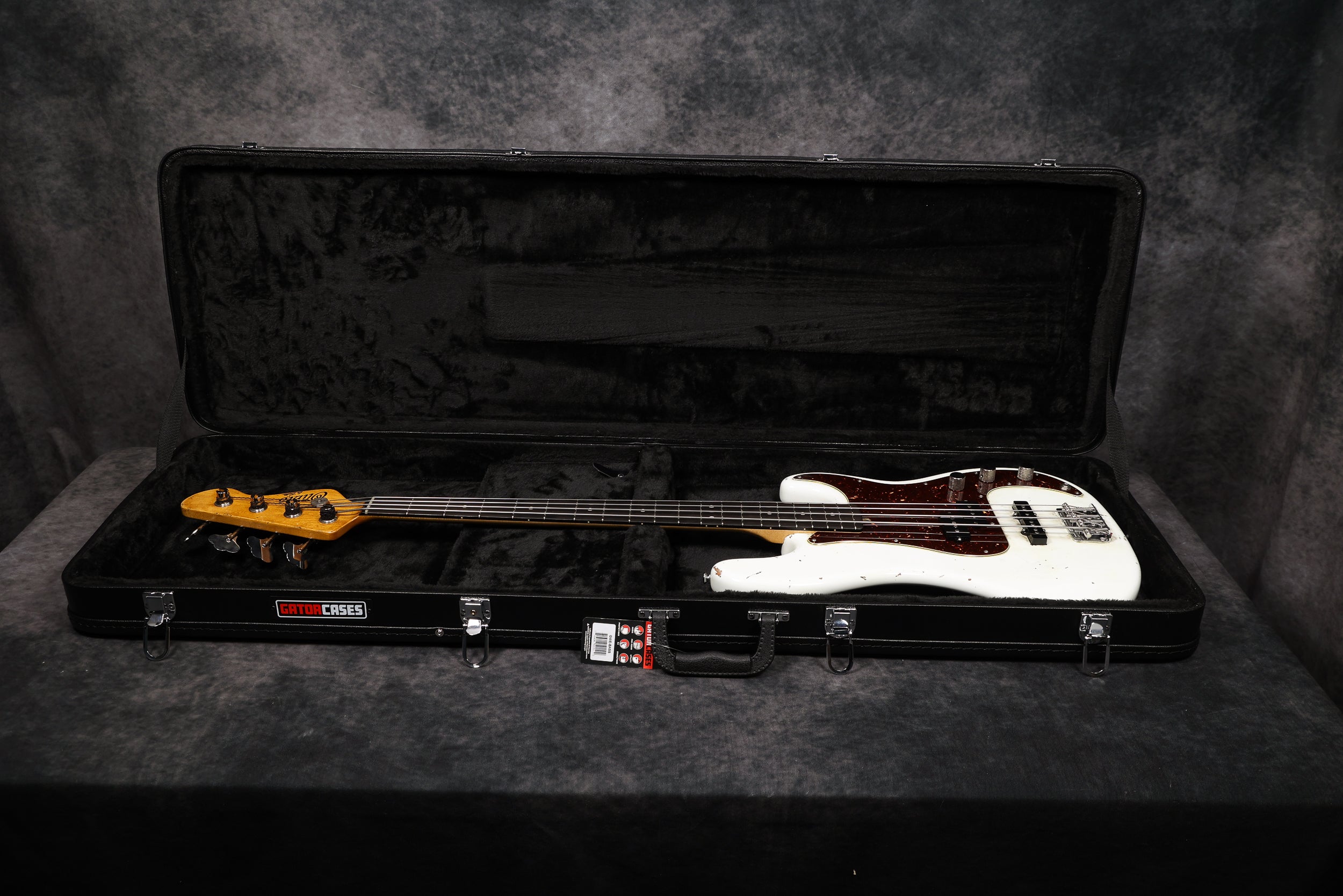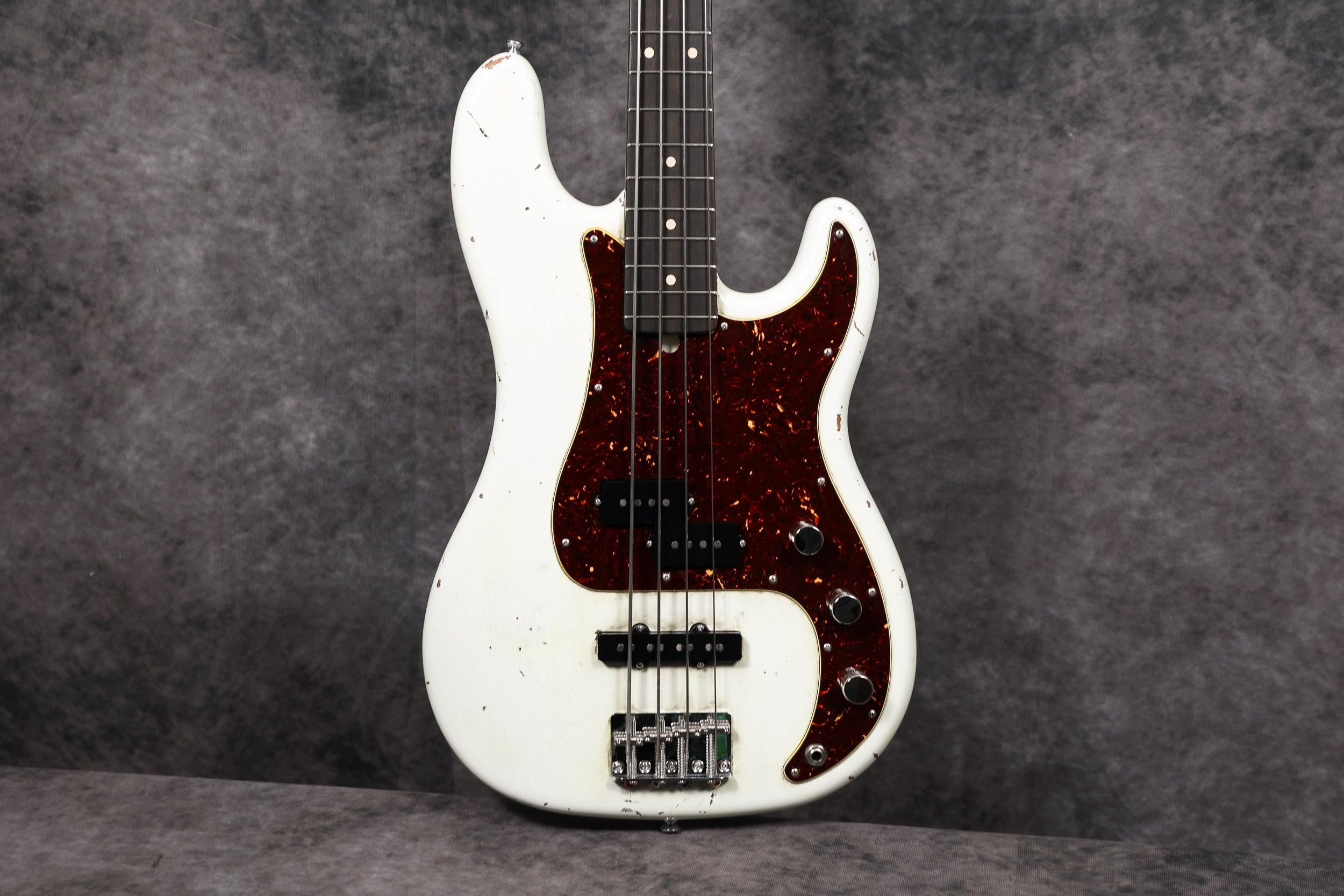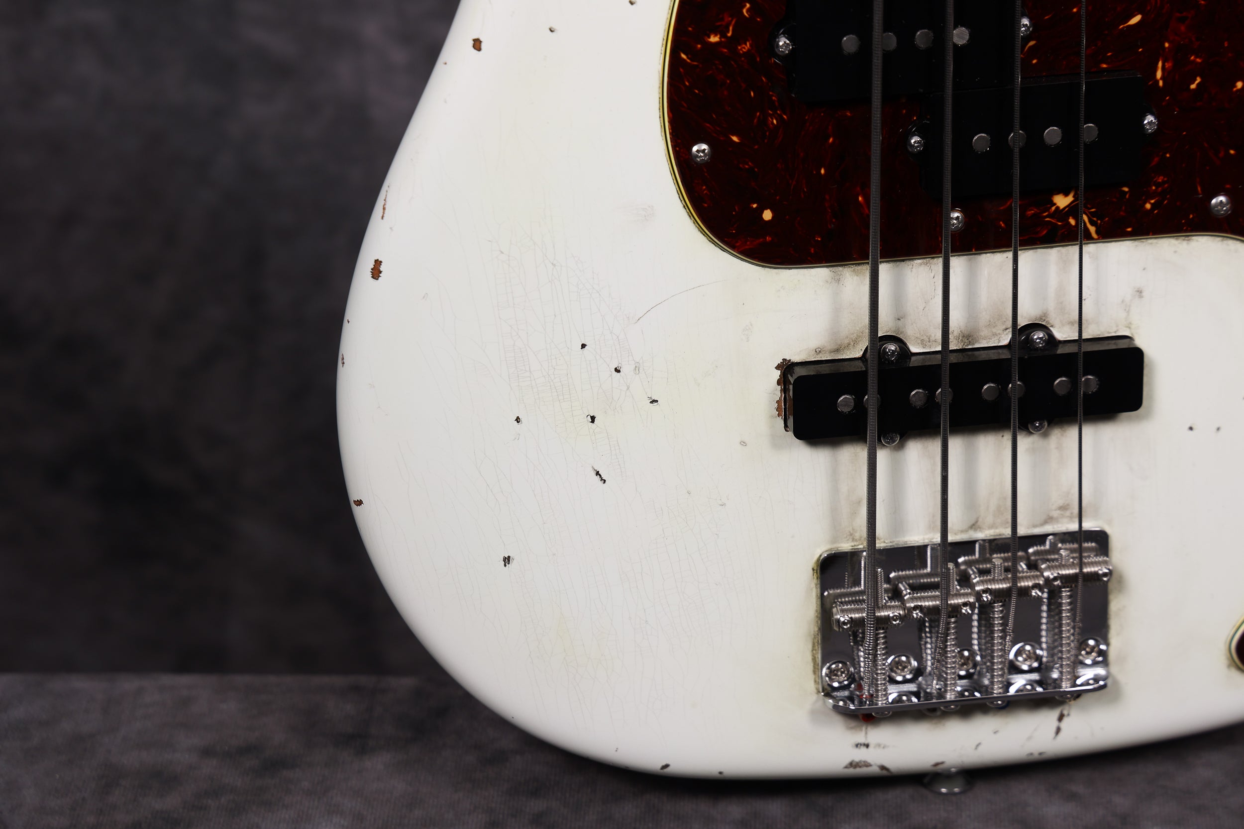 Brand new Olinto 4-String PJ - Aged Olympic White relic. It has a 2-piece alder body, with a maple neck and an ebony fingerboard. This is a great sounding and feeling bass, and that finish looks great! This bass is shipped in a Gator GWE-BASS hard case and comes with a certificate of authenticity, a La Bella sticker, a pin badge and an Allen wrench.