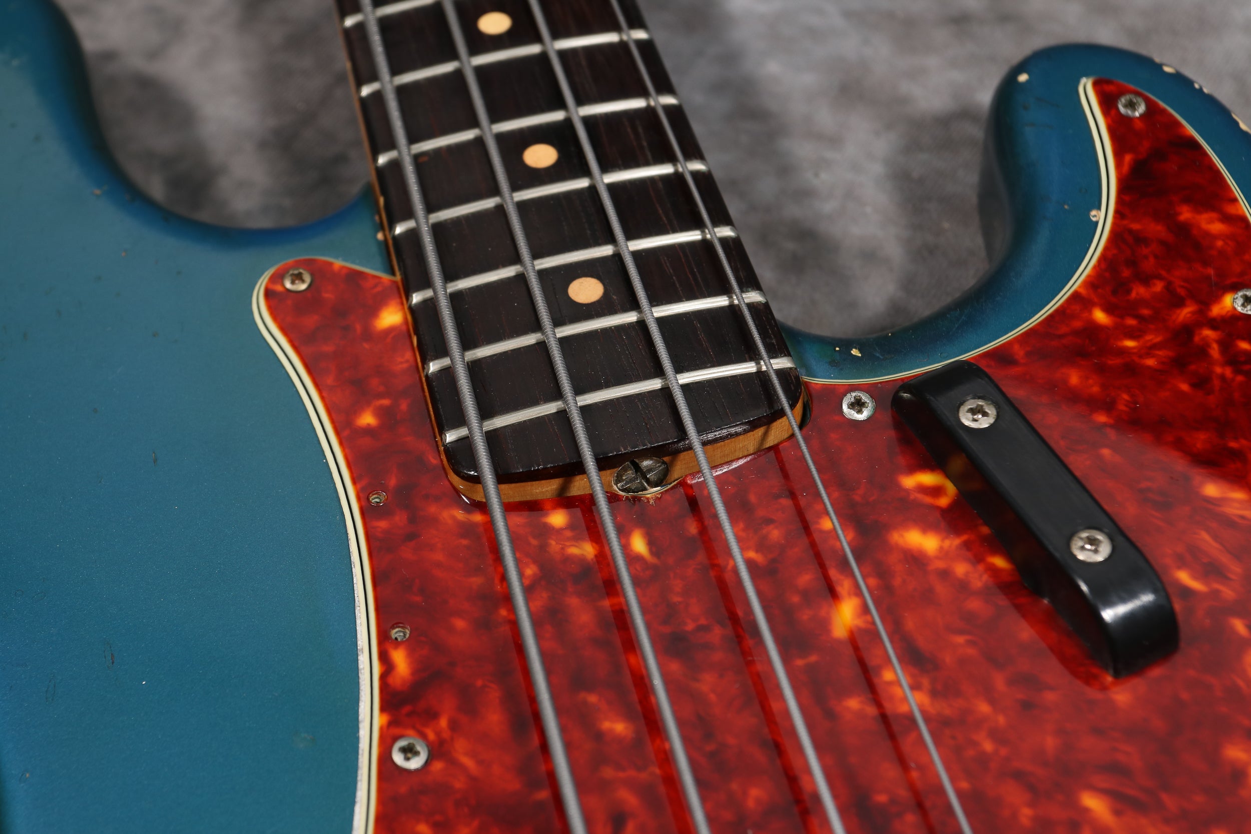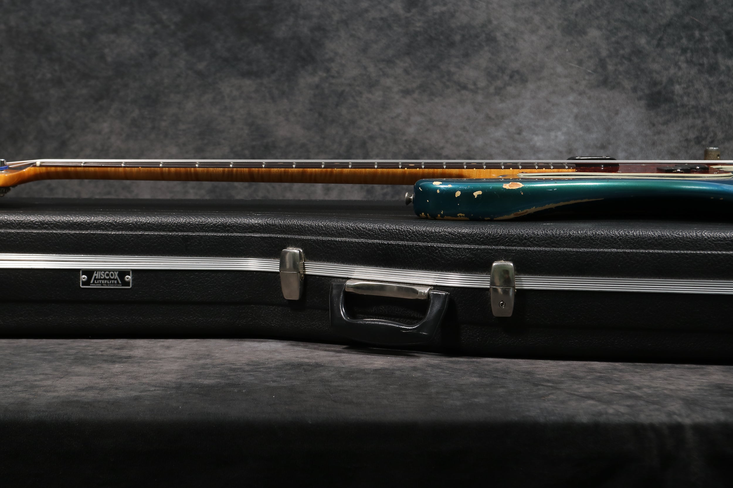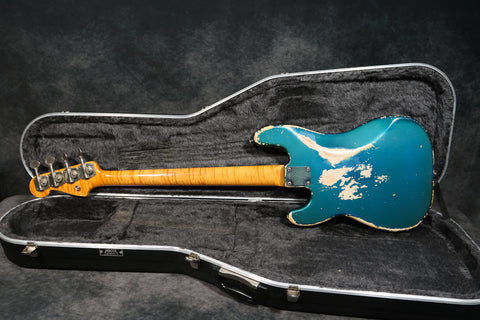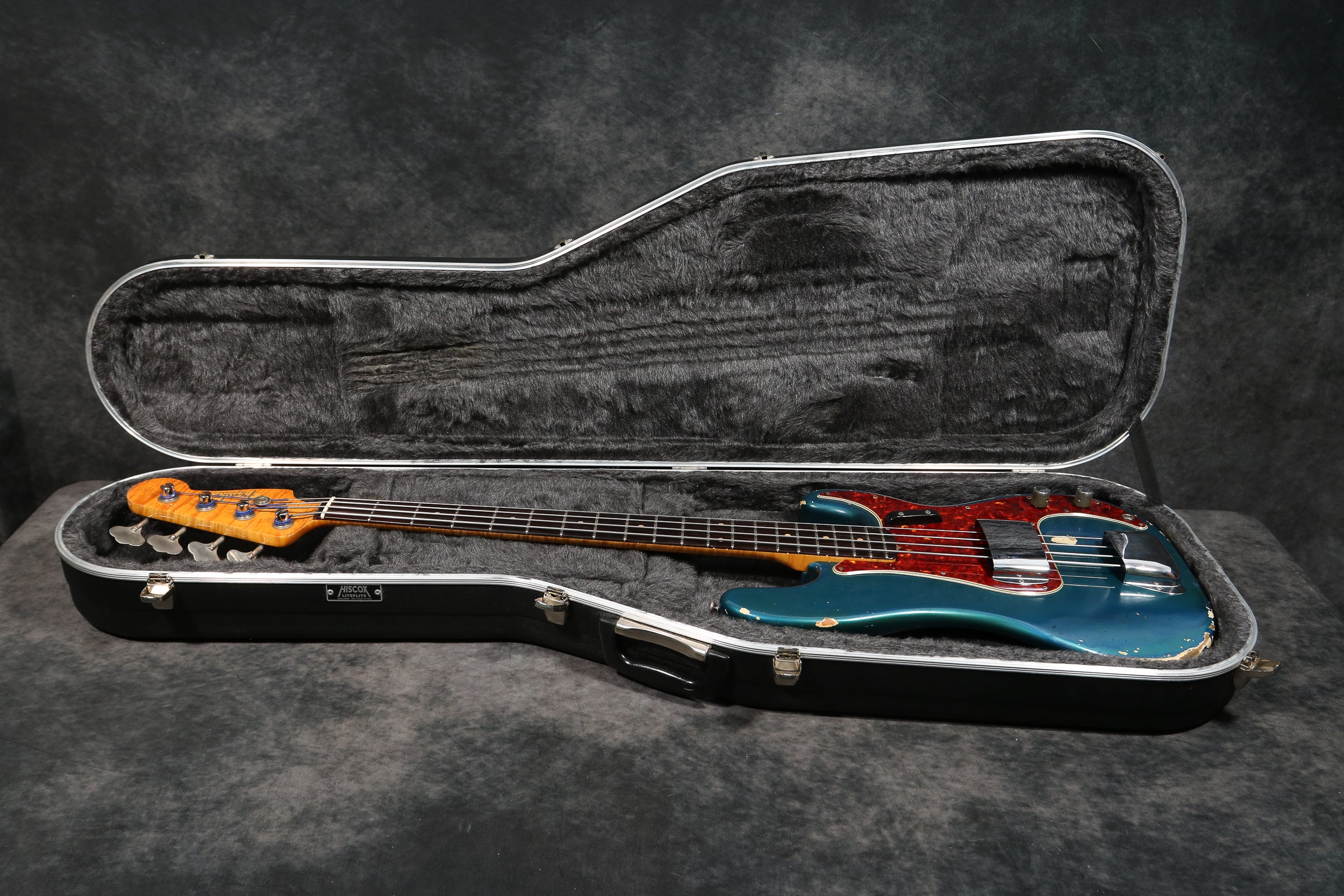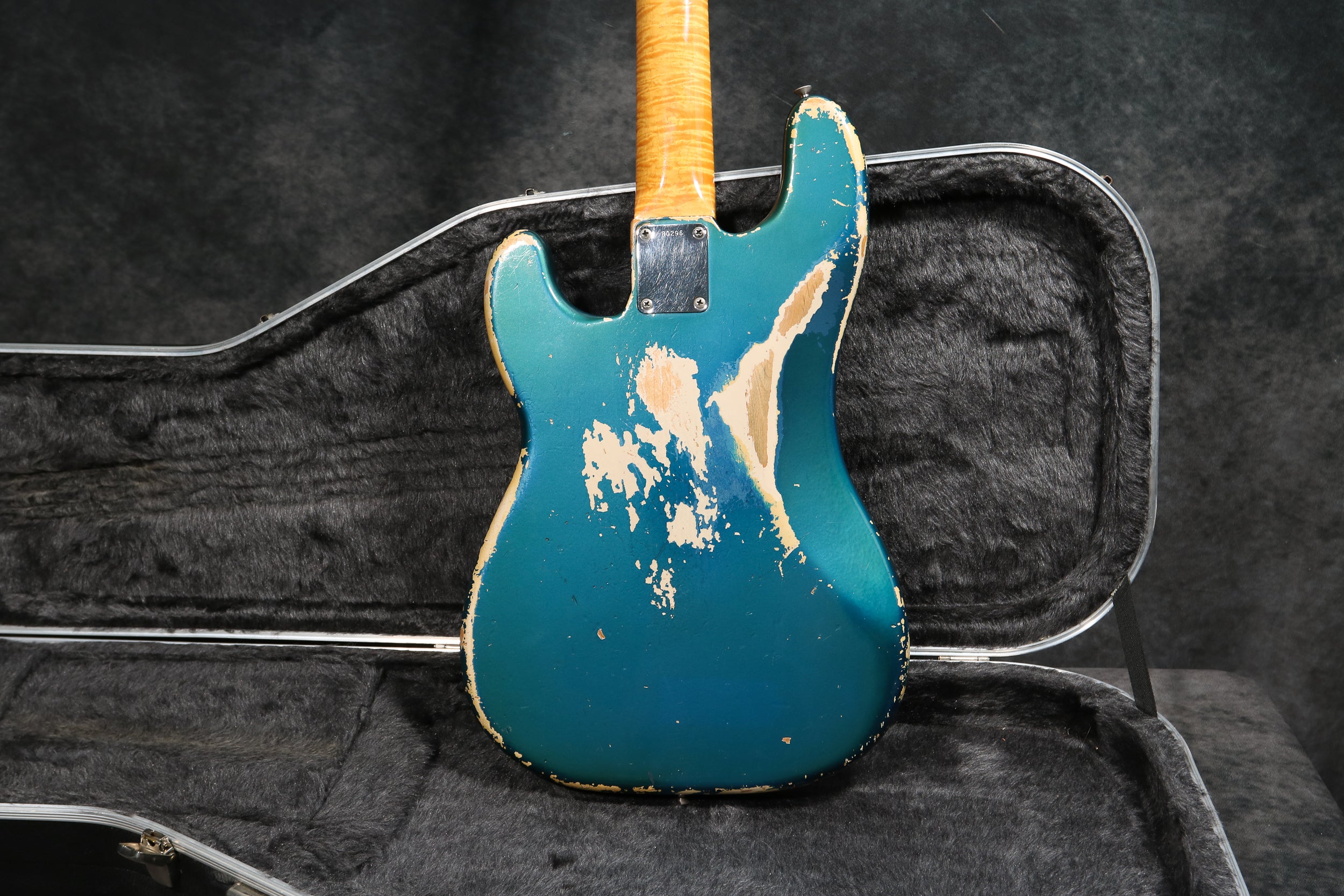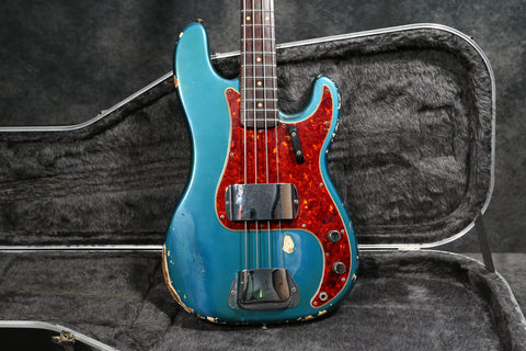 1962 Fender Precision Bass with a Lake Placid Blue Refinish. It has a beautiful flamed maple neck and headstock which have also been refinished. It has a wide C profile neck, a beautiful dark rosewood fingerboard with a 7.25" radius and clay dots. It weighs 9 lbs 4.5 oz / 4.21 kg. Serial:80296. Supplied in a Hiscox hard case.