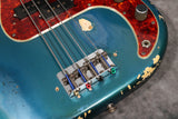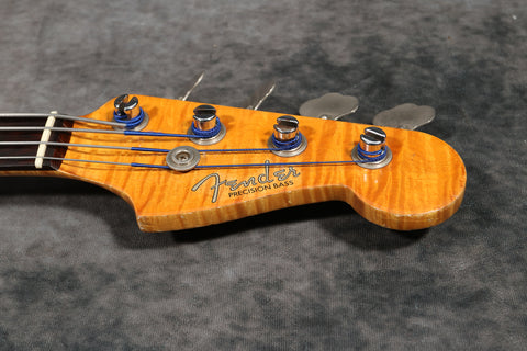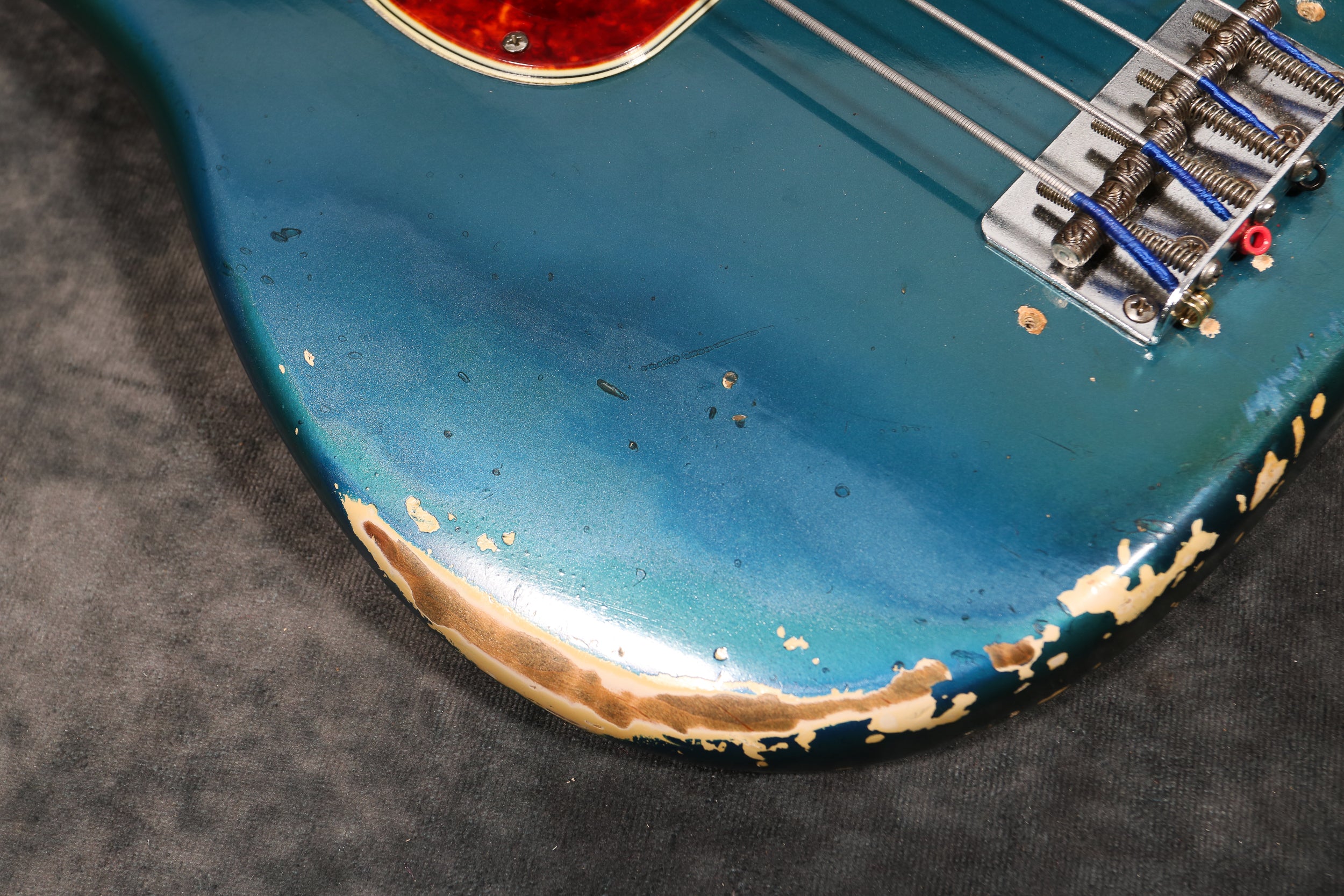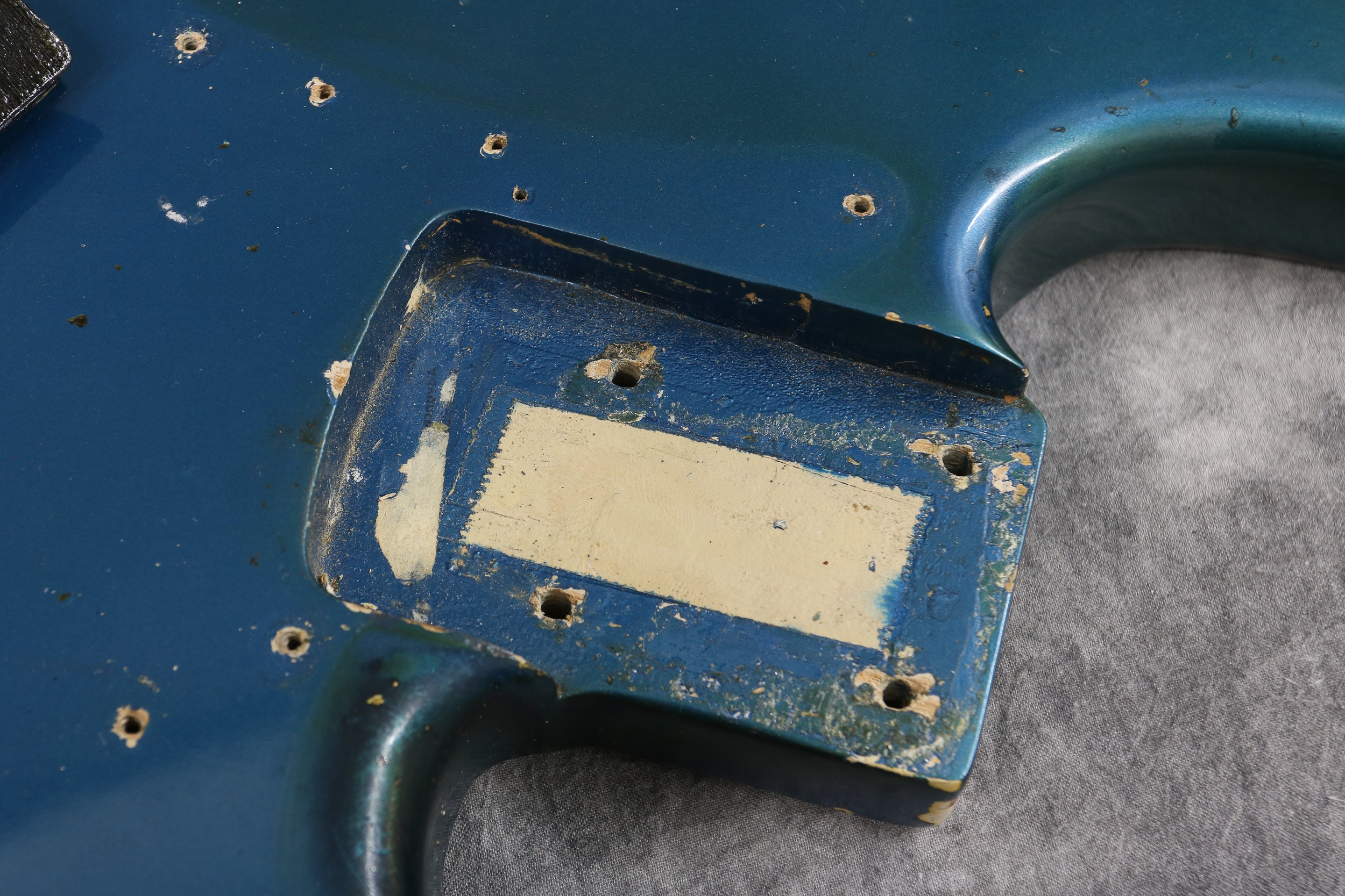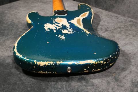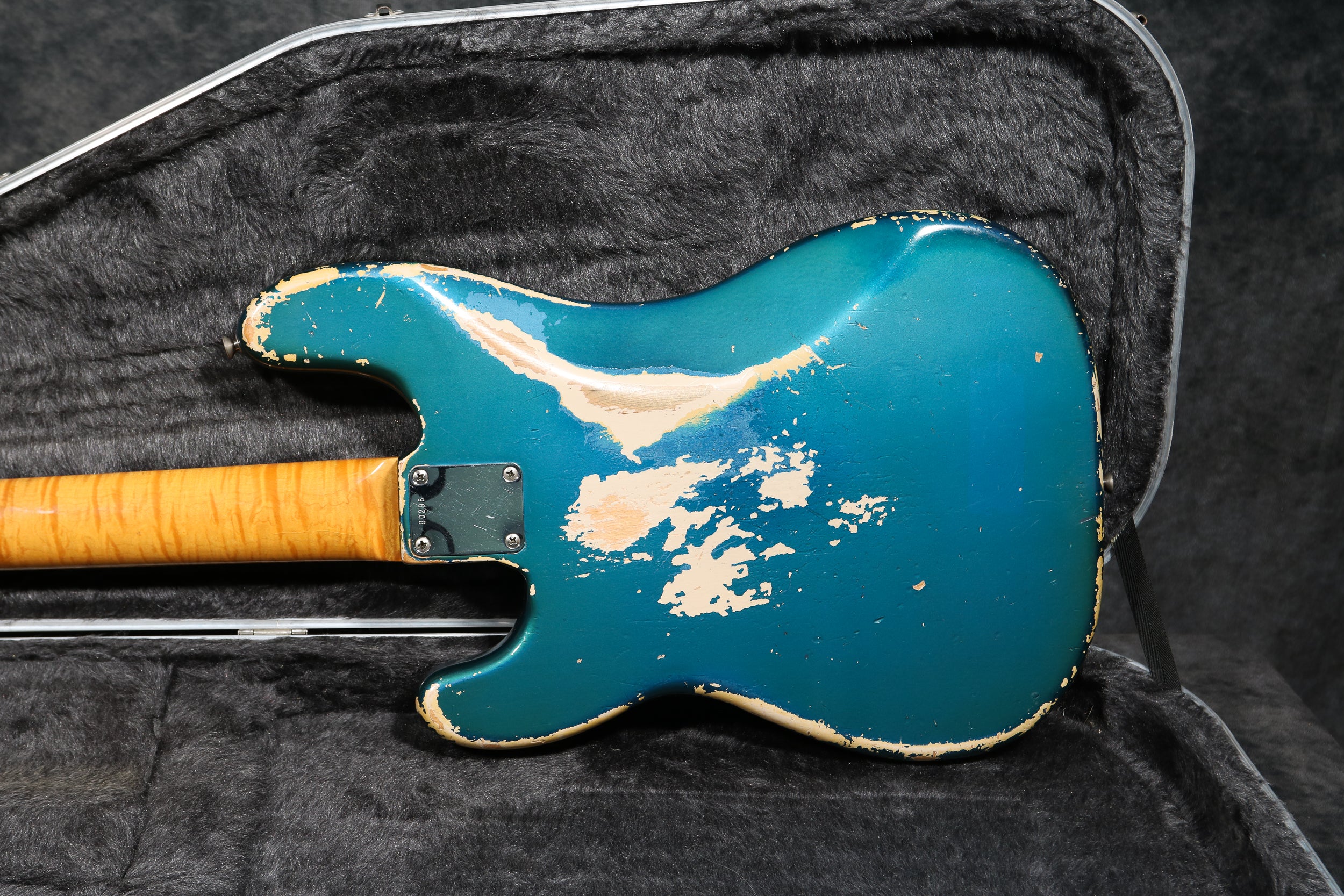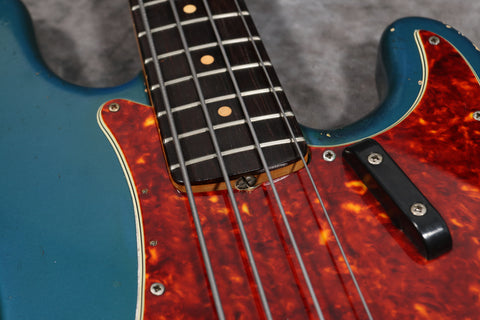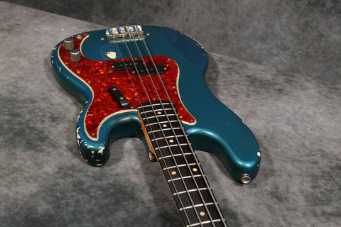 1962 Fender Precision Bass with a Lake Placid Blue Refinish. It has a beautiful flamed maple neck and headstock which have also been refinished. It has a wide C profile neck, a beautiful dark rosewood fingerboard with a 7.25" radius and clay dots. It weighs 9 lbs 4.5 oz / 4.21 kg. Serial:80296. Supplied in a Hiscox hard case.