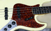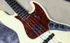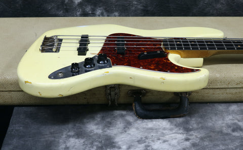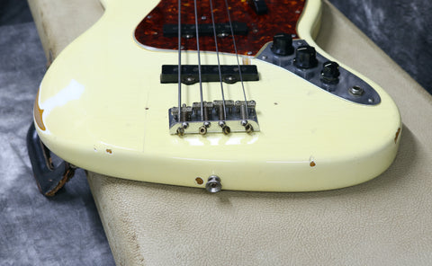 1964 Fender Jazz Bass, olympic white, body only refinish. Rosewood fingerboard with clay dots and a tortoise guard. As well as the body being refinished, the tuners have been replaced with vintage reissues and the fingerboard has been re-fretted. It comes with the original cream coloured case.