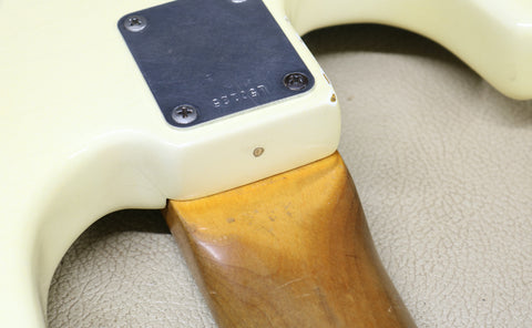 The body finish displays some play wear and a few chips and dings, mainly around the edges. There seems to have been a screw hole filled in on the top edge of the heel, perhaps from an added strap button? It has a fantastic neck which has lost most of its finish and is therefore very smooth in the hand. The headstock has many scuffs and dings around the edges with one significant chunk missing as can be seen in the pictures.