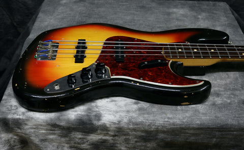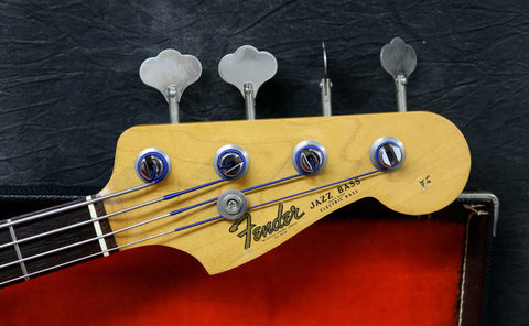 1964 Fender Jazz Bass with the original Sunburst finish. Rosewood fingerboard with clay dots and a Tortoiseshell guard. All Original with the exception of a re-fret and the metal neck pickup cover. Original case included. The re-fret has been done exceptionally well with no disturbance to the rosewood fingerboard.