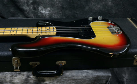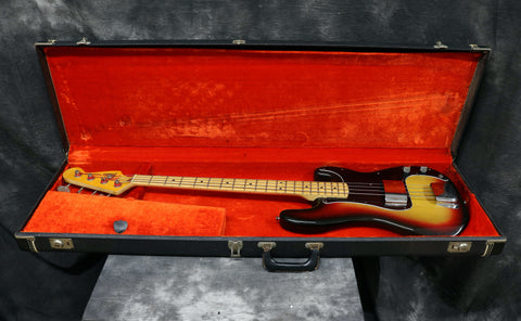1976 Fender Precision Bass, in very good condition with a Sunburst finish over an Alder body. It's nice and light weighing 8 lbs 9.5 oz. The covers are newer replacements and theres a couple of extra grounding wires and some touched up solder on the pots harness. It's also missing the thumb rest. Other than that this bass is all original and complete including the case.
