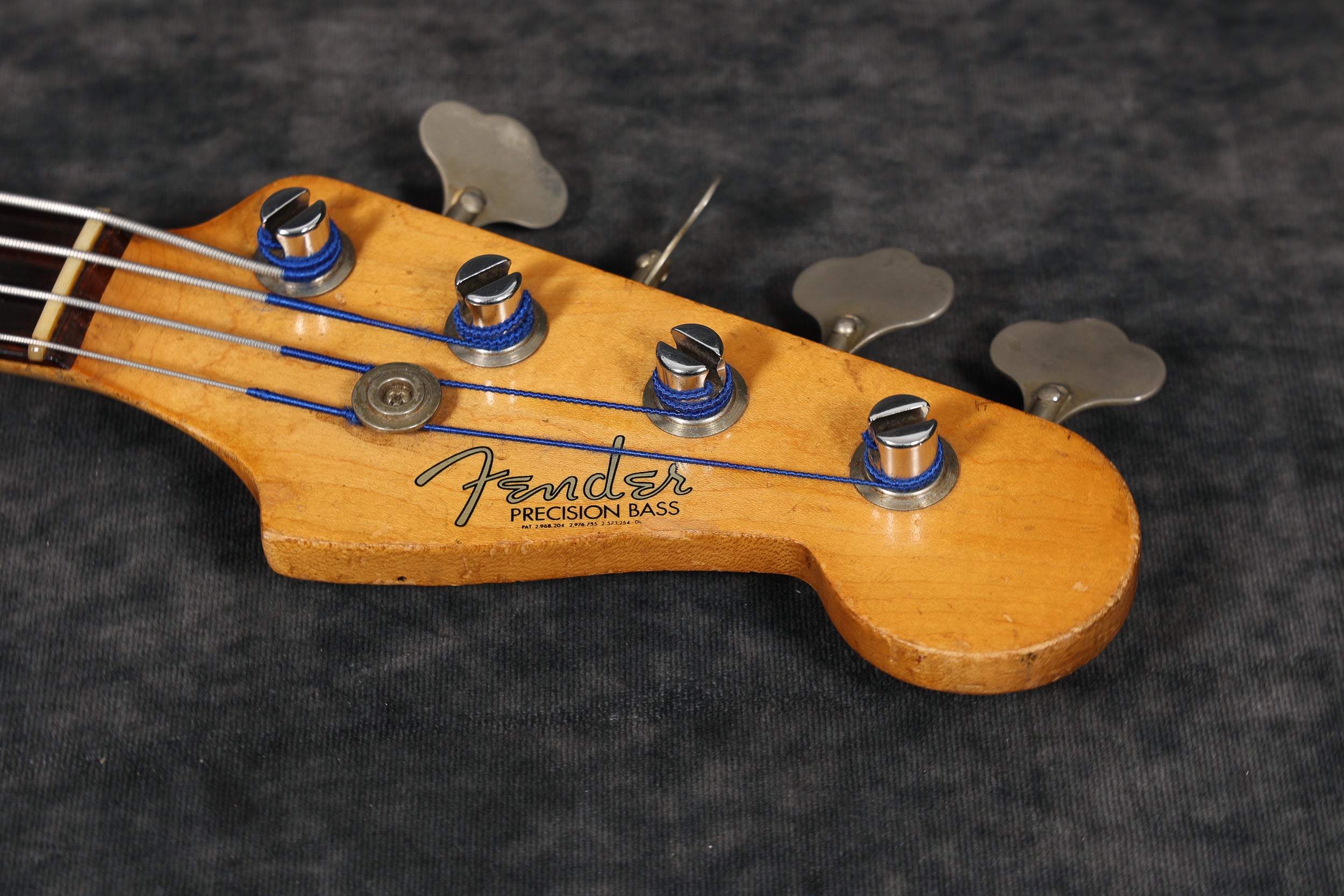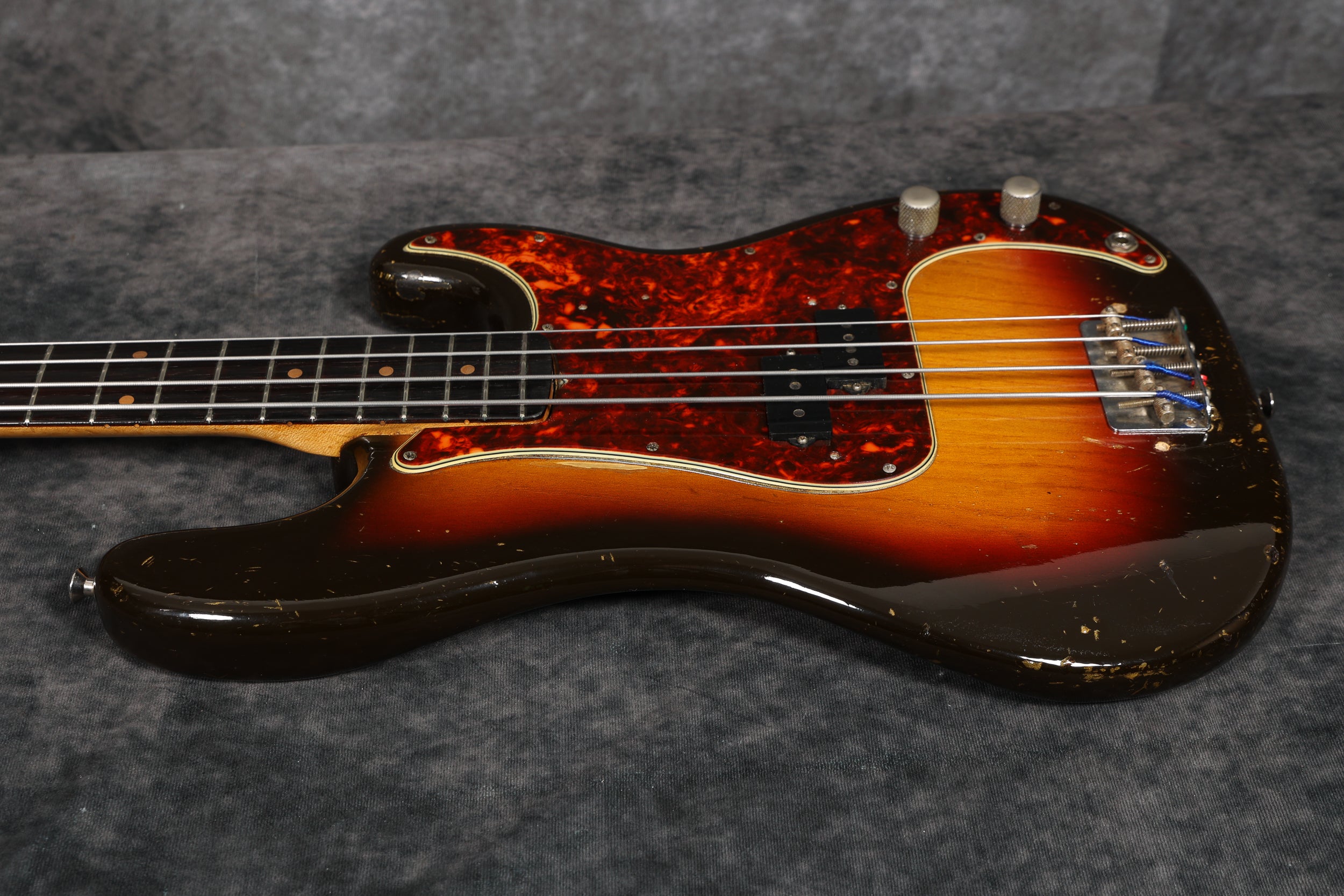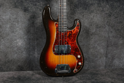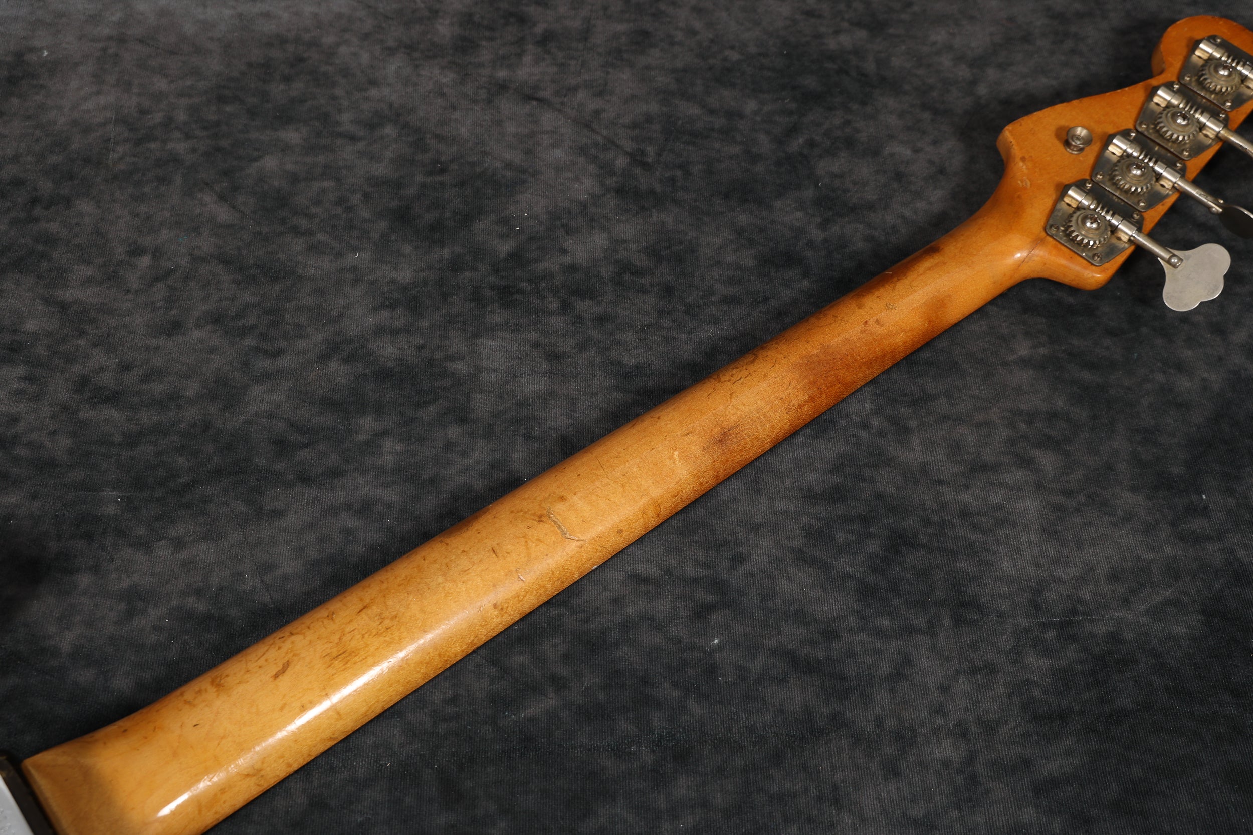 One-owner 1962 Fender Precision Bass with a Sunburst Refinish in good condition. The back of the neck has been oversprayed with a clear coat. It has a tortoise-shell guard and a rosewood fingerboard with clay dots. The bass plays very well with an even sound right across the fretboard. There are several small nicks and dings in the finish, mainly around the edges of the body and headstock, as well as some wear on the back of the neck.