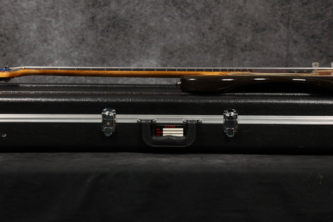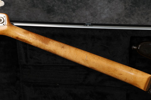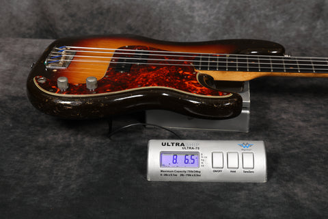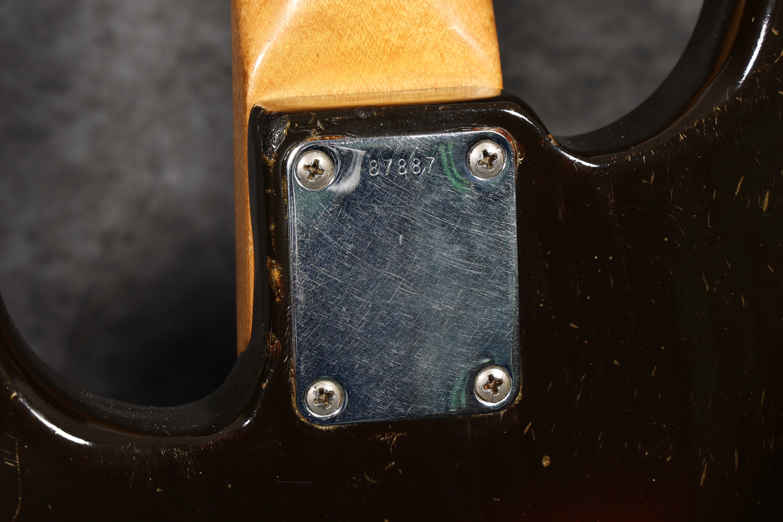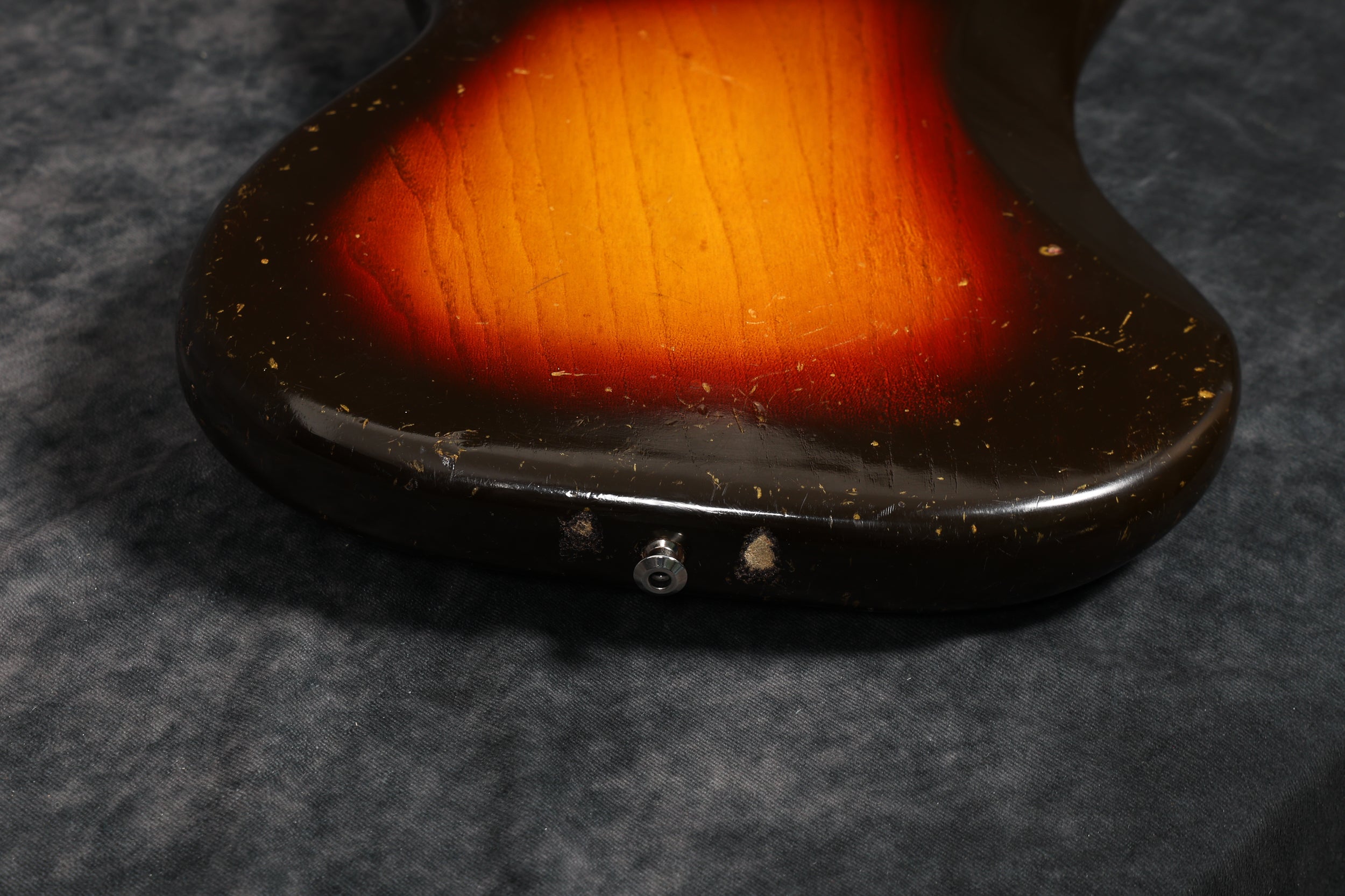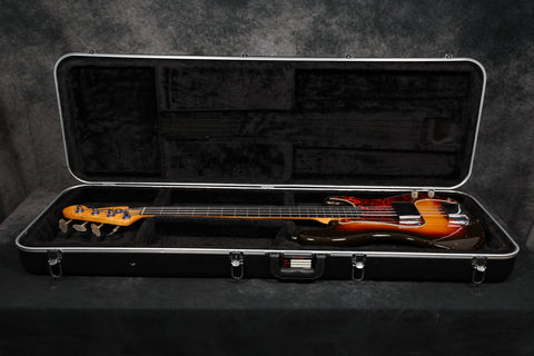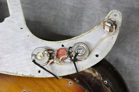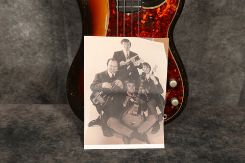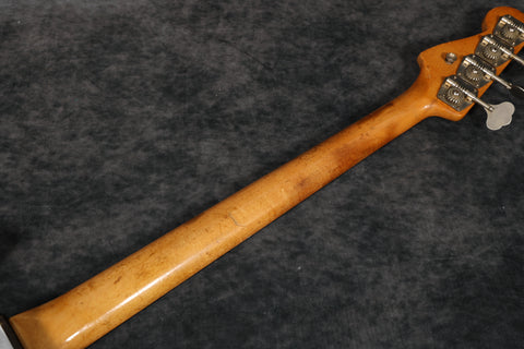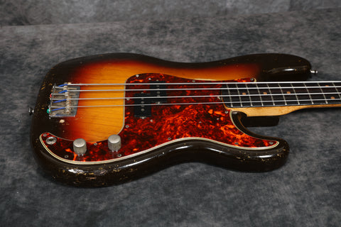 One-owner 1962 Fender Precision Bass with a Sunburst Refinish in good condition. The back of the neck has been oversprayed with a clear coat. It has a tortoise-shell guard and a rosewood fingerboard with clay dots. The bass plays very well with an even sound right across the fretboard. There are several small nicks and dings in the finish, mainly around the edges of the body and headstock, as well as some wear on the back of the neck.