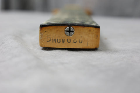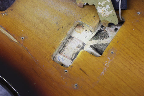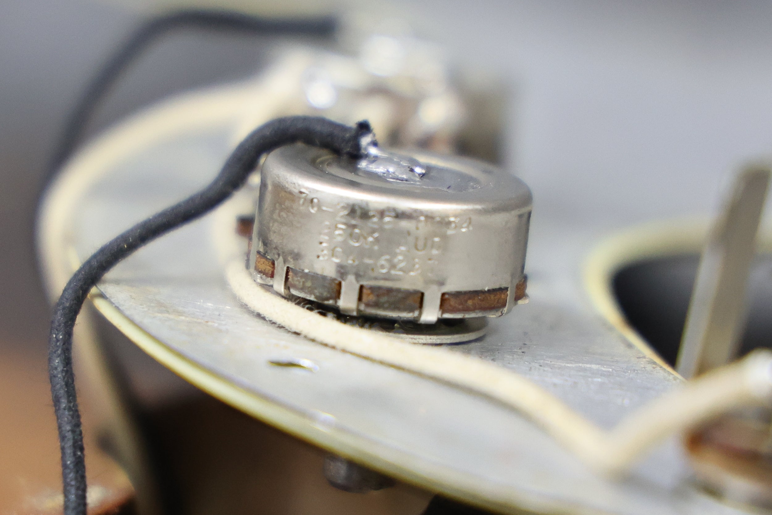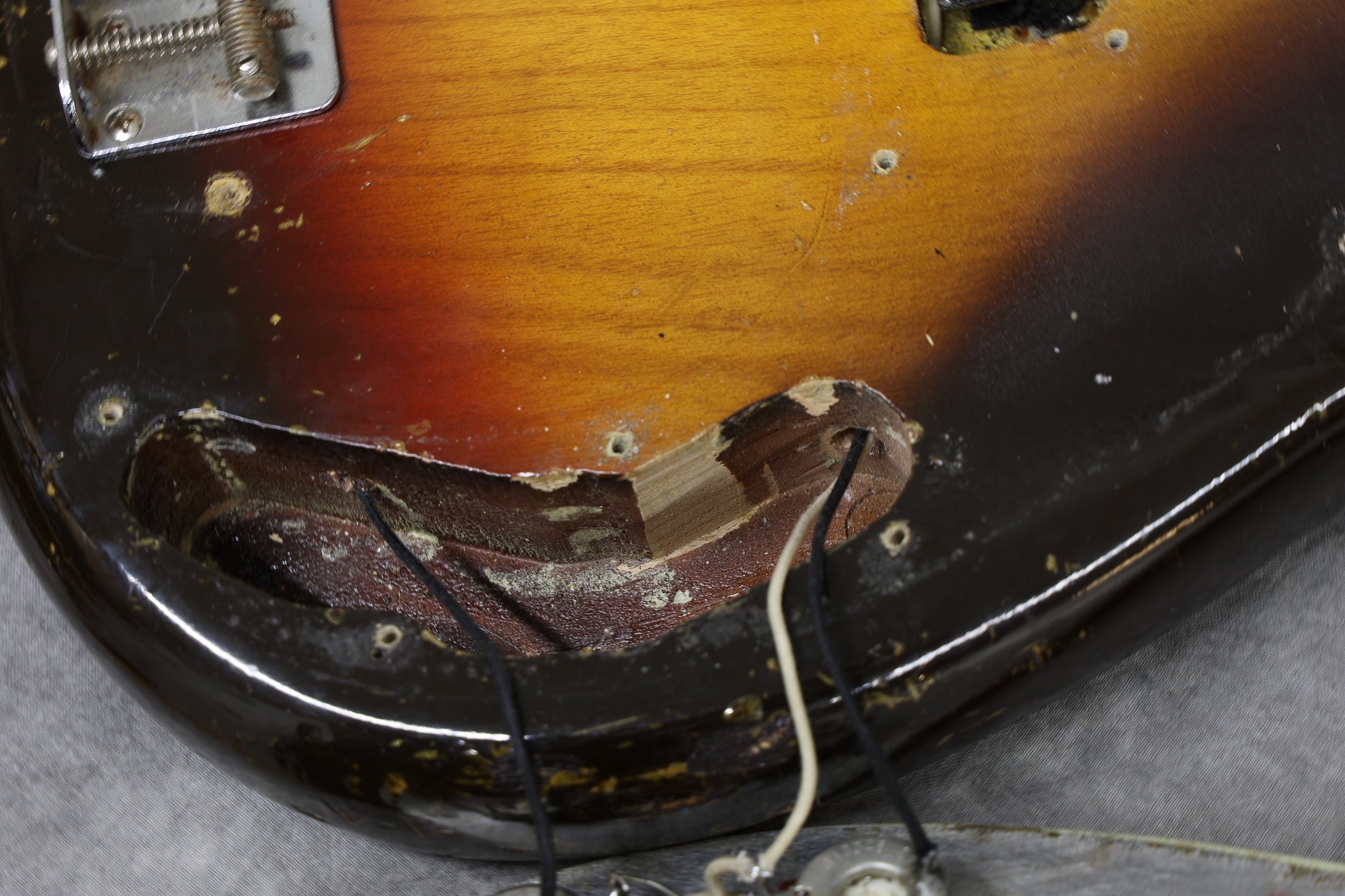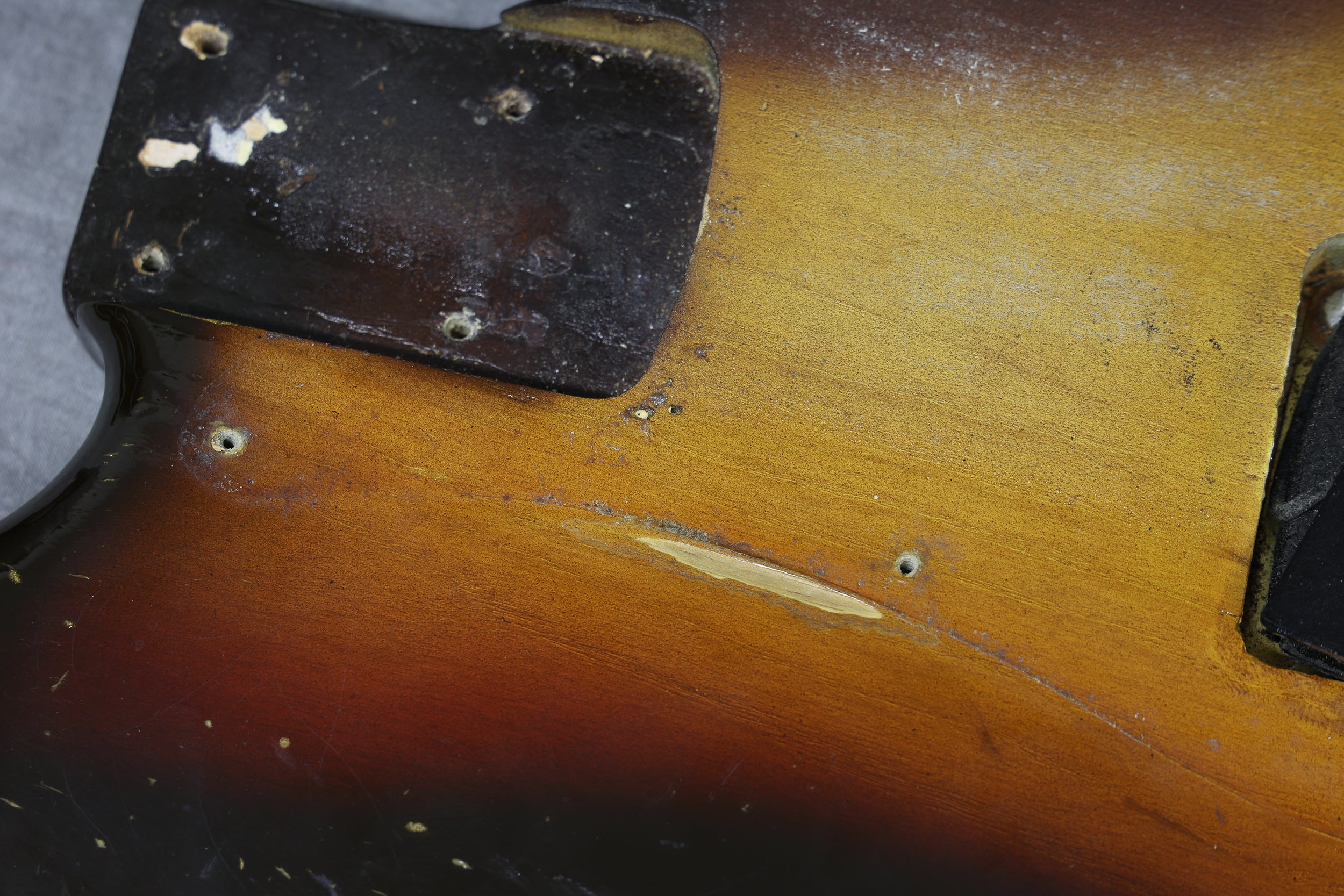 The changes/repairs: refinished body and back of neck, hairline surface cracks running from the tuner screw holes E, A & D. (see pictures) Volume pot replaced. New cloth wires. The control cavity has been ever so slightly enlarged at one end to accommodate a battery. (previously had EMG pickups fitted)