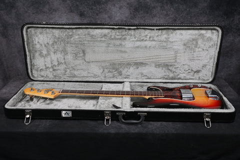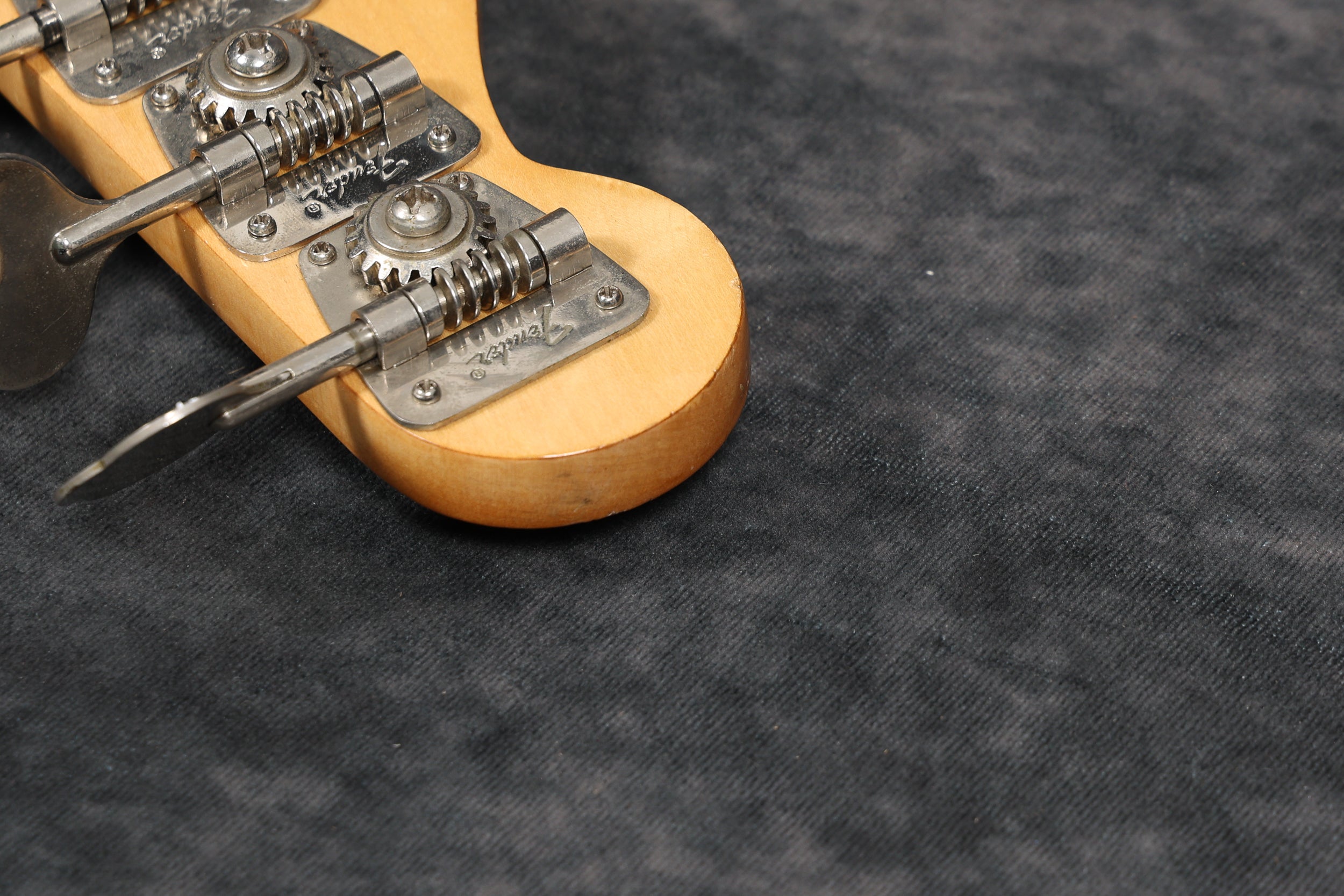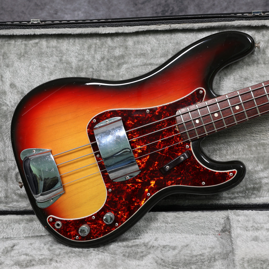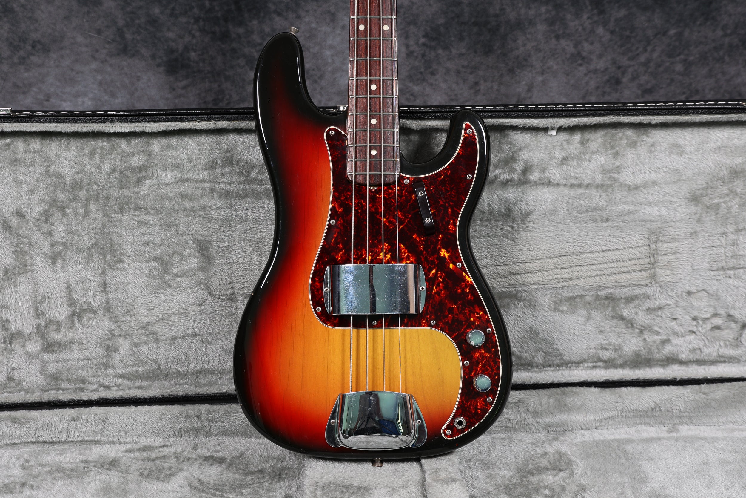 1972 Fender Precision Bass, with a Sunburst finish and tortoiseshell pickguard. Excellent + condition. It has a maple neck with a rosewood fingerboard. All stock and original except the solder on the volume pot and the case. It's nice and light, weighing 8 lbs 5 oz / 3.77 kg. The serial number of this bass indicates early 73, but all dated parts are from 1972.