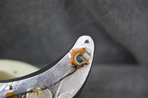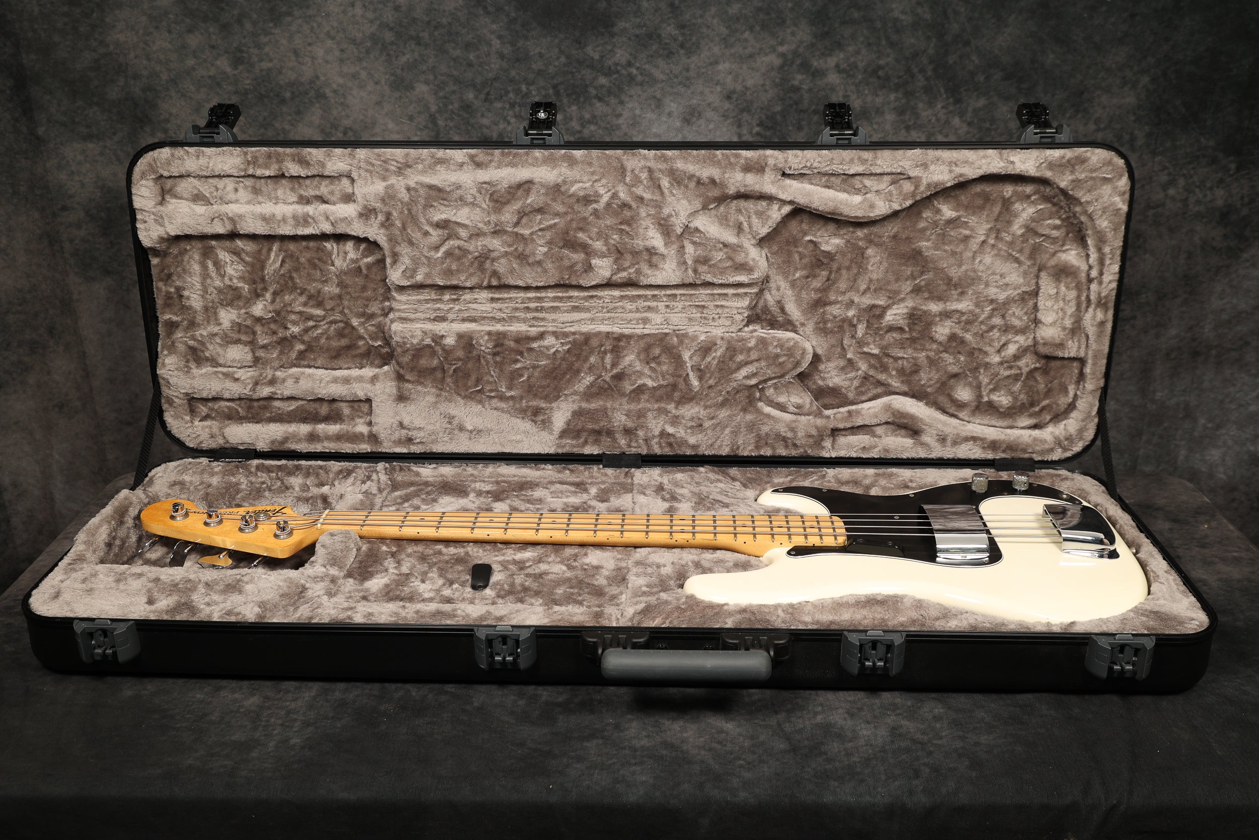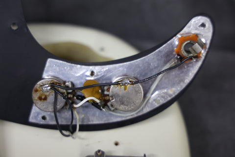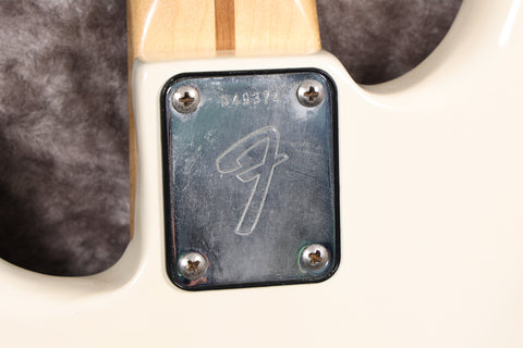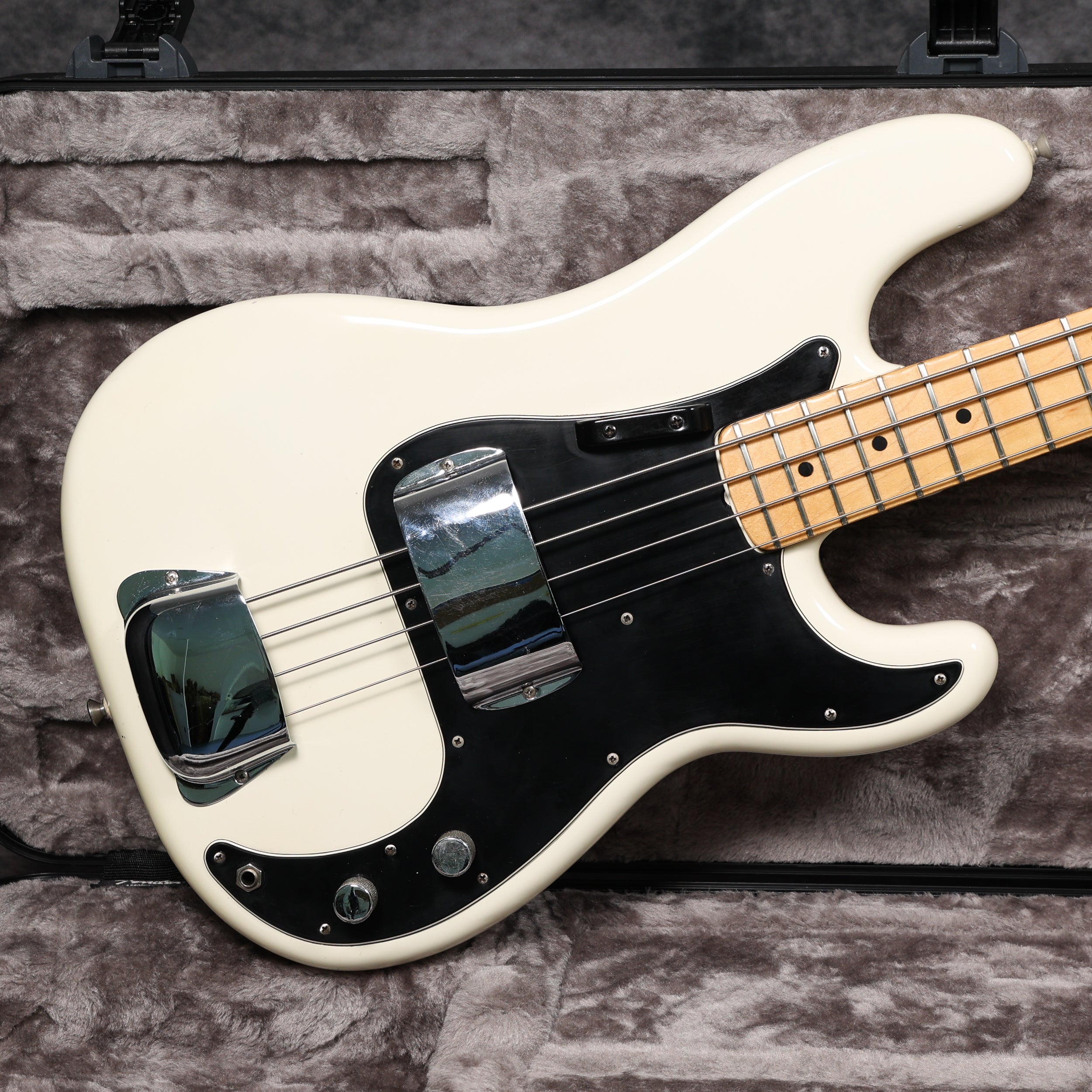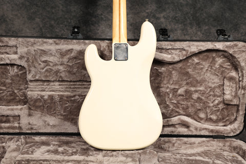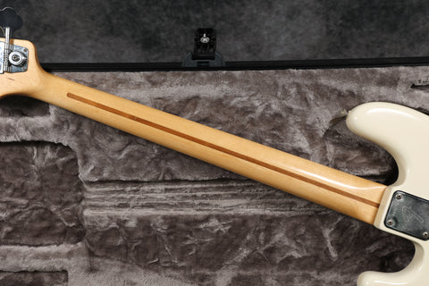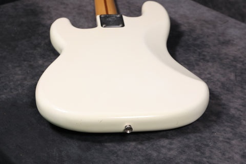 1974 Fender Precision Bass in excellent condition with an Olympic White Refinish. The tuners are slightly later 70s, the metal covers appear to be newer, there's an added ground wire across the pots, and the jack socket has been changed. All other parts are original. Supplied in a modern Fender hard case.
