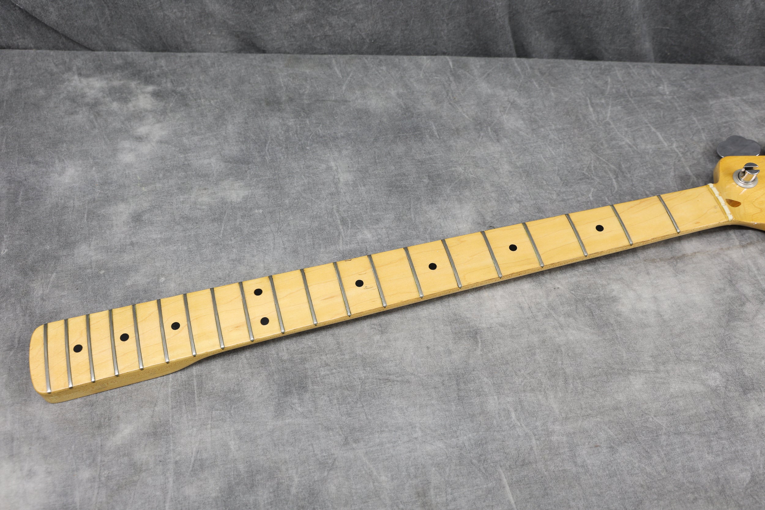 This is a great Fender P-Bass with a straight neck and original frets, which are in excellent condition, showing very little wear. There are some minor scuffs and dings in the finish, mainly around the edges of the body, but nothing major. The neck is very clean. The headstock has a few minor scuffs along the edges.