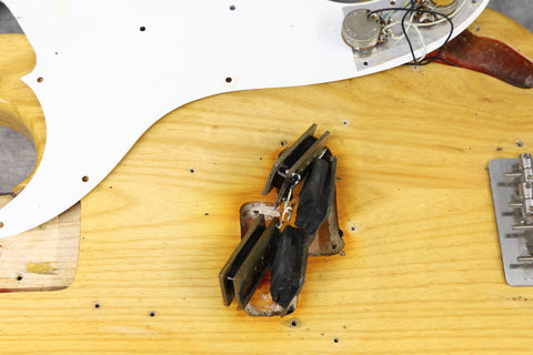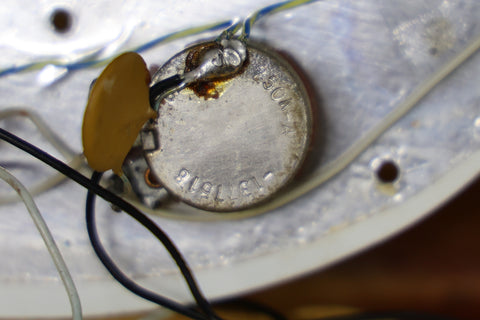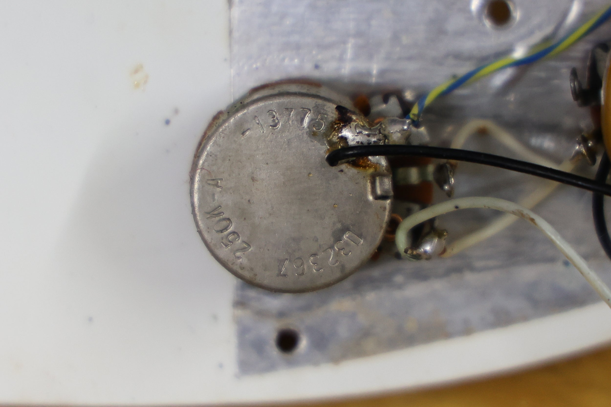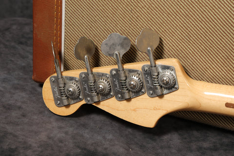 This bass has been fully set up in our workshop with a medium/low action and is strung with a fresh set of nickel Rotosound round-wound strings. Both pots date to '75. The date stamps on the pickups are illegible. Both have original winds with strong output. Serial number:589349, weight: 9 lbs 12 oz / 4.42 kg. Nut width:42 mm. Depth at 1st fret: 22 mm.