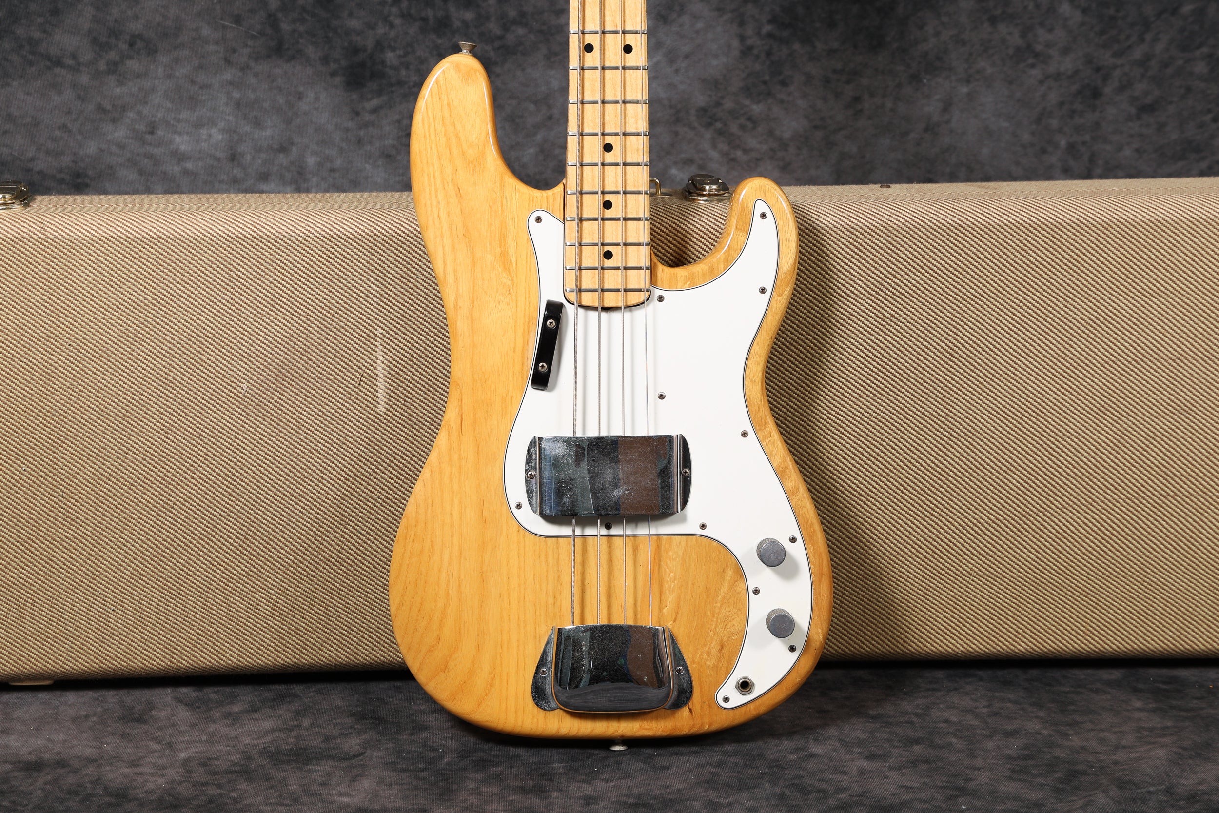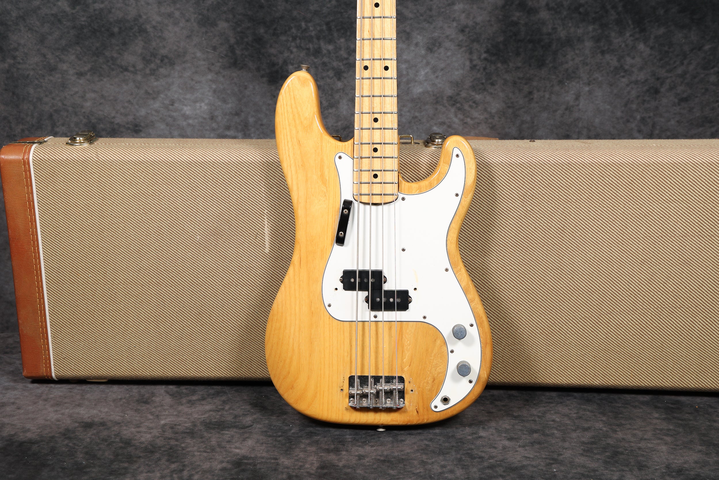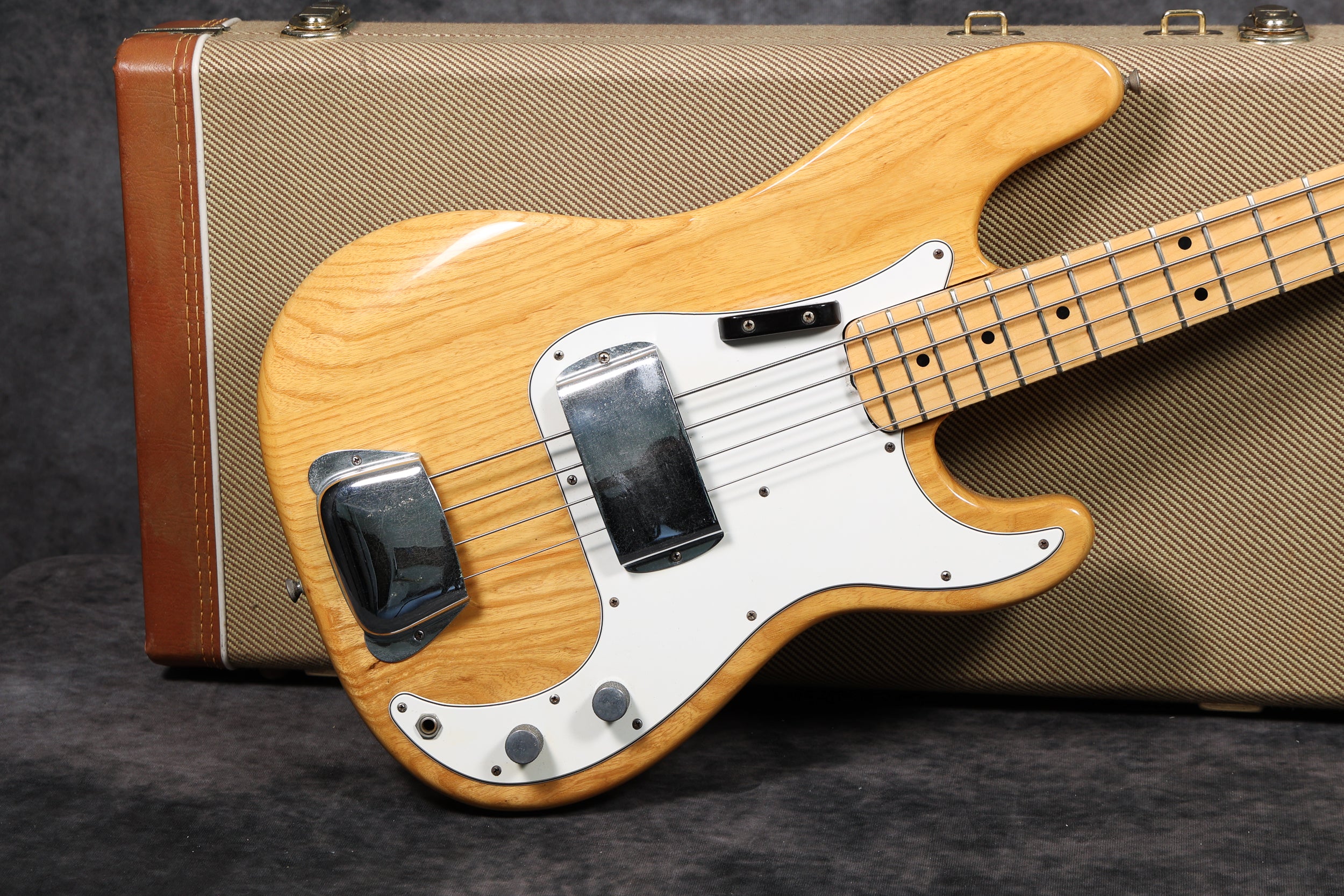1975 Fender Precision Bass in excellent + condition with a natural finish. All original and complete, aside from the case and an added ground wire. This is a great Fender P-Bass with a straight neck and original frets, which are in excellent condition, showing very little wear. There are some minor scuffs and dings in the finish, mainly around the edges of the body, but nothing major. The neck is very clean. The headstock has a few minor scuffs along the top edge.