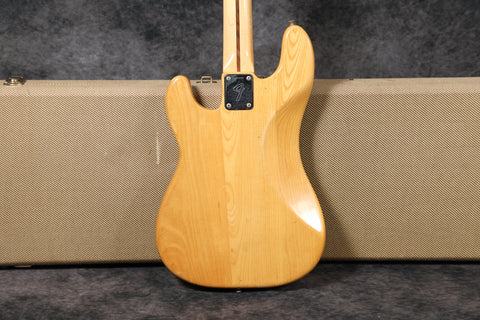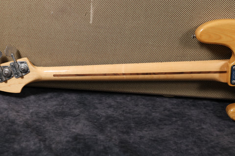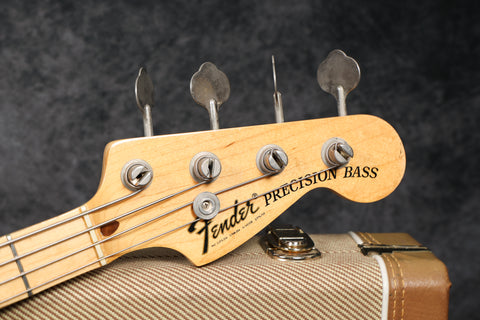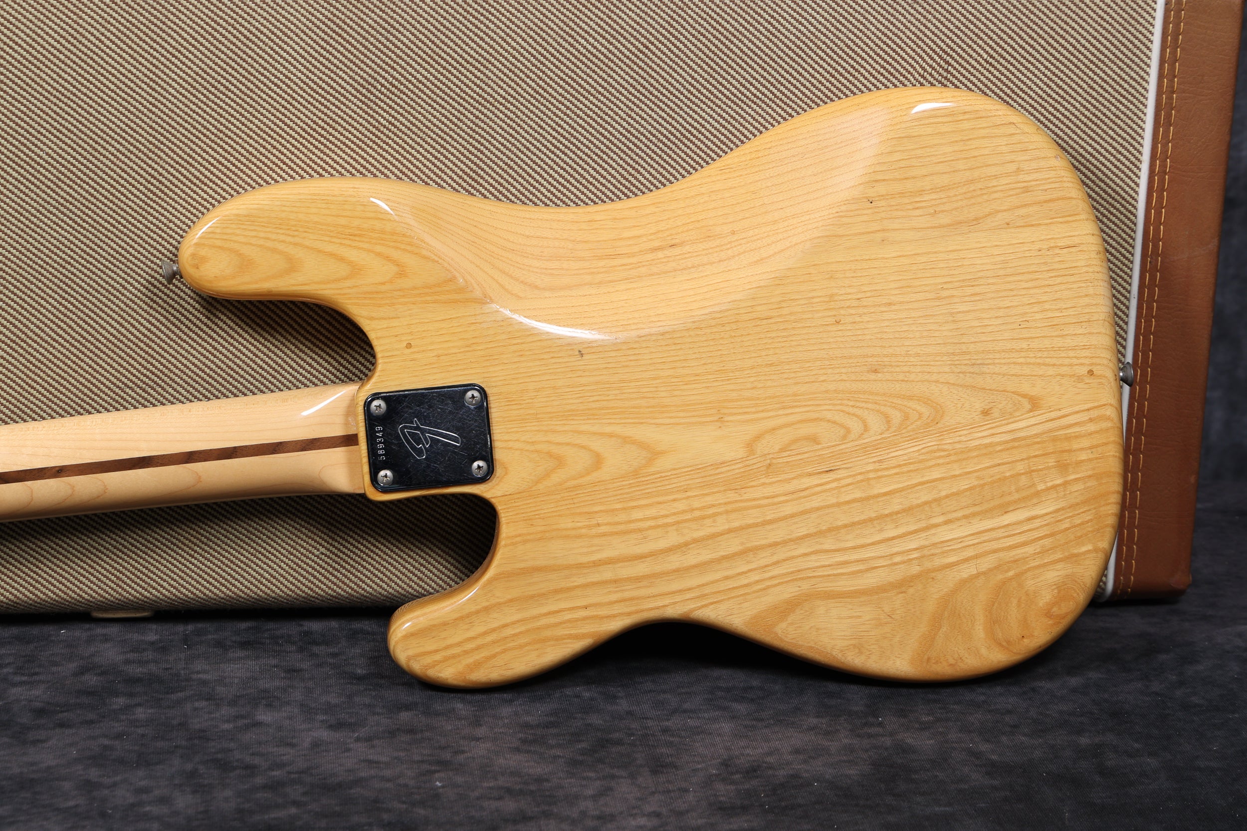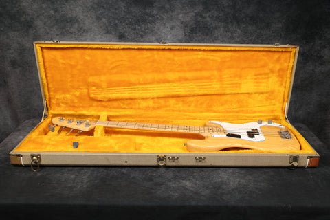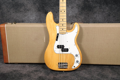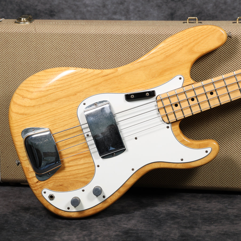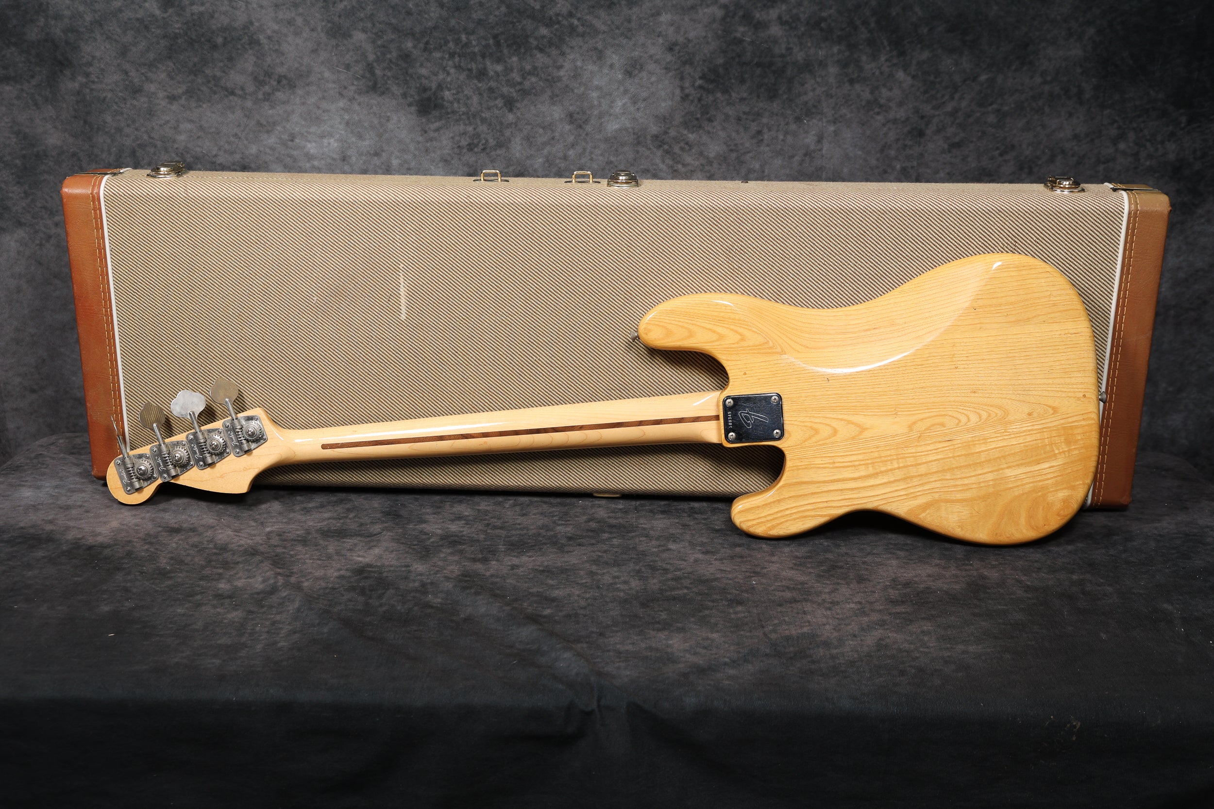 1975 Fender Precision Bass in excellent + condition with a natural finish. All original and complete, aside from the case and an added ground wire. This is a great Fender P-Bass with a straight neck and original frets, which are in excellent condition, showing very little wear. There are some minor scuffs and dings in the finish, mainly around the edges of the body, but nothing major. The neck is very clean. The headstock has a few minor scuffs along the top edge.