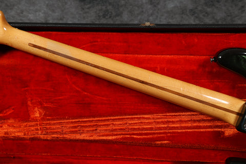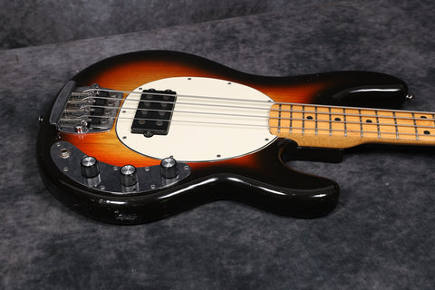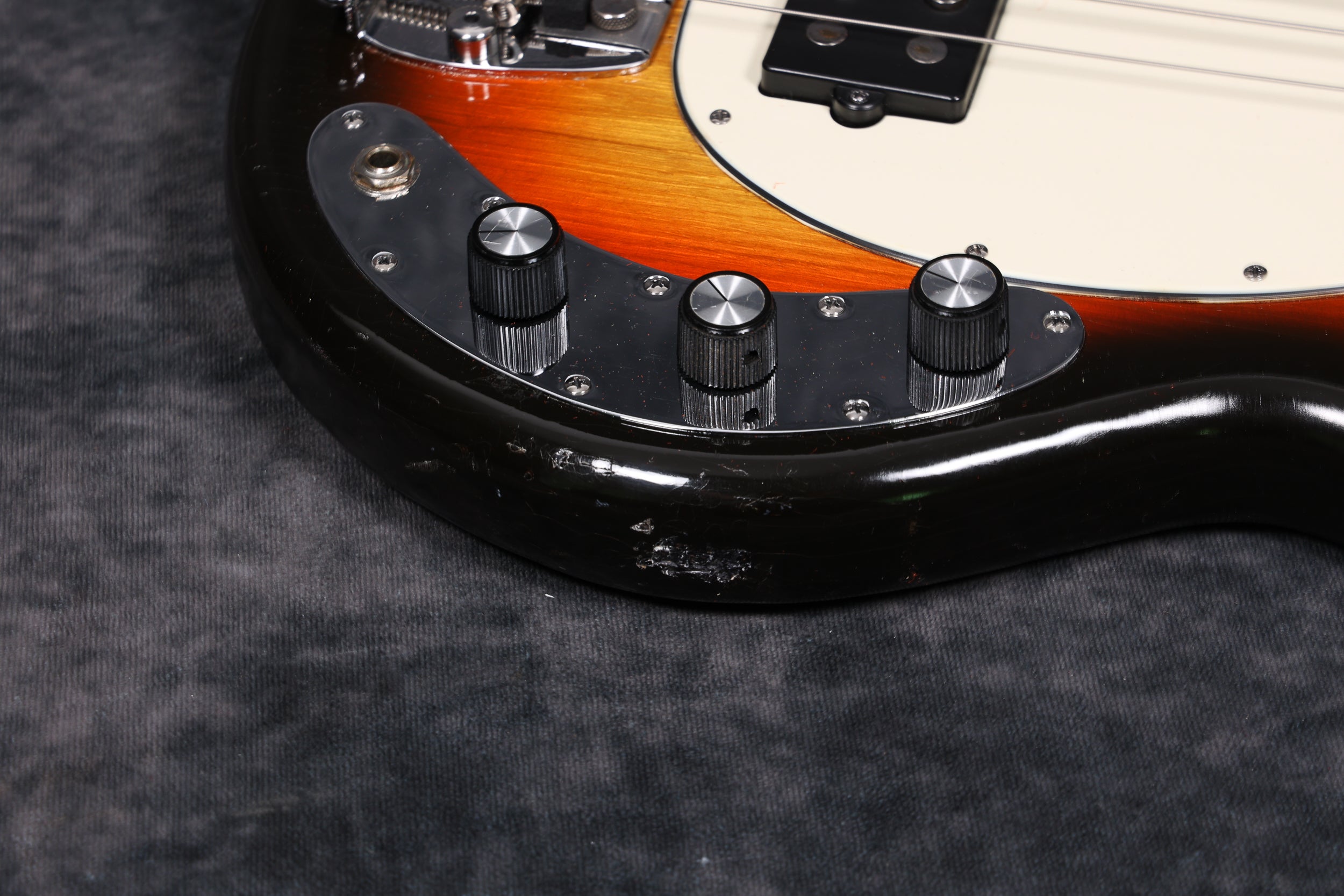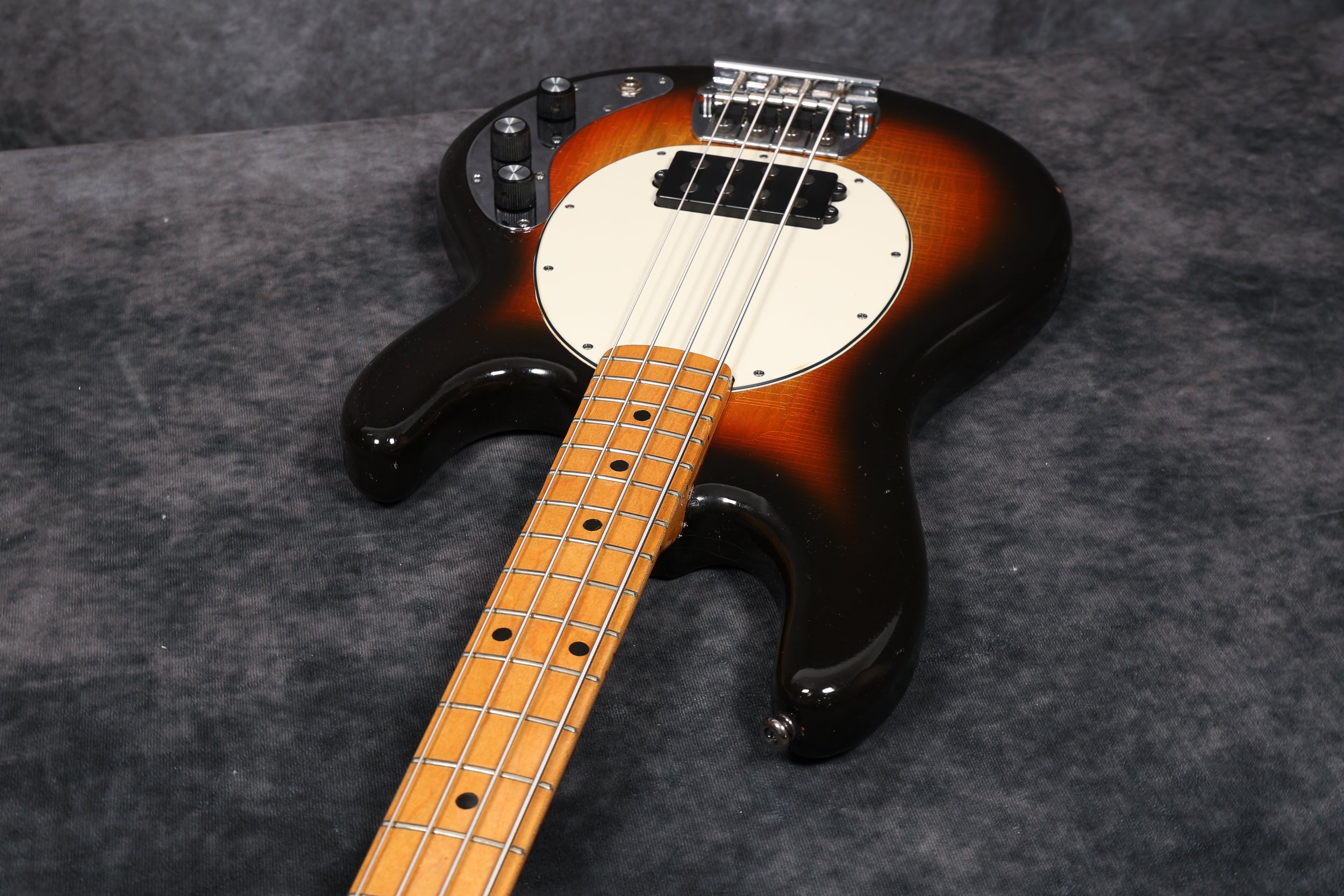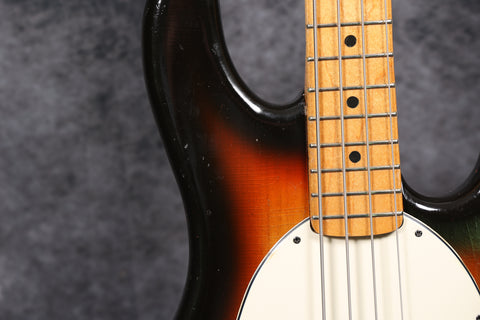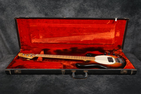 1976 Music Man Stingray in very good + condition. Sunburst finish, maple neck & fretboard. Equipped with a 2-band EQ, epoxy-coated preamp and through-body stringing. This is a very early model with "radio knobs" and long pole piece pickups. The mute sponge is new, as is the nut, and it's been refretted; otherwise, all original, including the case.