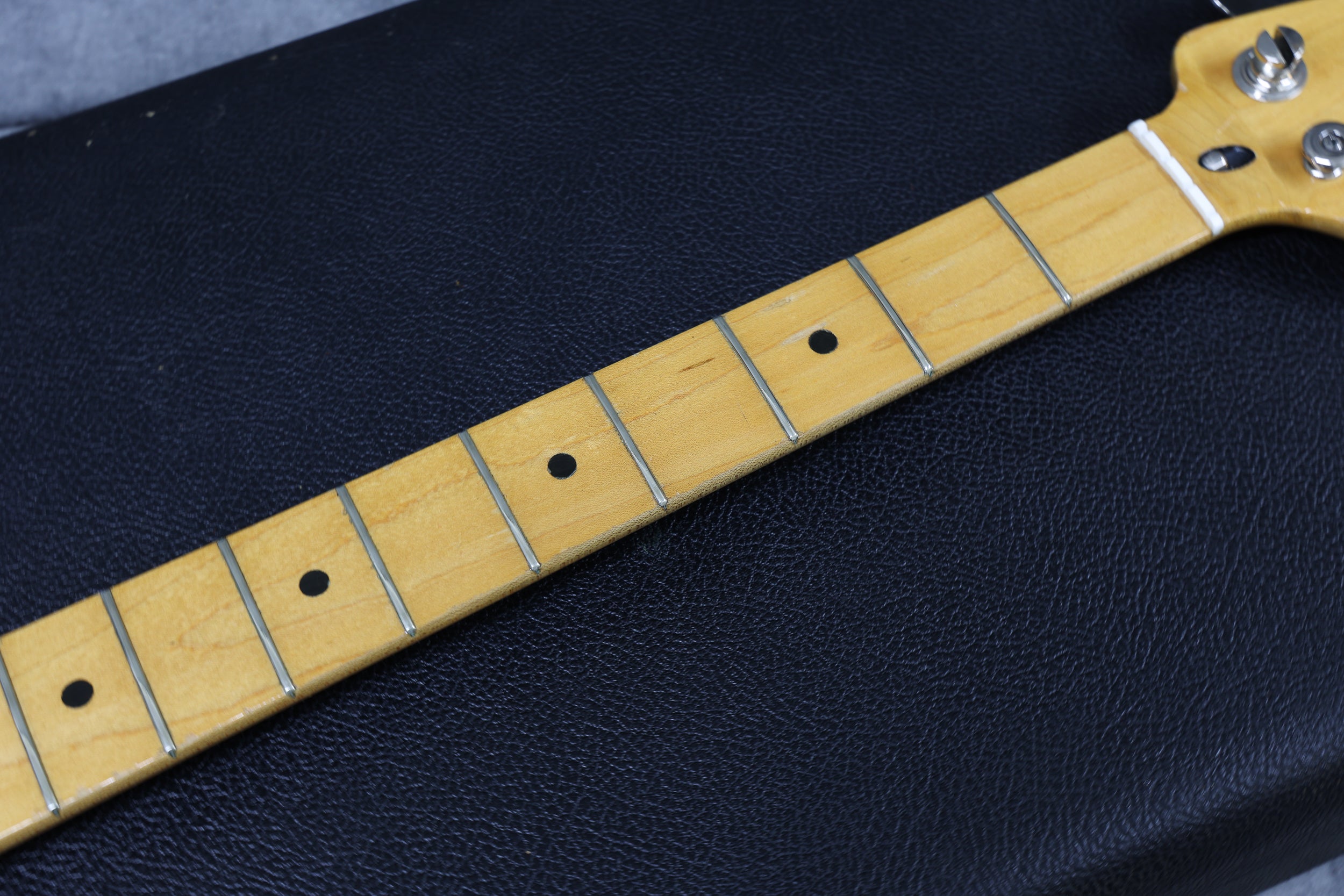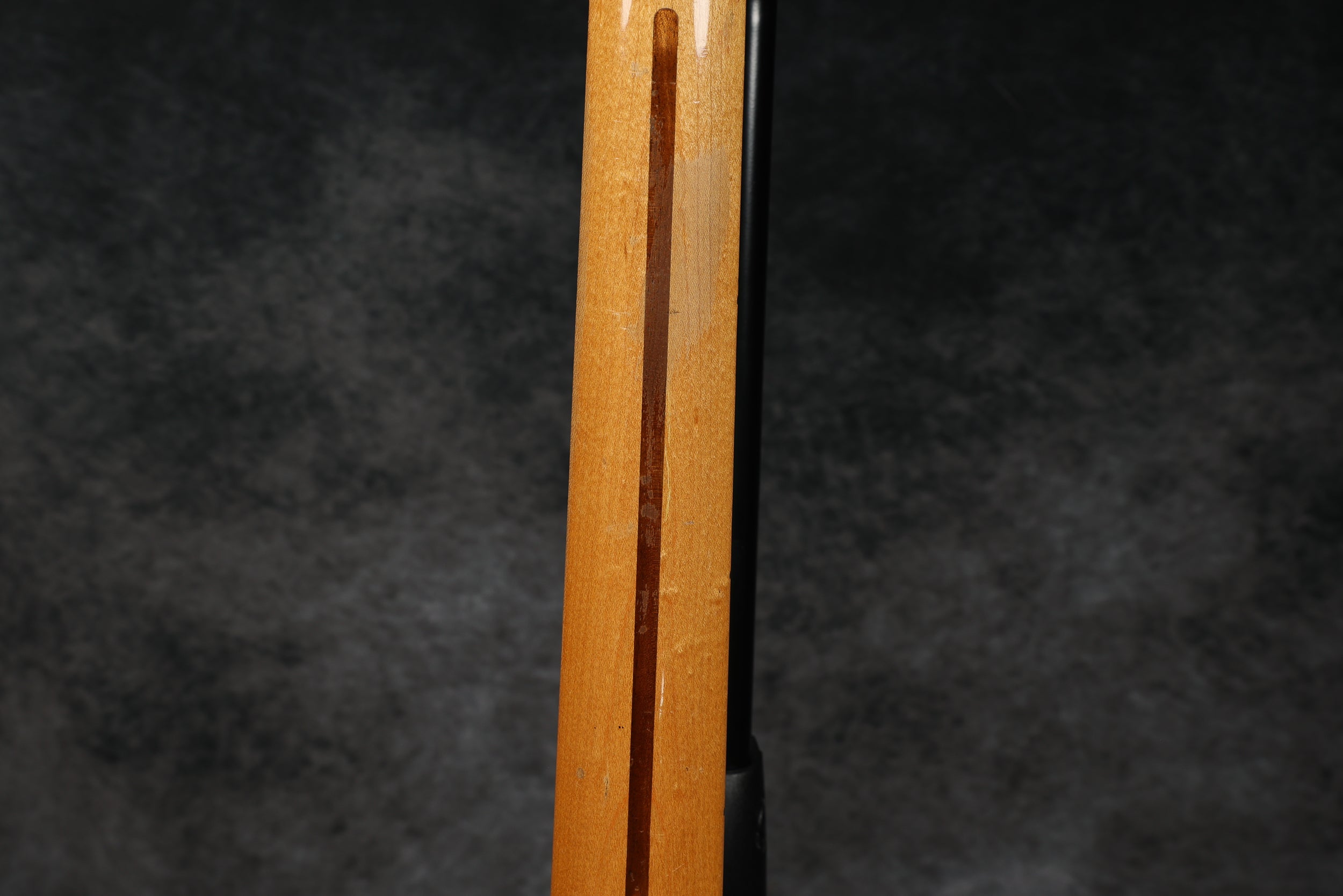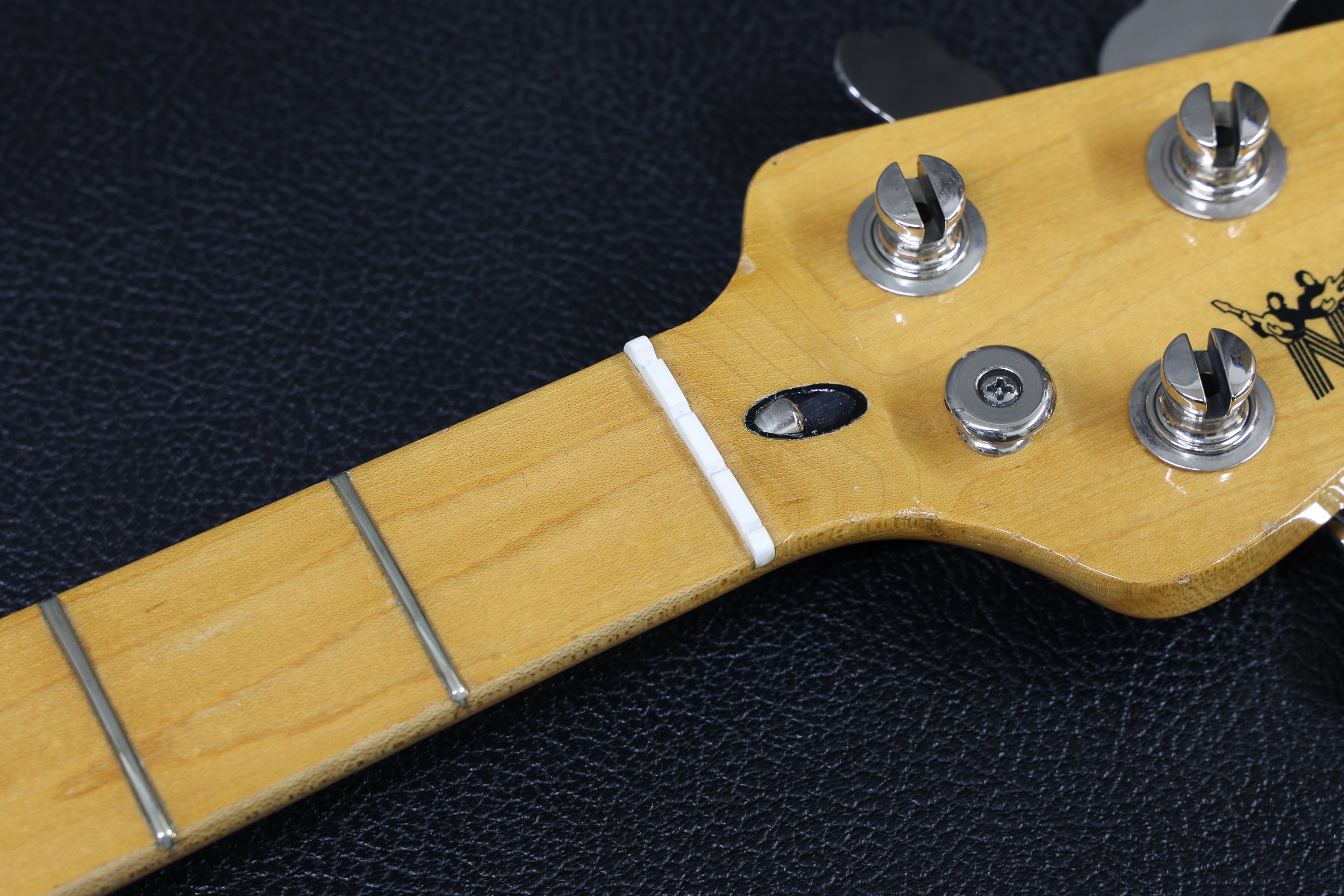 The body finish on the front and back is very clean with just a few small scuffs and dings, as well as some lacquer checking. There's a bit more wear around the edges of the body. The headstock has light wear around the top edge. The back of the neck has light playwear in the first position and a few very small dings further up, but nothing major. The neck is straight and plays smoothly. The frets have minimal wear and have been cleaned and polished in our workshop. The electronics work perfectly, and all hardware is in excellent condition. The truss rod works correctly without issue. This is an all-around excellent bass.