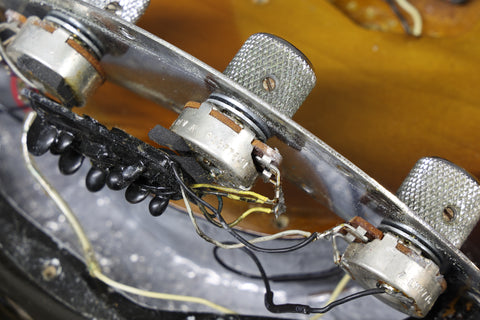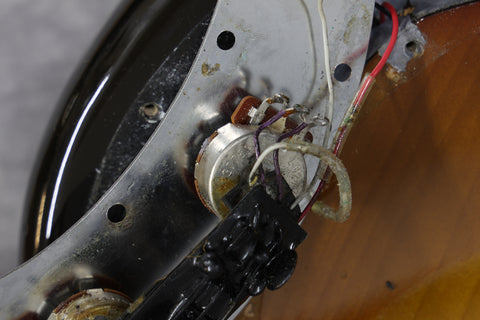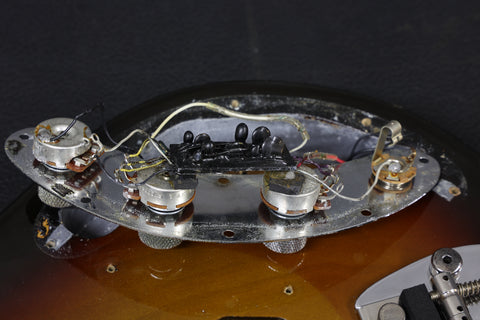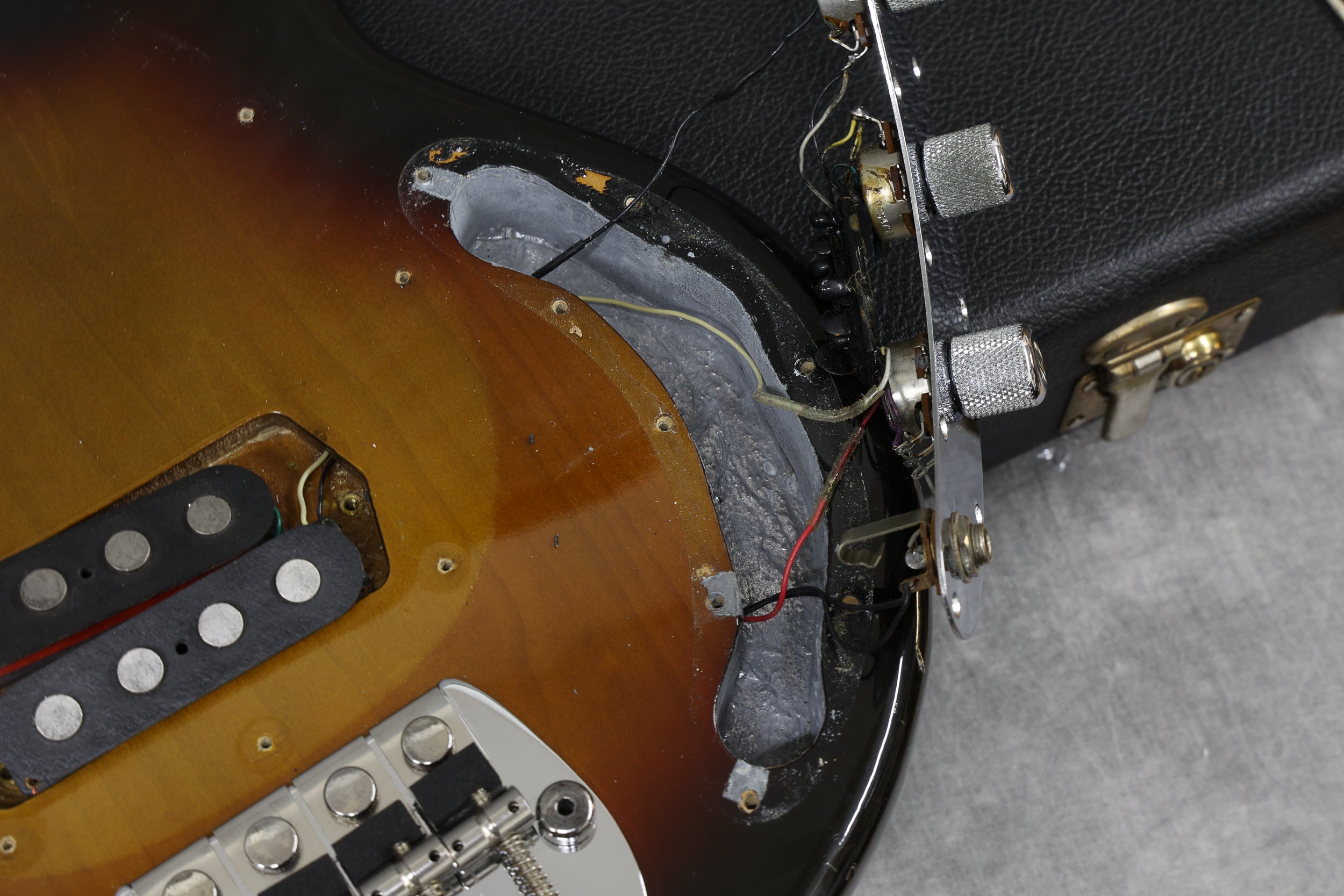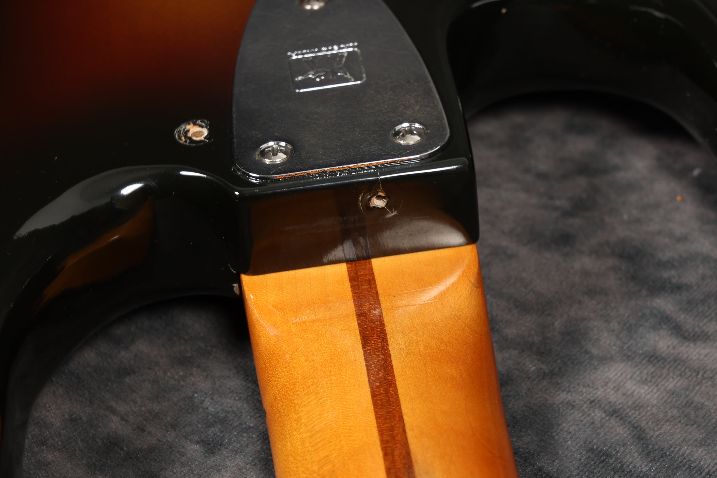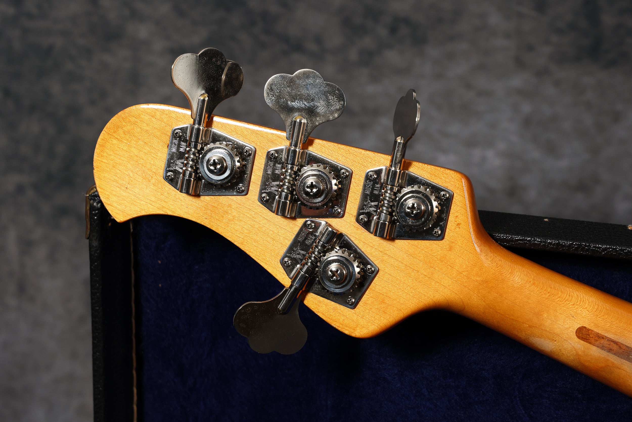 The body finish is pretty clean overall, but does have a few scuffs and dings, mainly around the edges, as well as some to the face of the upper bout. In addition, there are 2 extra holes by the neck plate where a previous owner must have experimented with the position of the strap button. The headstock has a few small scuffs along the top edge but is otherwise clean, and the back of the neck has some wear through the finish. The neck is straight and plays smoothly. The frets have minimal wear and have been cleaned and polished in our workshop. The electronics work perfectly, and all hardware is in excellent condition. The truss rod works correctly without issue. This is an all-around excellent bass.