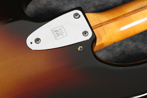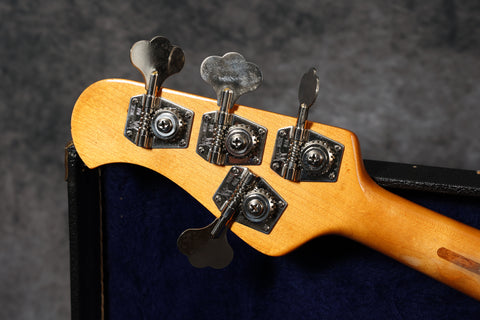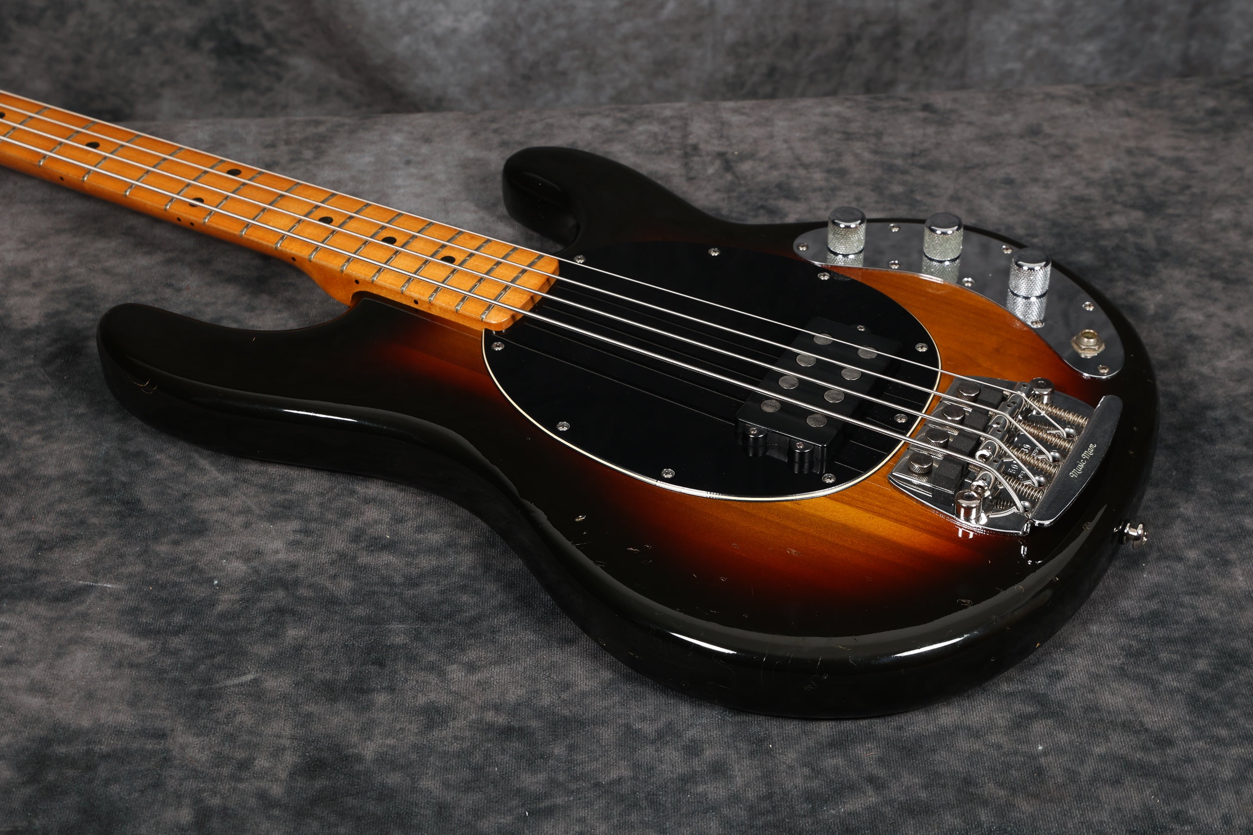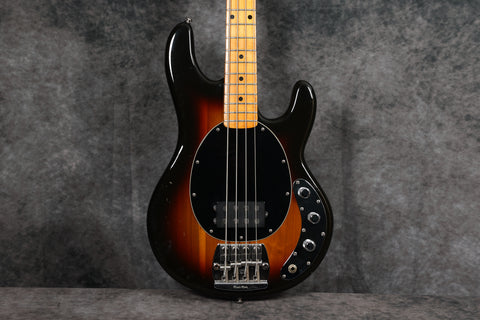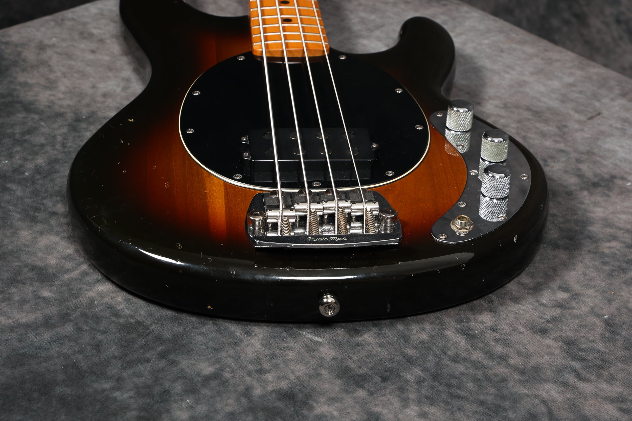 1978 Music Man Stingray with a rare slim 38 mm nut width. Sunburst finish in very good condition, black pickguard, maple neck & fretboard. Equipped with a 2-band EQ, epoxy-coated preamp, and through-body stringing. Aside from a refret and new mute sponge, it's all original, including the hard case.