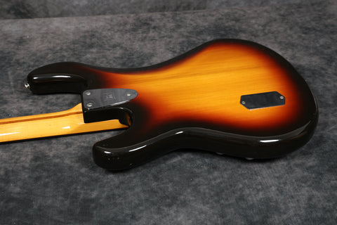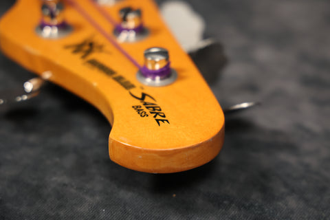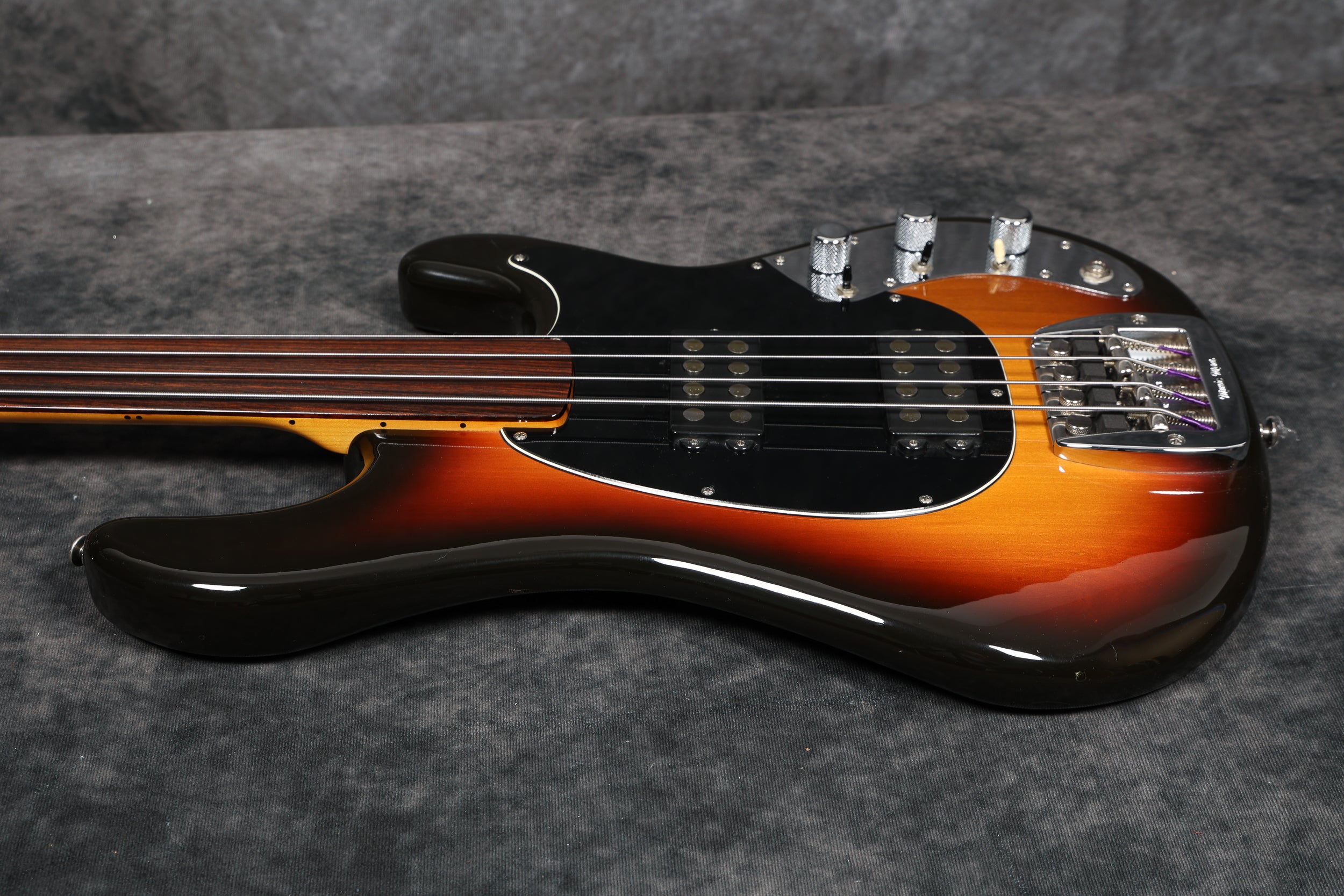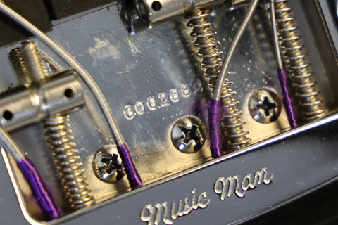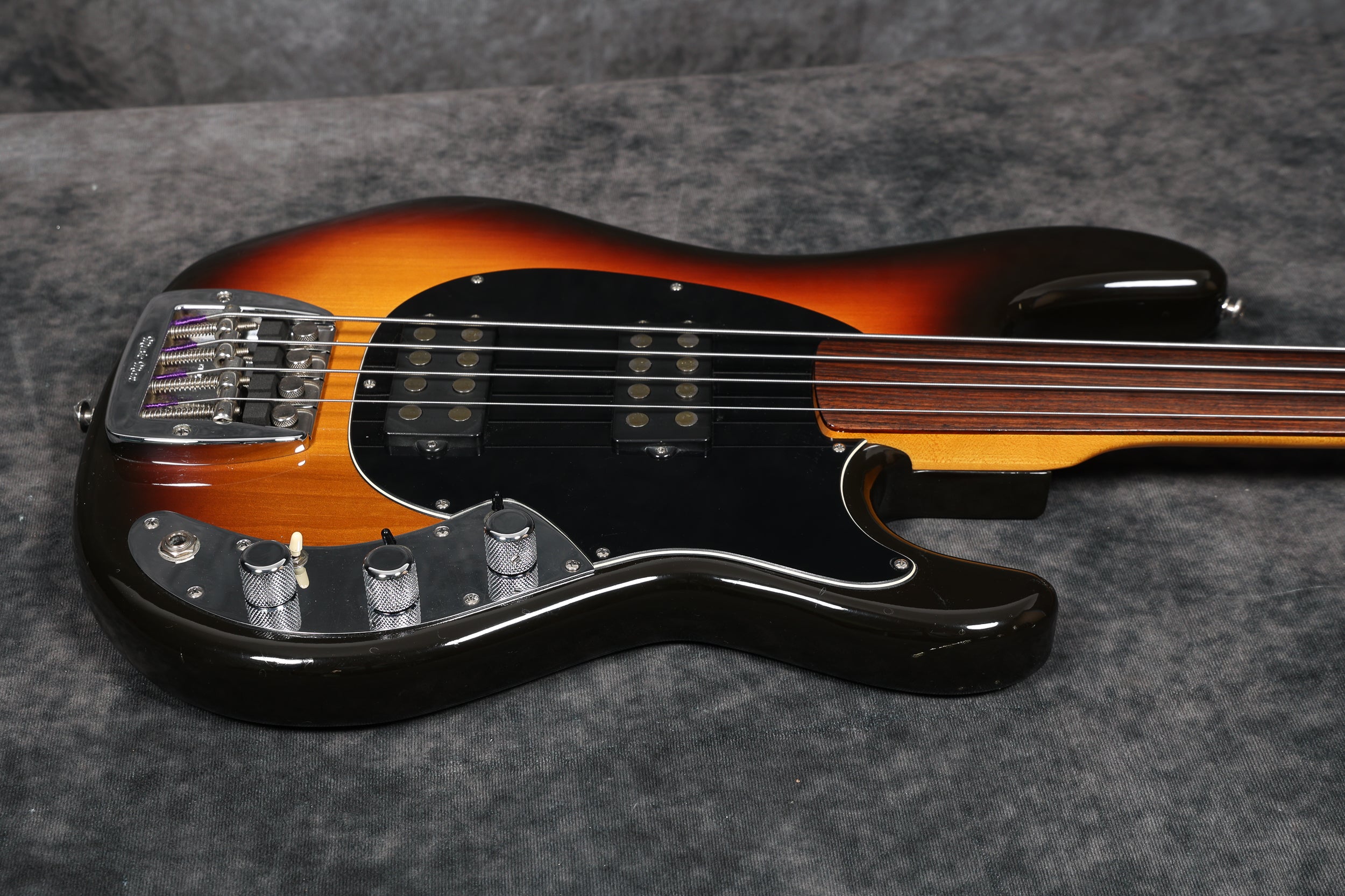 1979 Music Man Sabre bass, fretless, in near-mint condition. It has a black pickguard, a 2-band EQ, 2 humbucking pickups, an internal micro-powered pre-amp with brightness + phase in/out and pickup selector switches. Aside from new mute sponge, it's all original, including the case.
