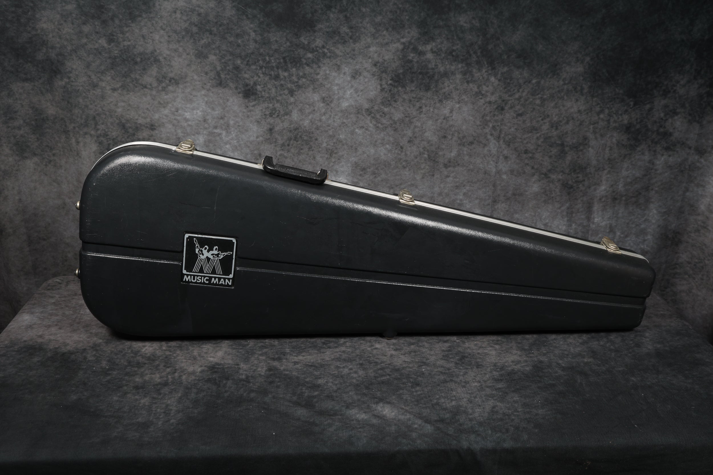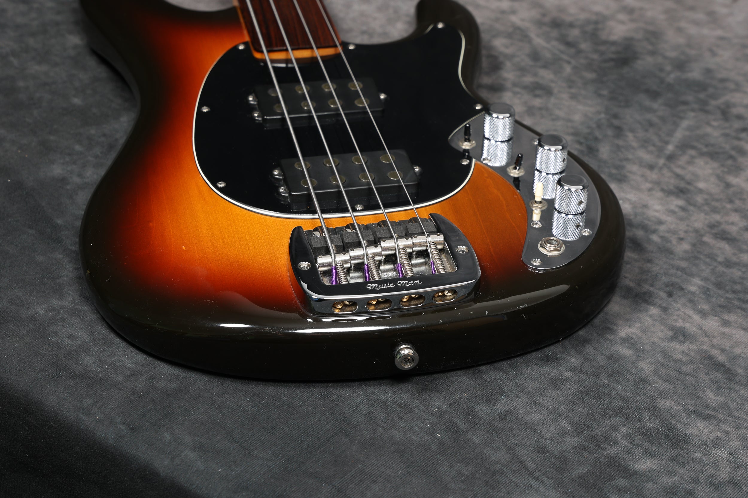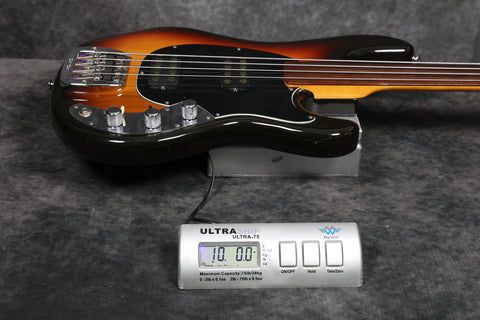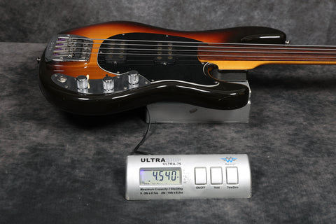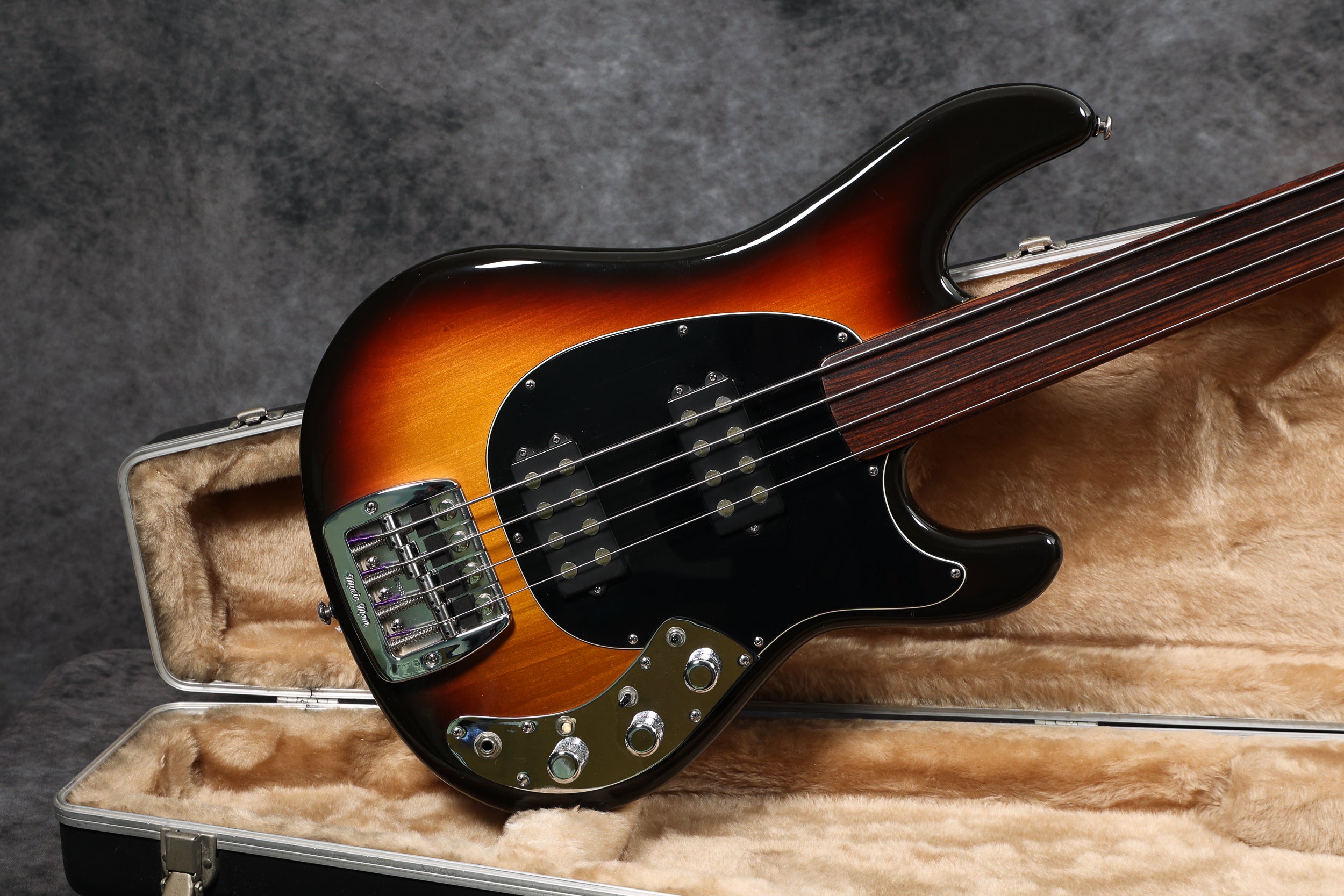 1979 Music Man Sabre bass, fretless, in near-mint condition. It has a black pickguard, a 2-band EQ, 2 humbucking pickups, an internal micro-powered pre-amp with brightness + phase in/out and pickup selector switches. Aside from new mute sponge, it's all original, including the case.