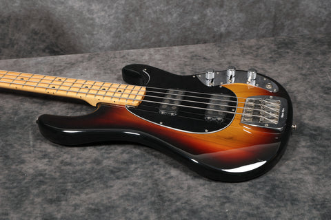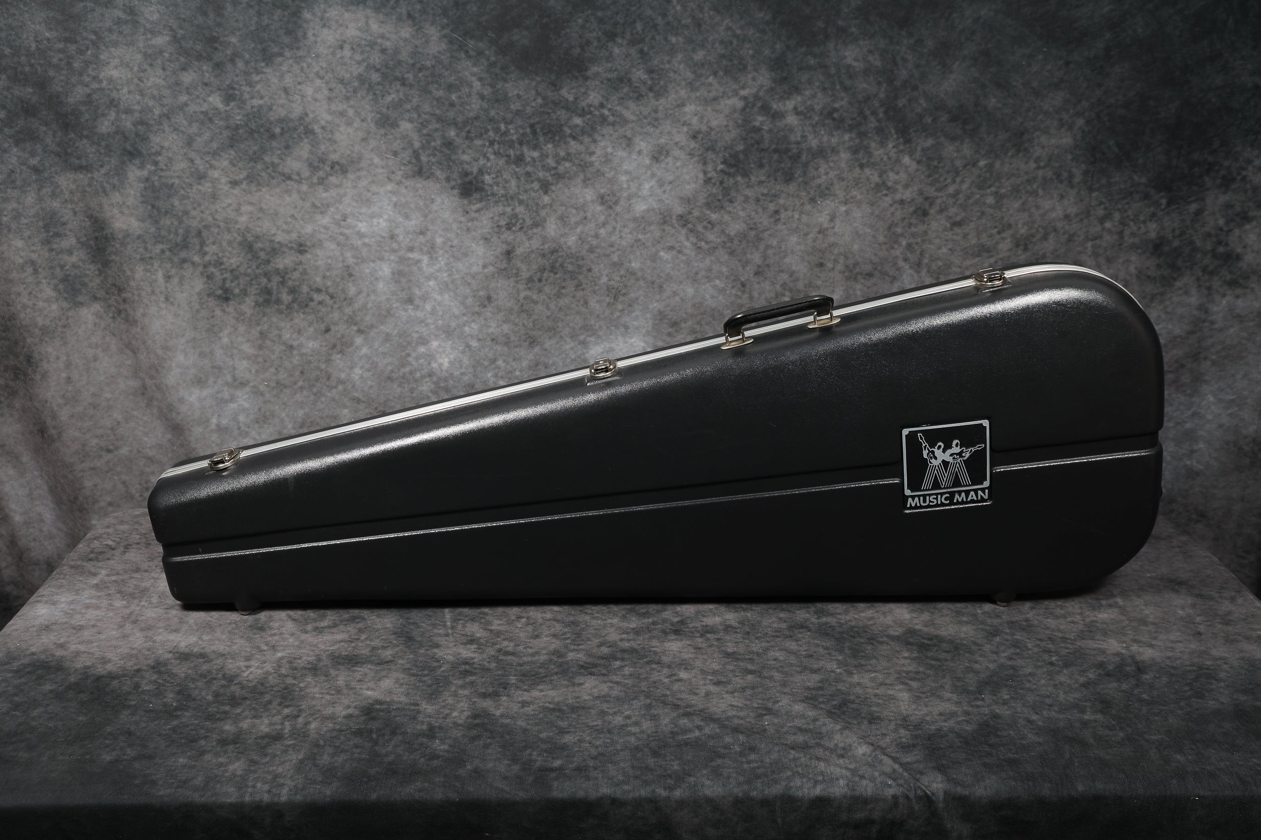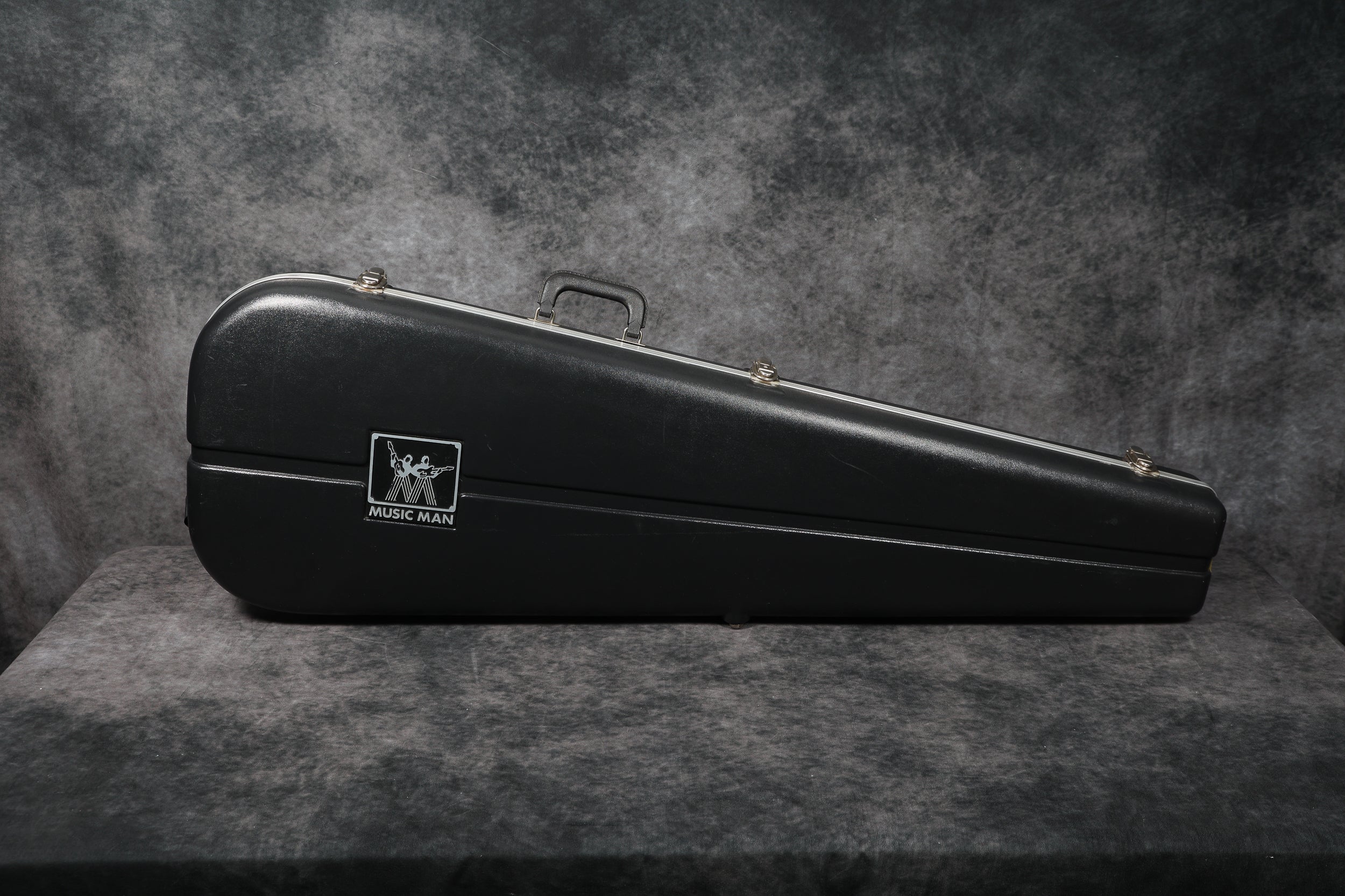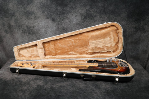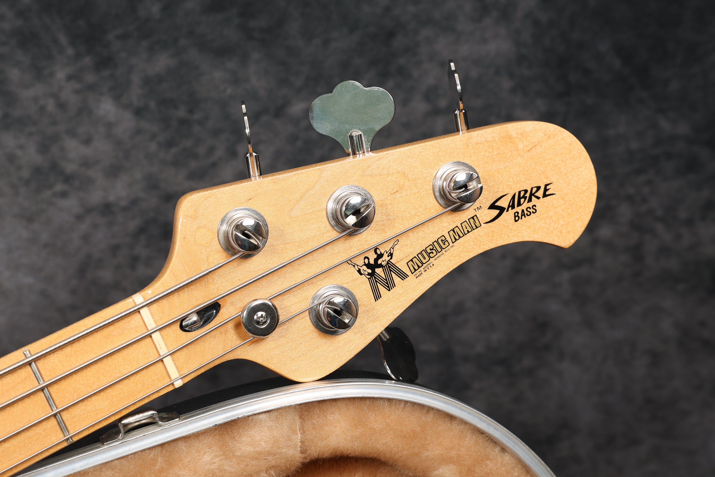 1979 Music Man Sabre bass in near-mint condition. It has a black pickguard, a 2-band EQ, 2 humbucking pickups, an internal micro-powered pre-amp with brightness + phase in/out and pickup selector switches. All original, including the case.