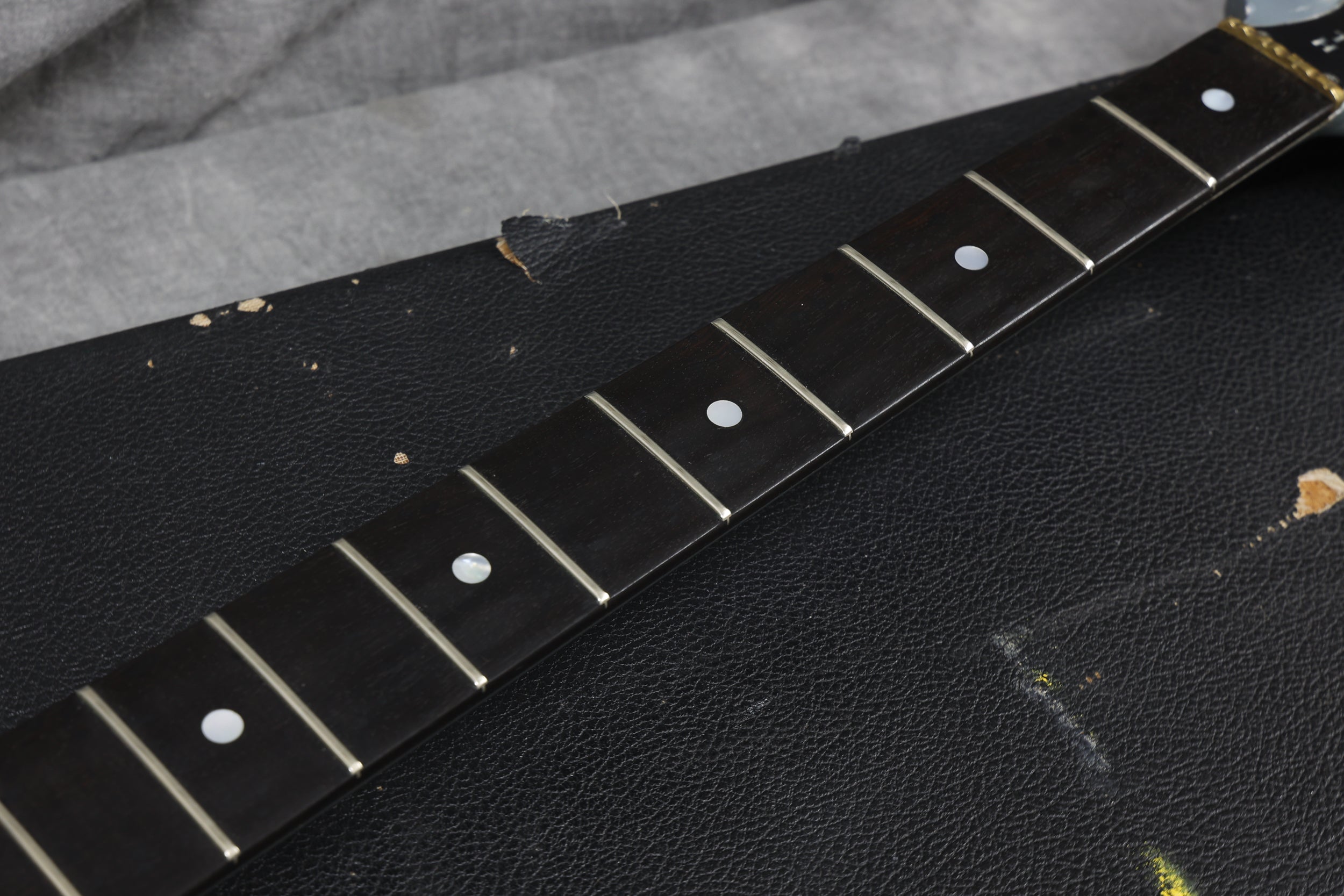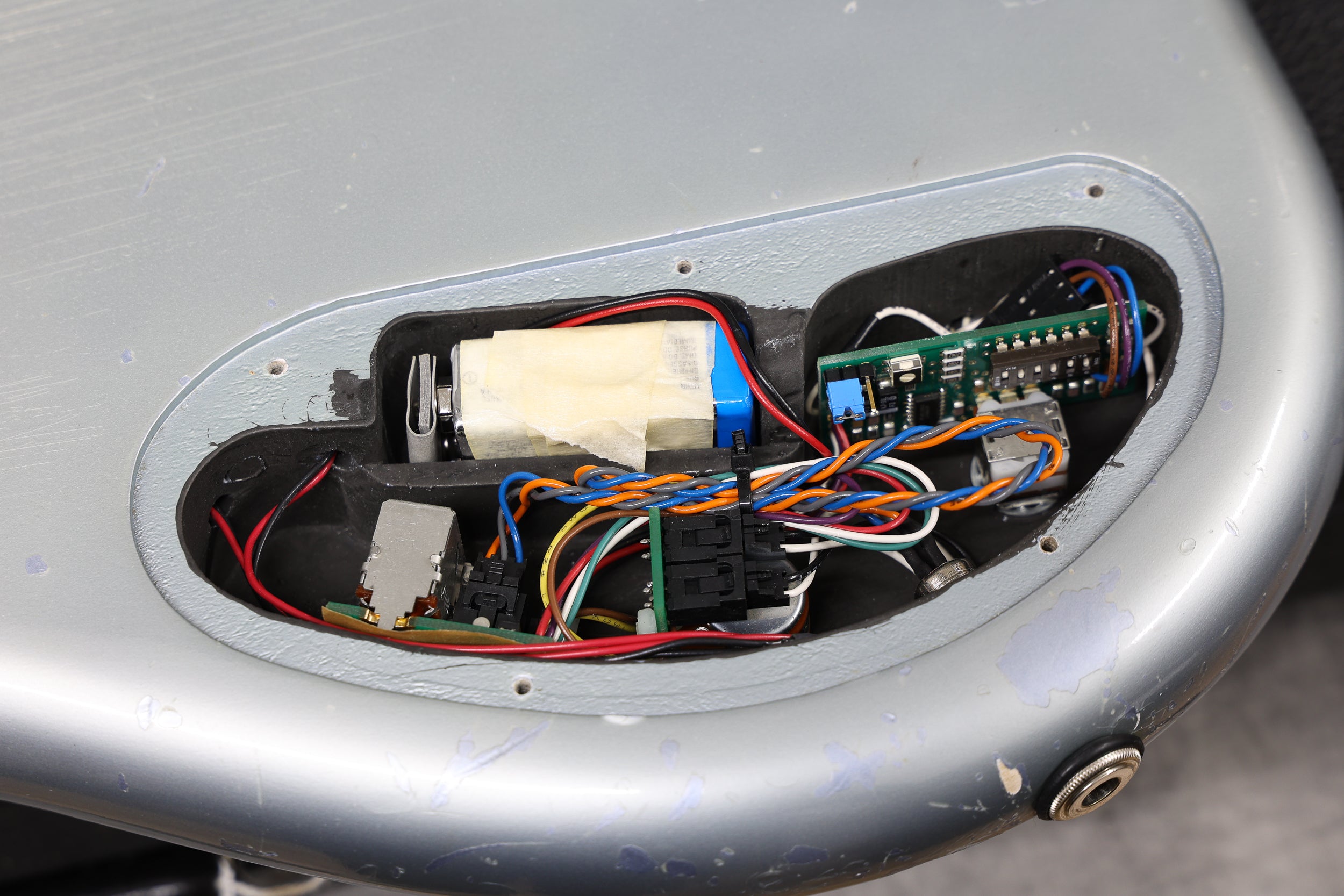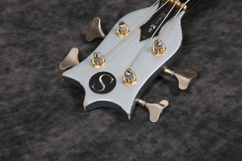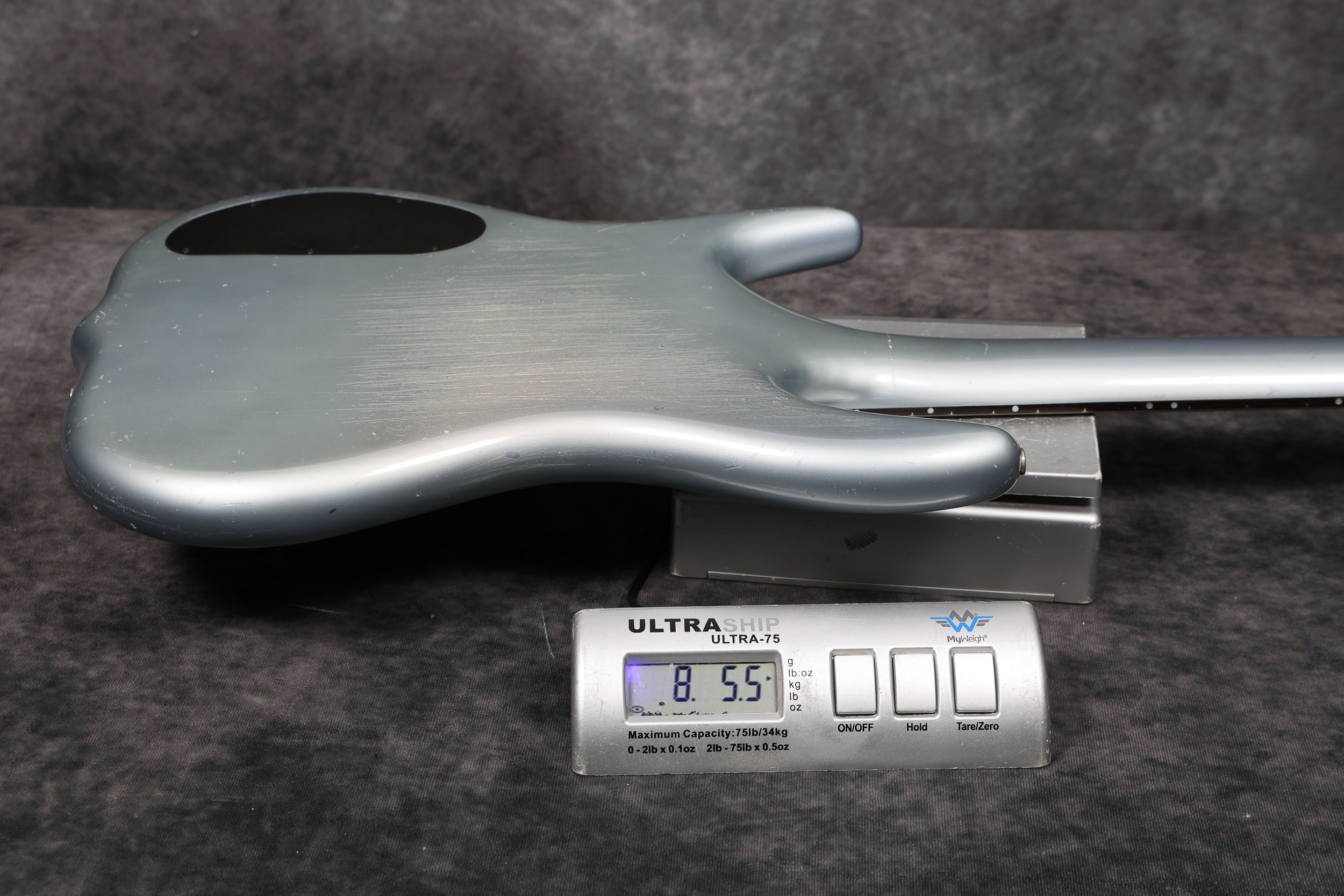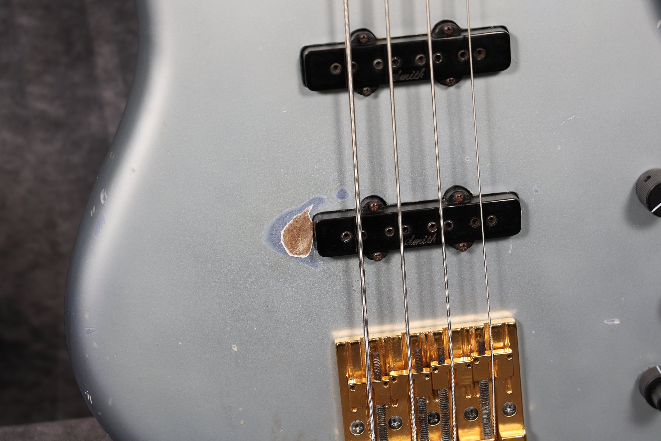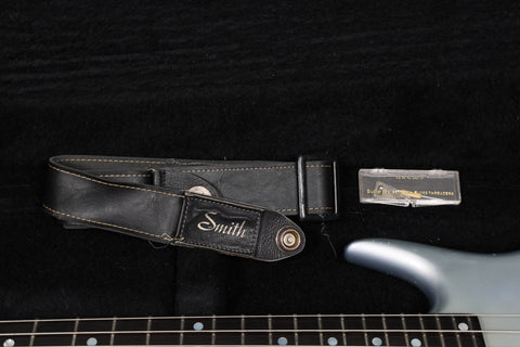 Given the solid finish, the woods used are a mystery, but it's very light, weighing only 8 lbs 5.5 oz / 3.78 kg. It has the classic BT preamp with the original jazz pickups. It has that classic Smith tone. Also included are the Smith strap and strap locks.