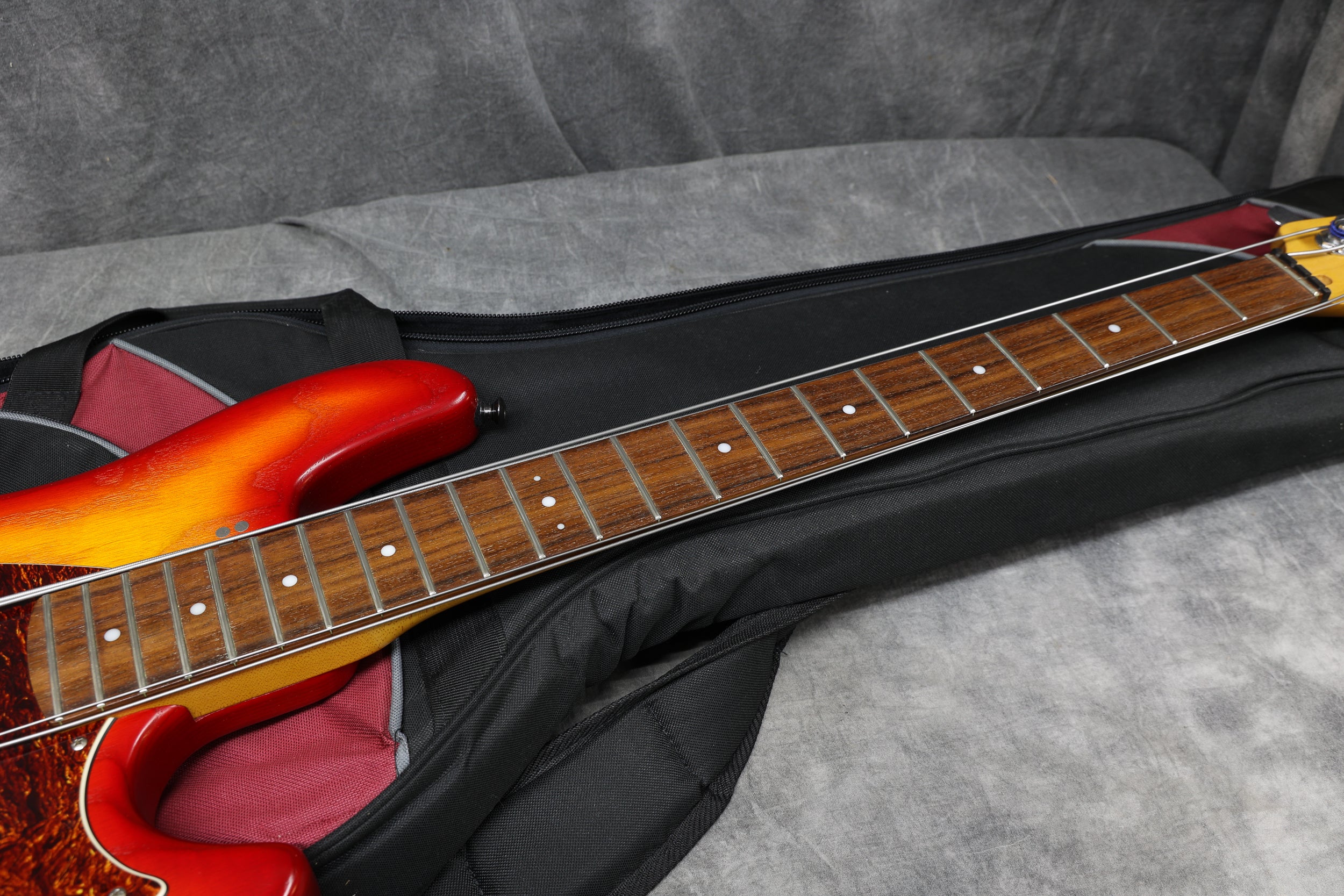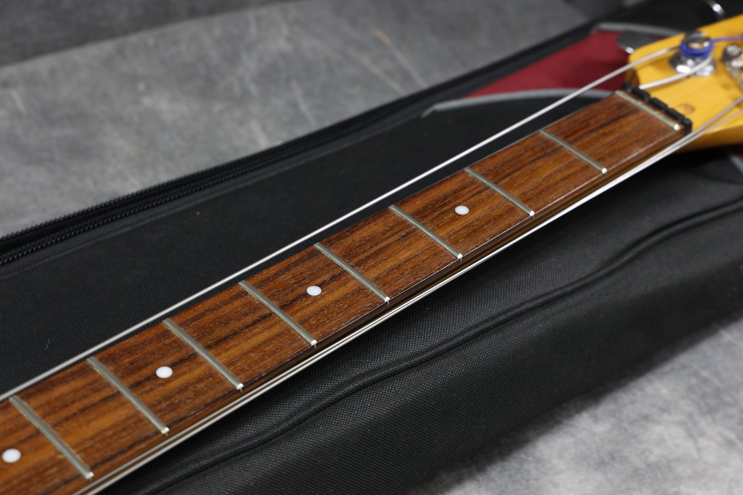 Fully set up in our workshop with a set of D'Addario Chrome flat-wound strings and low action, giving great playability. The truss rod works as it should, and the neck is straight. Serial: 25510. Weight: 9 lbs 2.5 oz / 4.15 kg. Nut Width: 39.6 mm. Depth at 1st fret: 21.4 mm.