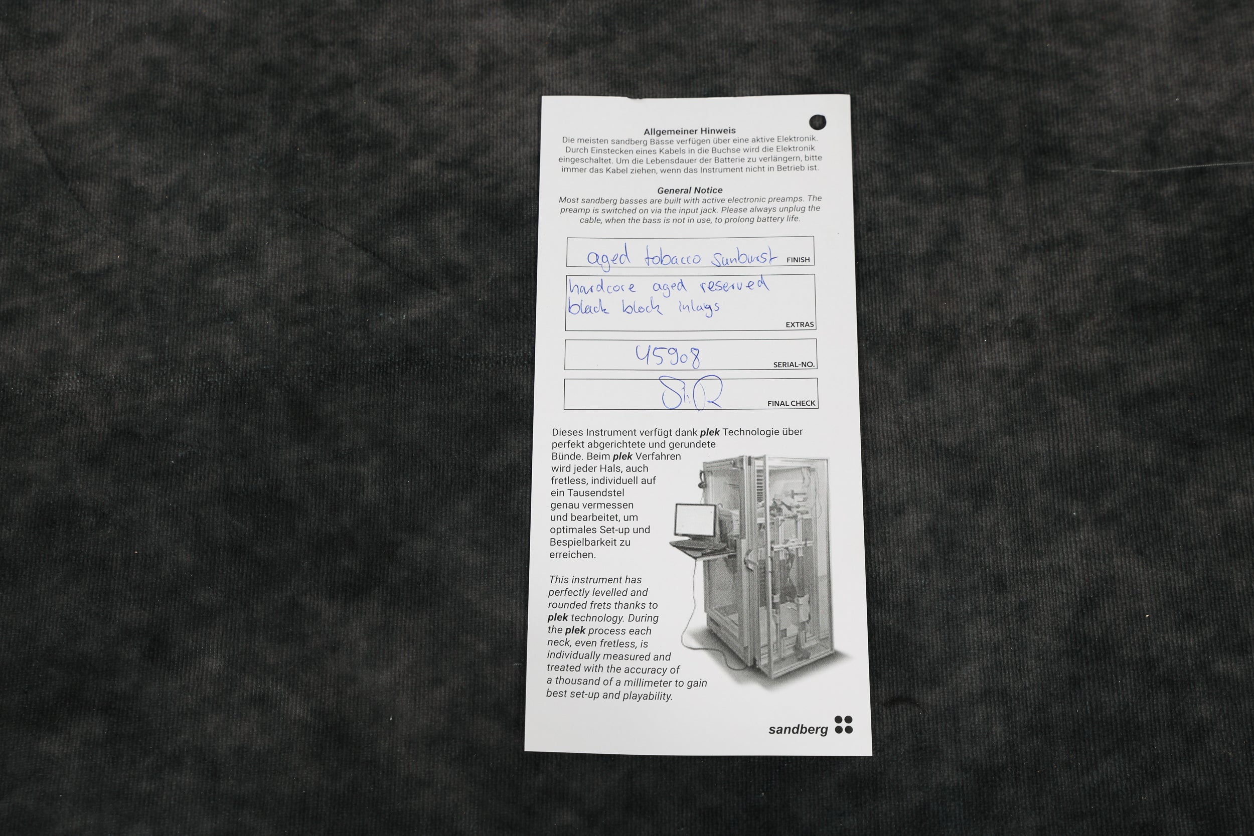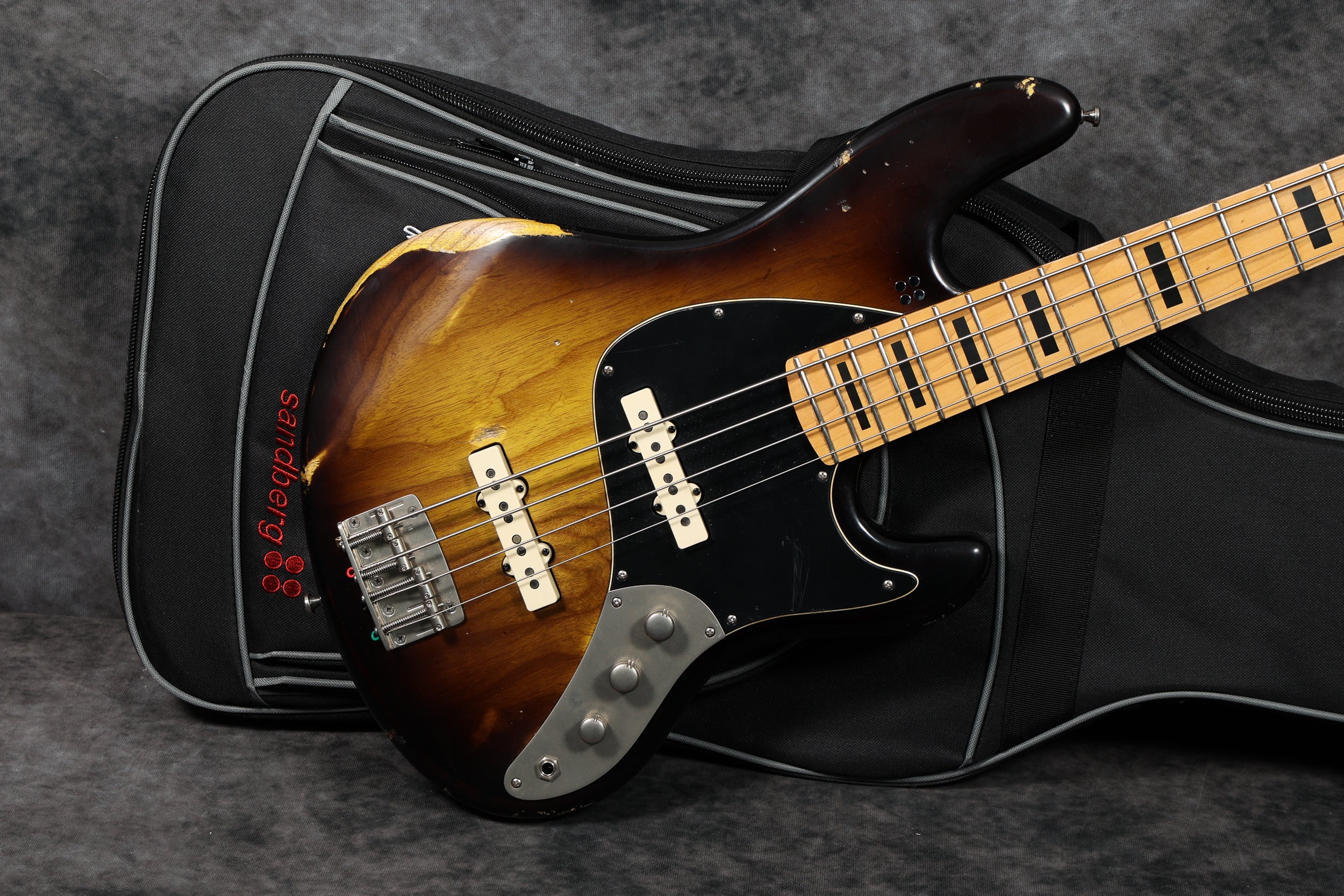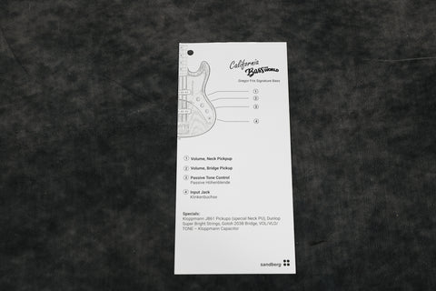Crafted in Germany, this four-string masterpiece boasts a lightweight swamp ash body, sleek maple neck, and two Kloppmann single-coil pickups chosen for their diverse tonal range. With traditional passive electronics, precise hardware including a Gotoh 203B-4 brass bridge, and Sandberg machine heads. The bass is supplied with a padded Sandberg gig bag and tools. Weight: 7 lbs 6 oz / 3.34 kg. Nut width: 39 mm. Depth at 1st fret: 21.5 mm. Serial: 45908.