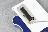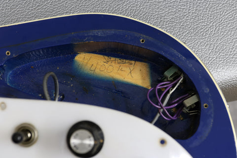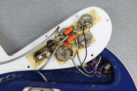 The finish has some minor wear in a few spots, mainly around the edges of the body and headstock. There's also some light buckle rash on the back top edge of the body and a couple of the small dings on the headstock have been touched up with blue paint. It's been professionally re-fretted. Theres no visible disturbance to the board, probably because the frets are larger the the original type used. The strap buttons have been changed for the type used commonly of Fenders.