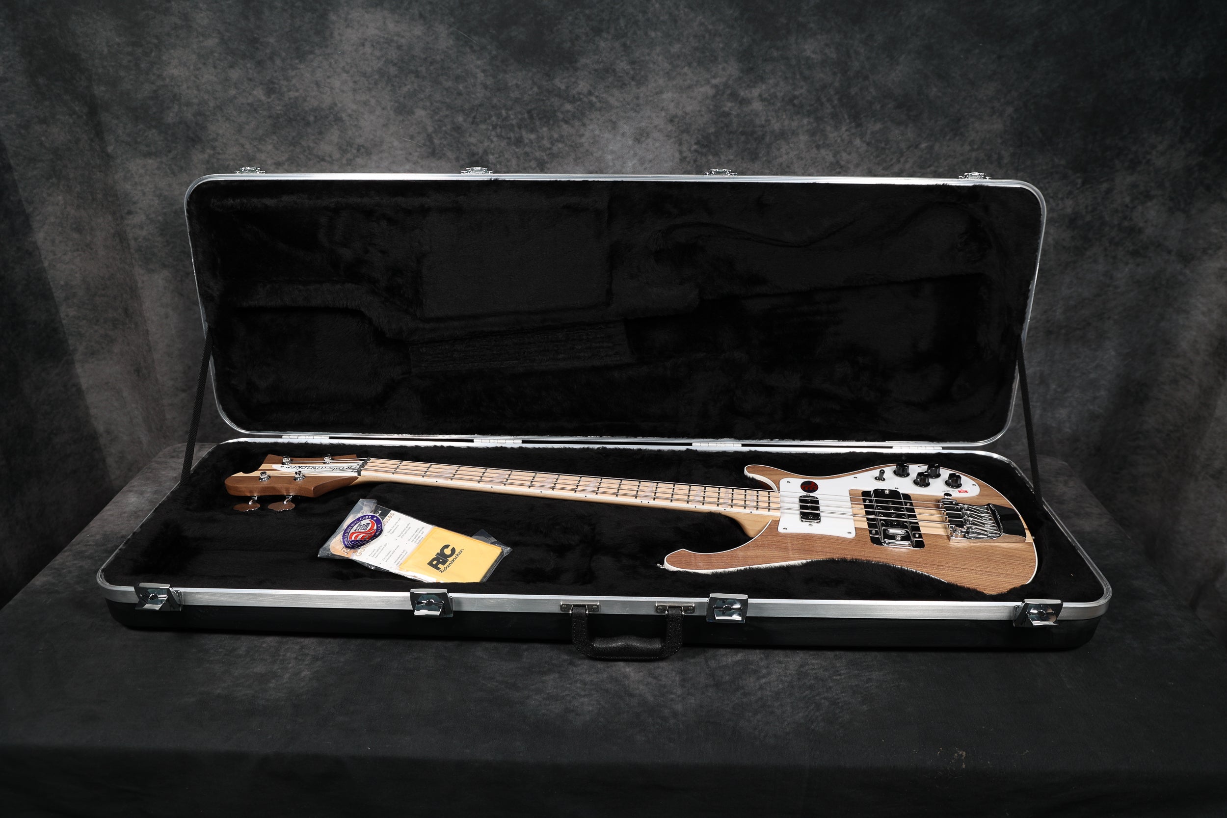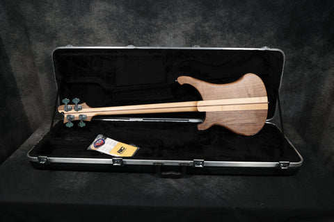 2025 Rickenbacker 4003, Walnut finish, unlacquered maple fingerboard. The bass pictured is in stock. This is the latest version with no pickup cover as standard. New Version 2 tailpiece & bridge, double action single truss rod and slim neck profile.