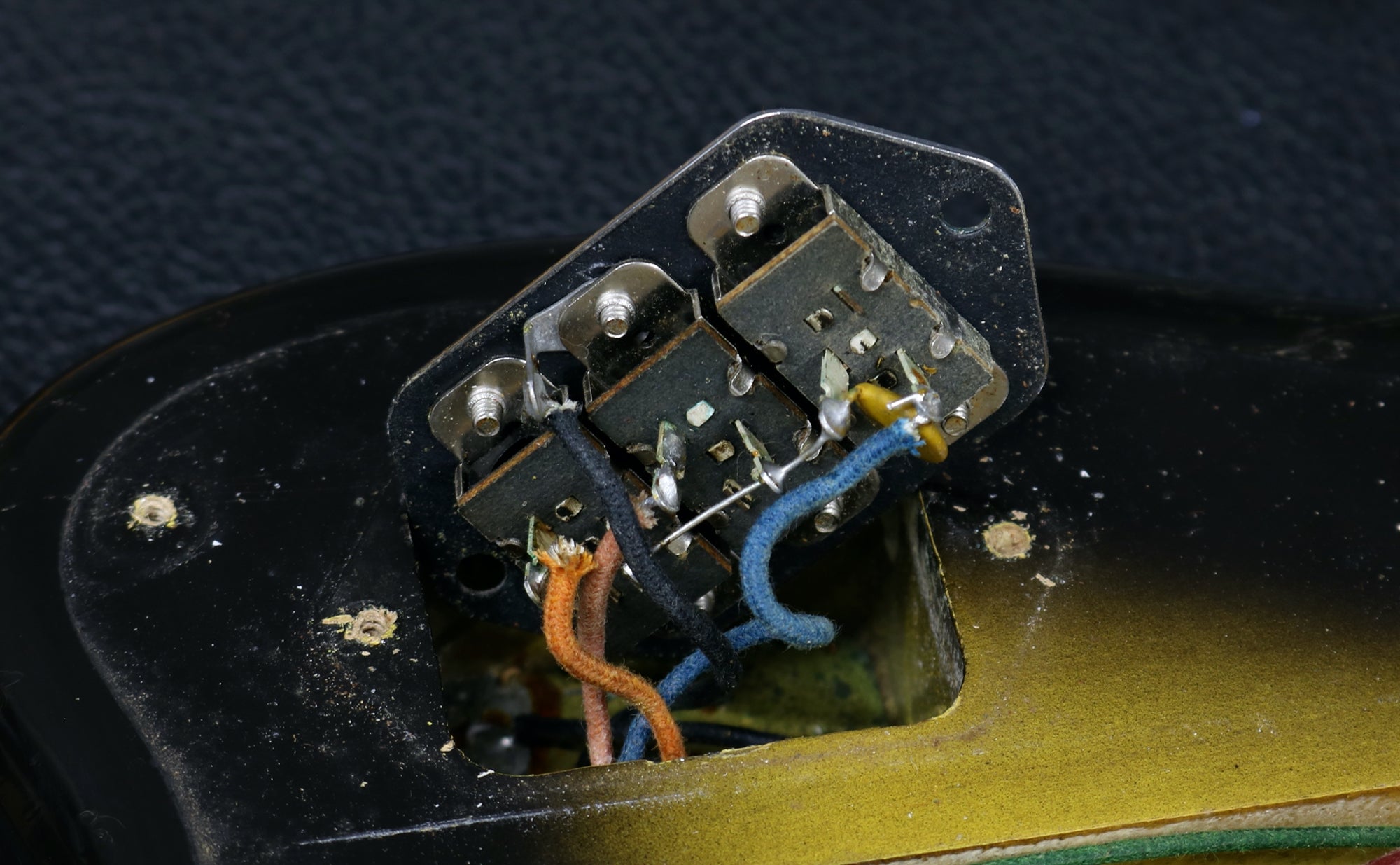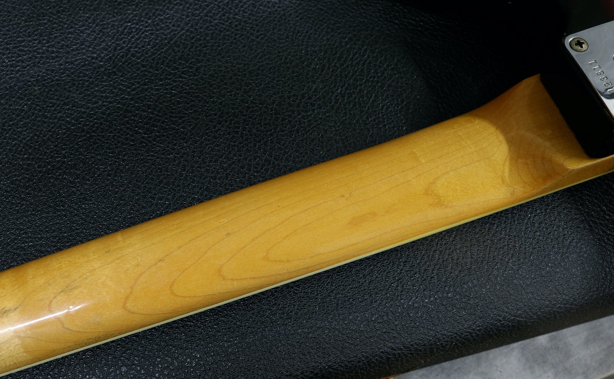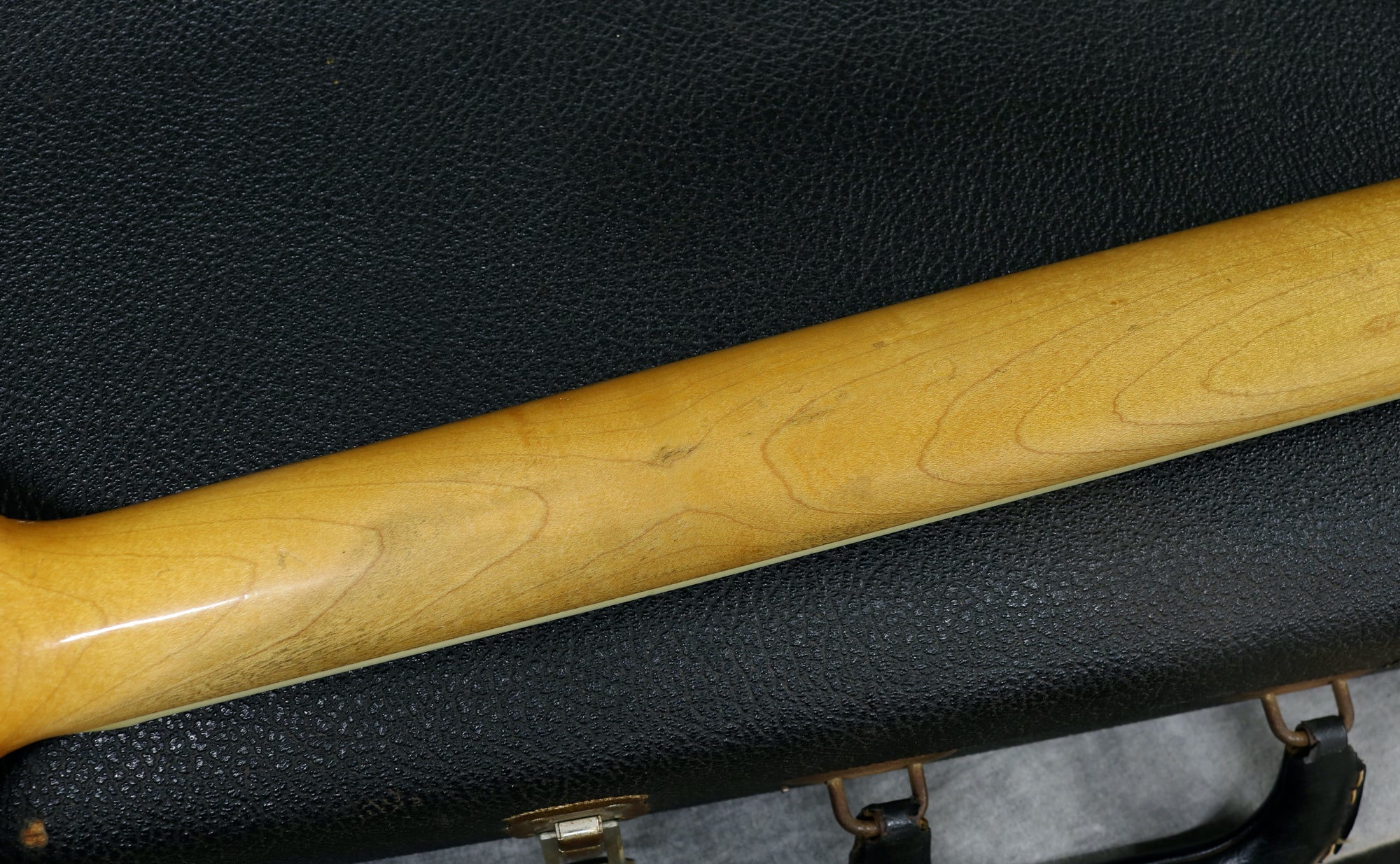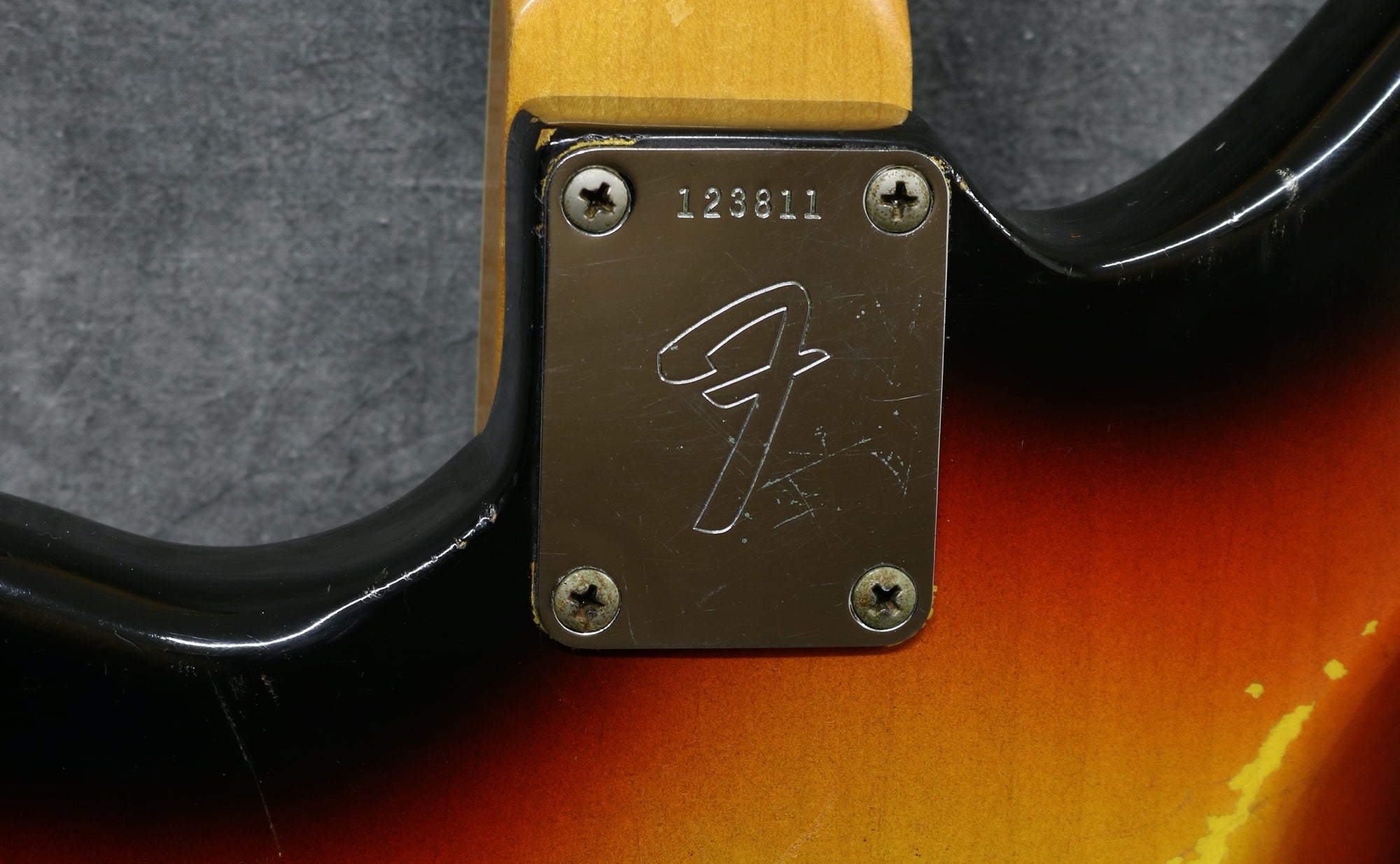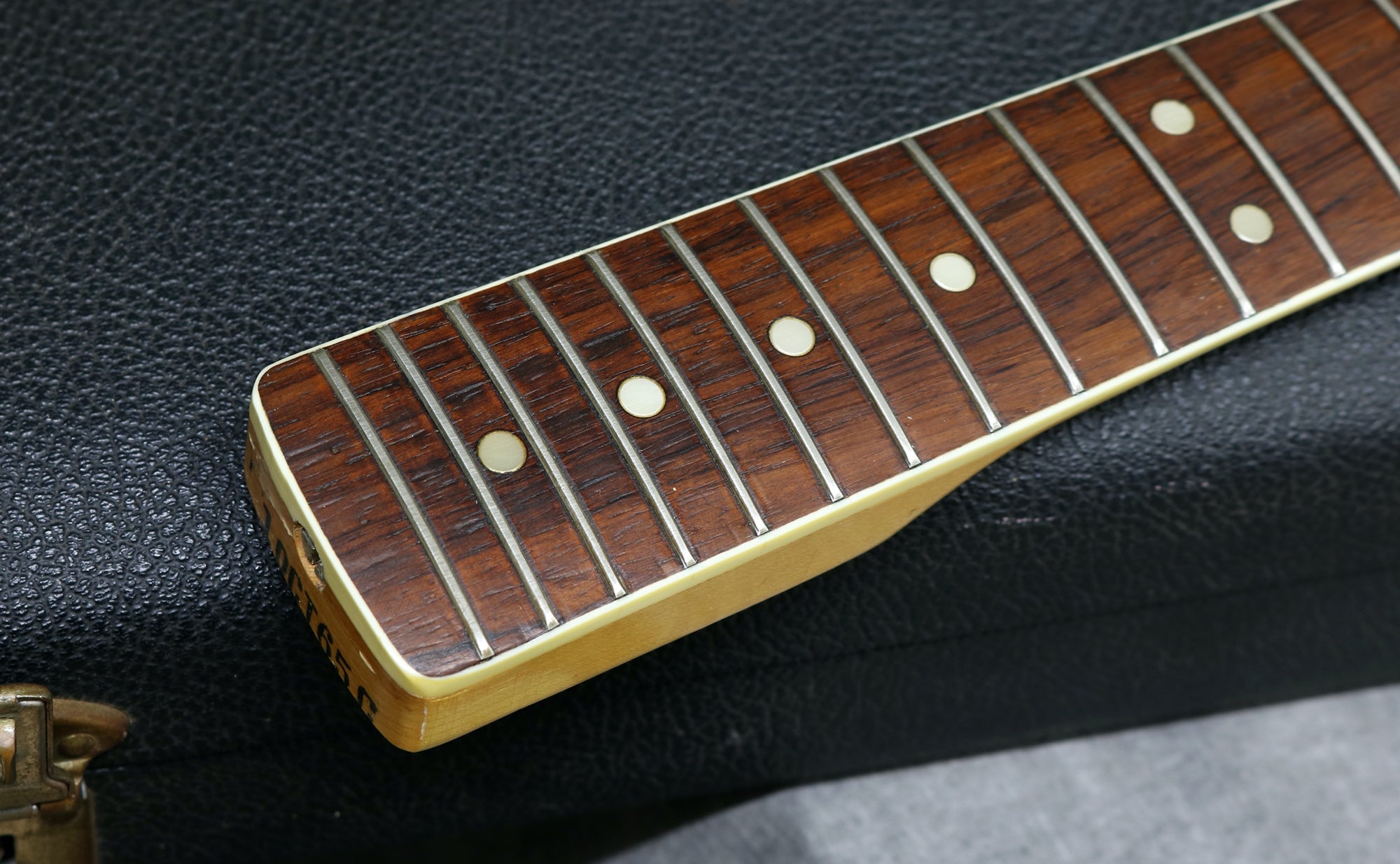 This guitar has been set up in our workshop with a fresh set of Ernie Ball Super Slinky strings and a low action. The neck is stamped OCT 65 B. Serial 123811. The pots date to the 30th week of 65. Original black bobbin pickups with original windings. Weight 8 lbs . Nut width: 42 mm. Depth at 1st fret: 22.8 mm. Depth at 12th fret: 21.6 mm.