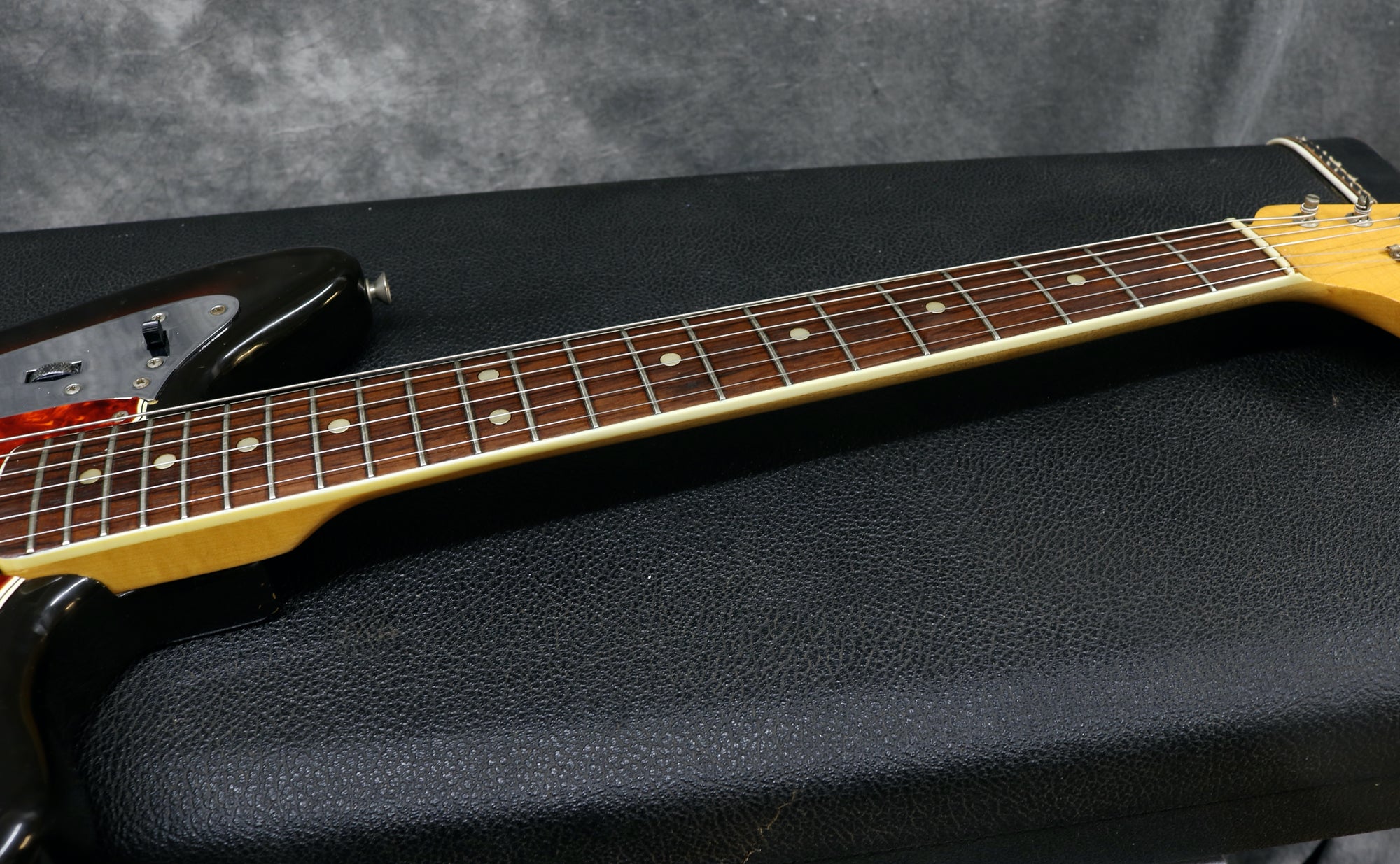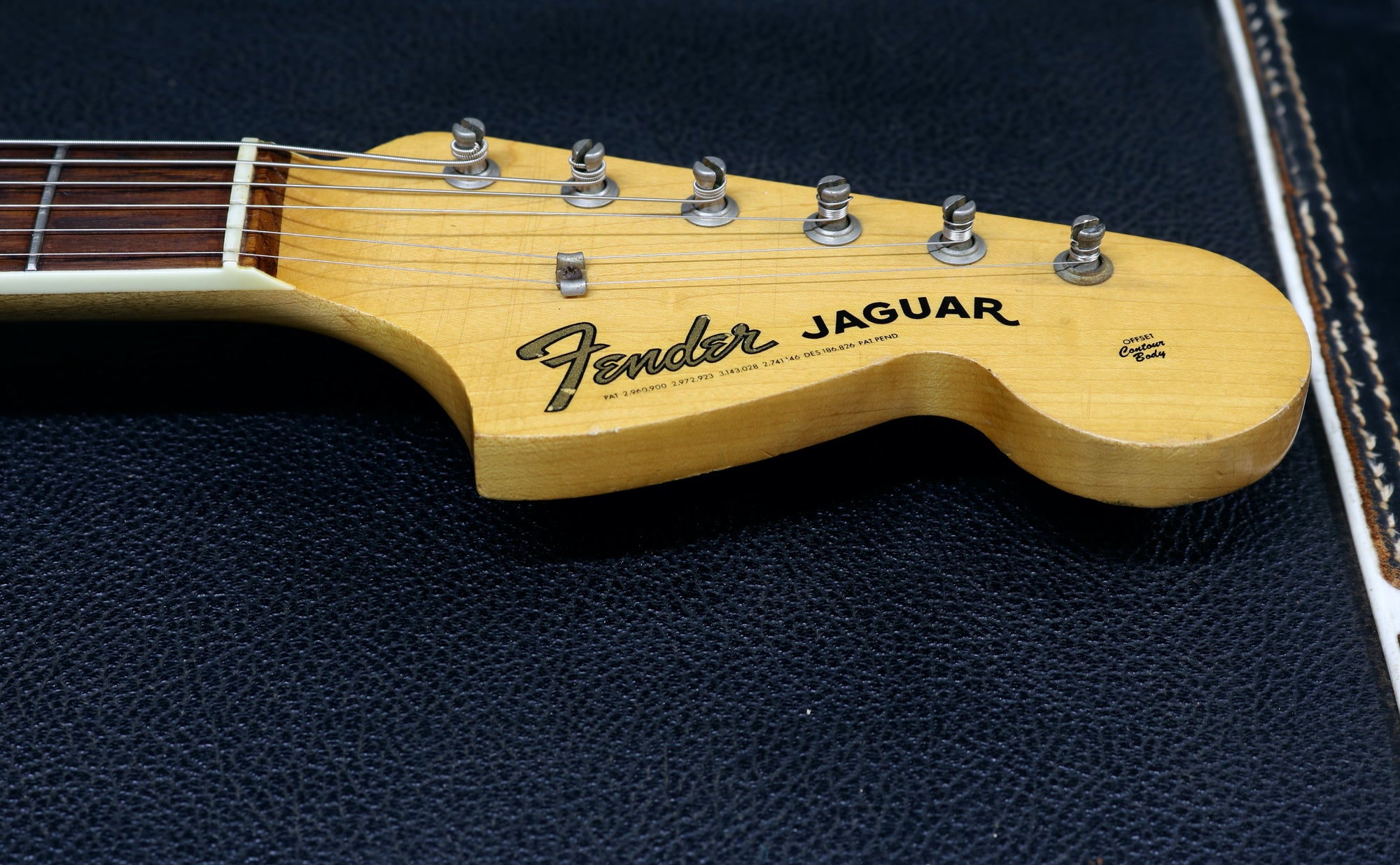 Late 65/Early 66 Fender Jaguar, Sunburst finish in good condition. It has a tortoise pickguard and a rosewood fingerboard with a bound neck. All original including the case. The mute mechanism is in the case with the whammy bar, the only thing missing is the bridge cover. It's nice and light, weighing 8lbs exactly and comes with a 3-month warranty.