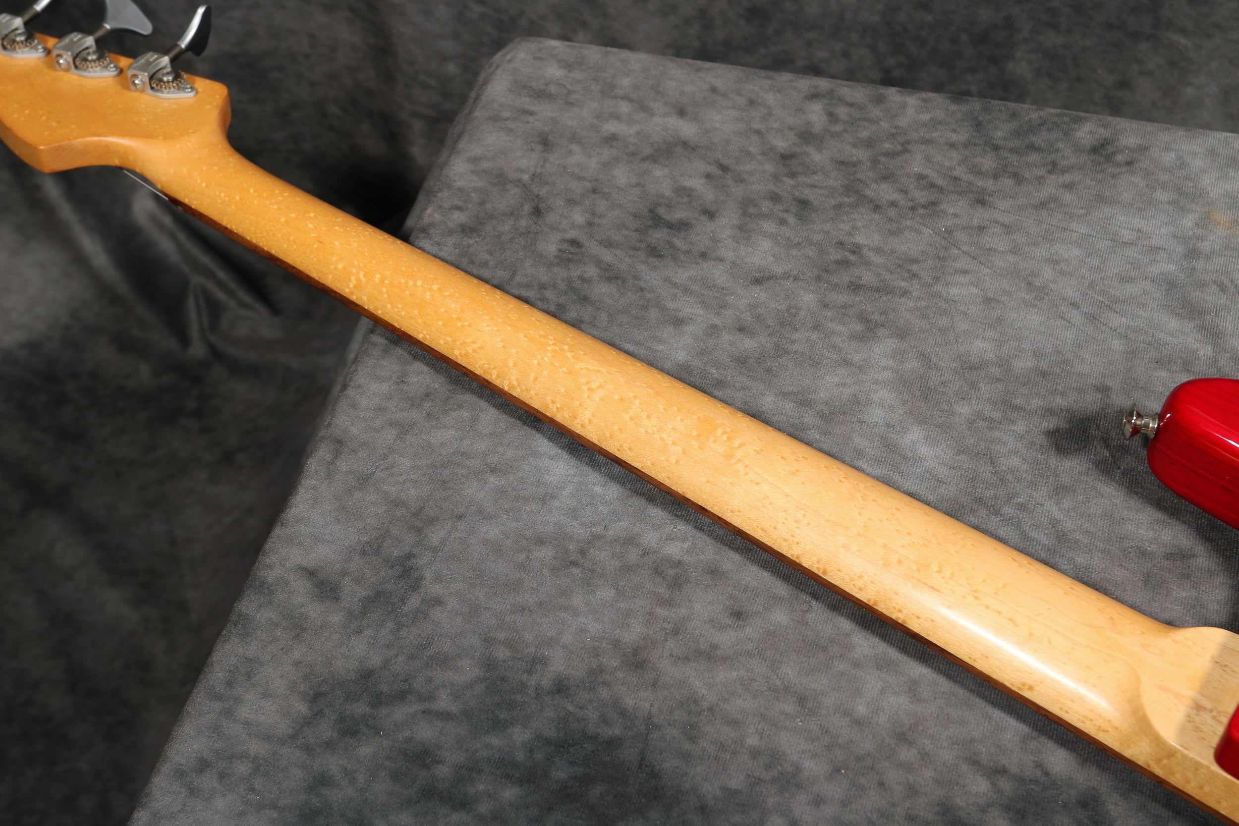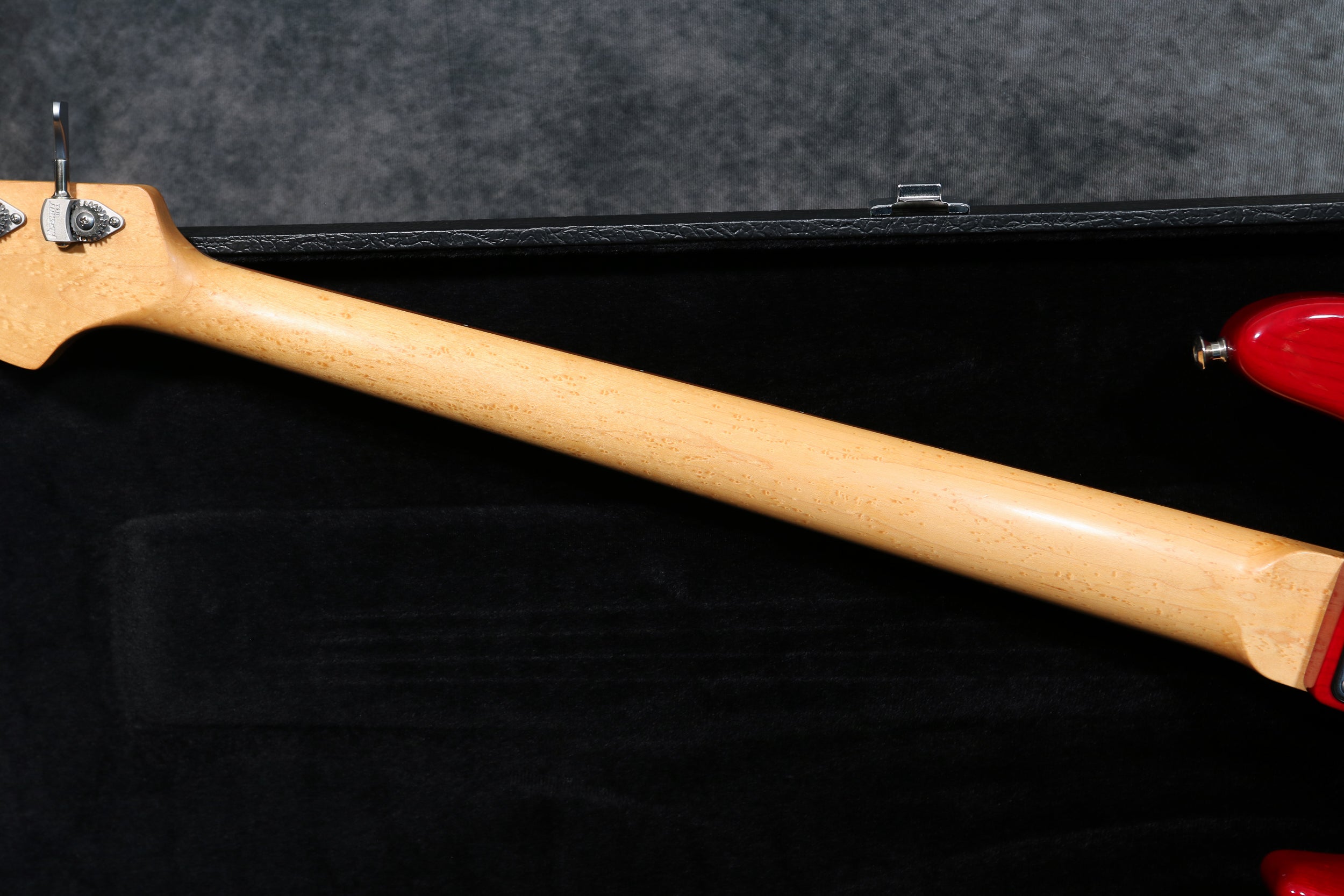 Mid-Late 90s Mike Lull Custom V4 (Coverted To JT4) - Trans Red finish over flamed maple. It has a birdseye neck and a rosewood fingerboard. This is a very early JT4 with a 2-band Bartolini EQ and 2 Lull T-Bass pickups. We spoke to Spencer Lull about it and according to him, this is the first Lull Custom to be given a serial number. (100) With the expert craftsmanship and attention to detail that Lull is known for, this mid-90s model is sure to deliver exceptional sound and performance. Own a piece of history with this rare gem. It started its life as a V4 ( with JJ pickups) and was later converted in 2013 at the Lull workshop by Mike Lull to a JT4. (with Lull T-Bird pickups) It also originally had Gotoh tuners but now has Hipshots.