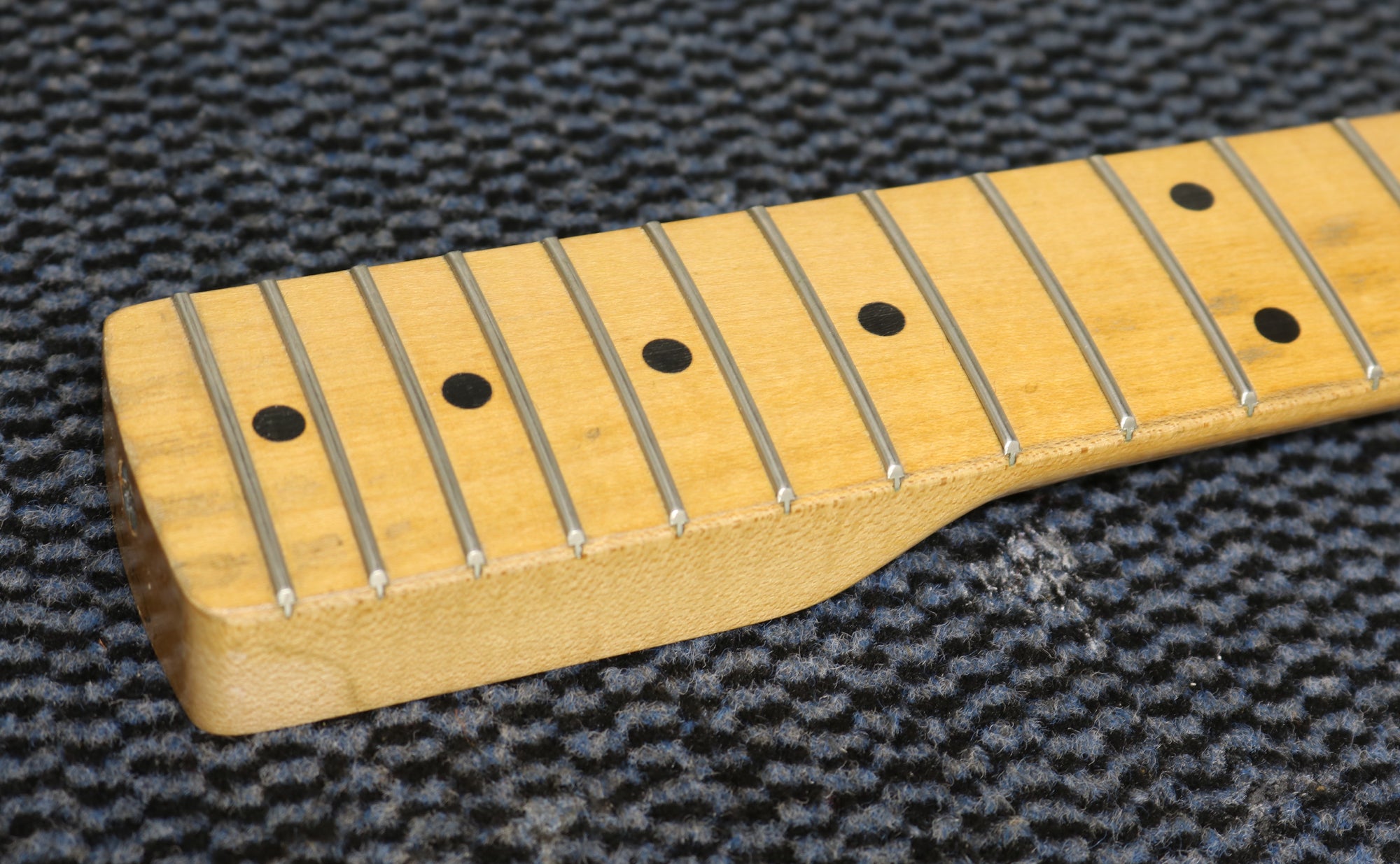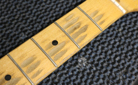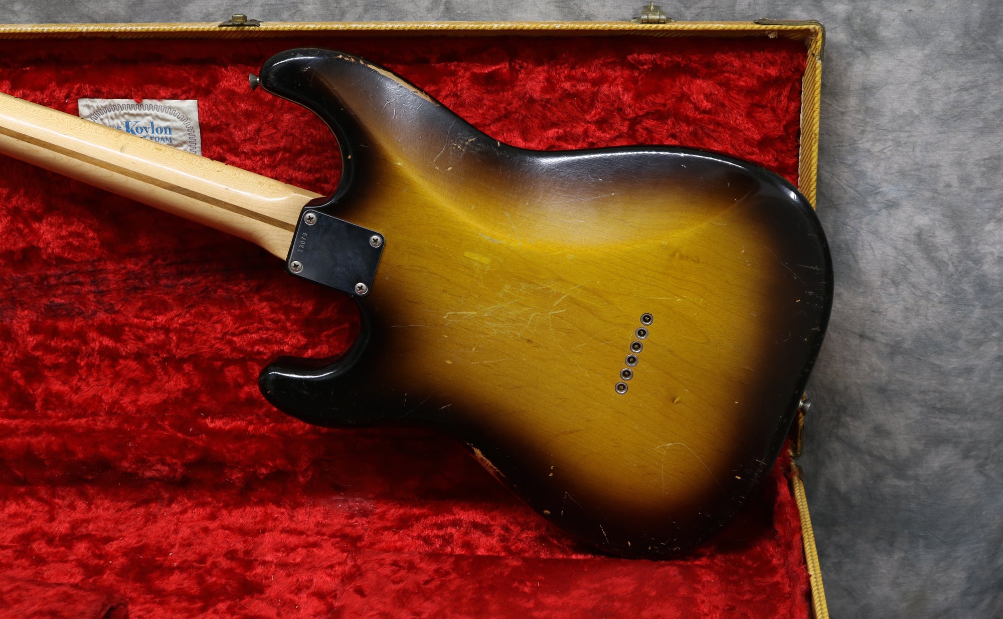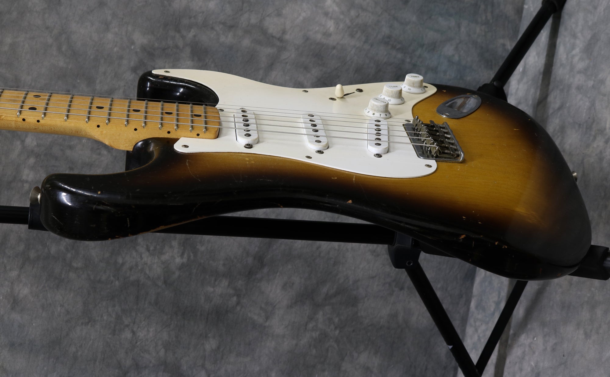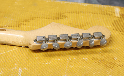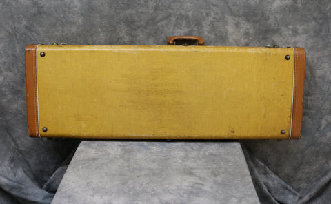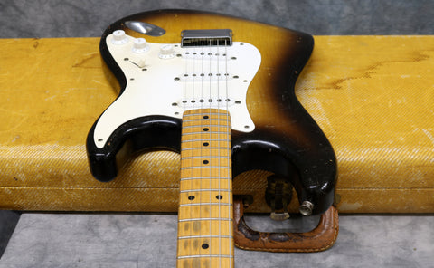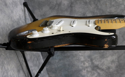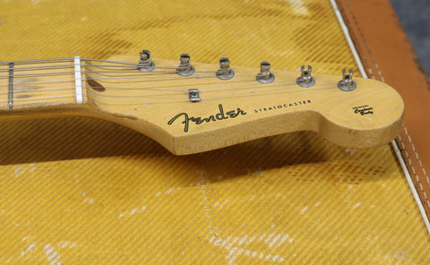 1957 Fender hard-tail Stratocaster. Original 2-Tone Sunburst finish over an ash body in very good condition. Great player with a straight neck which has a V profile consistent with this year's production. The lacquer has worn through in places on the fretboard but it's smooth to the touch and has no real depth. It had a new nut fitted and it's been re-fretted, with the appropriate size, vintage-style frets which lend to the feel of the neck. The re-fret and replacement nut have been fitted with great care and the work is excellent. The finish on the back of the neck is in very good condition and mostly intact with only light wear along the fretboard edges. The body finish has some playwear on the front and back with a few scuffs & dings around the edges. The wiring has clean and undisturbed solder joints. The pickups are well balanced and have good strong output, with great tone. Other than the re-fret and nut, this guitar is all original and complete including the tweed case.