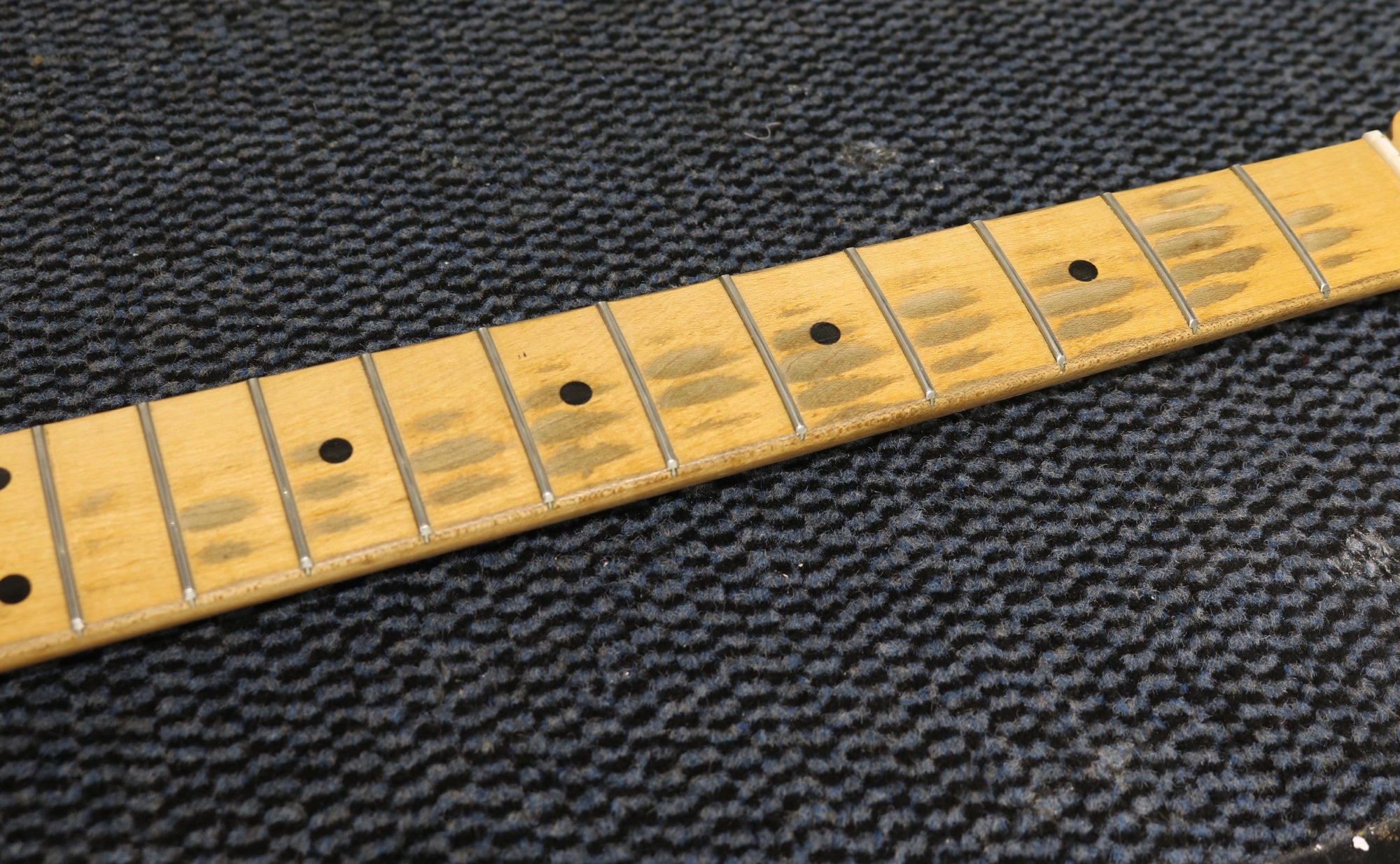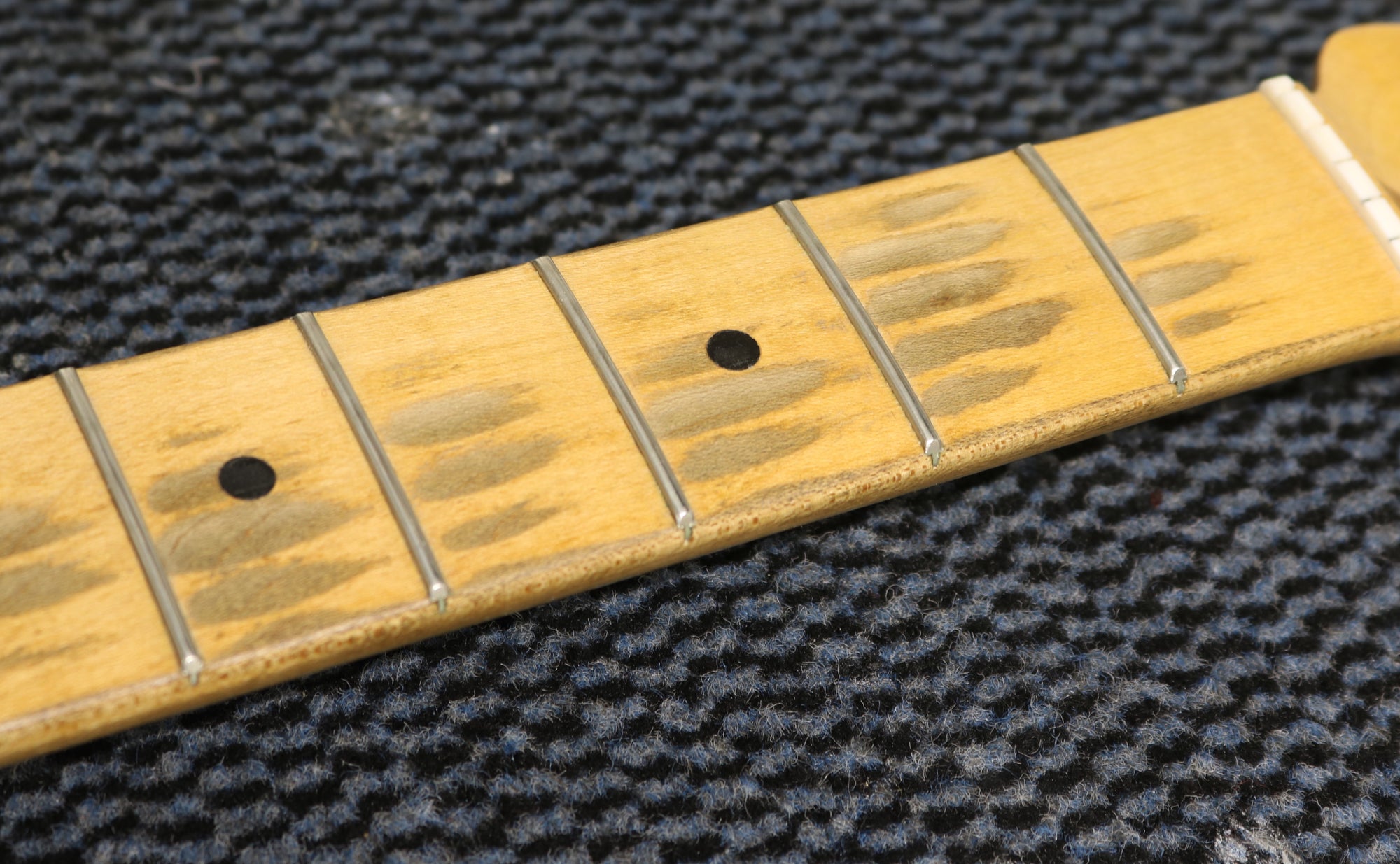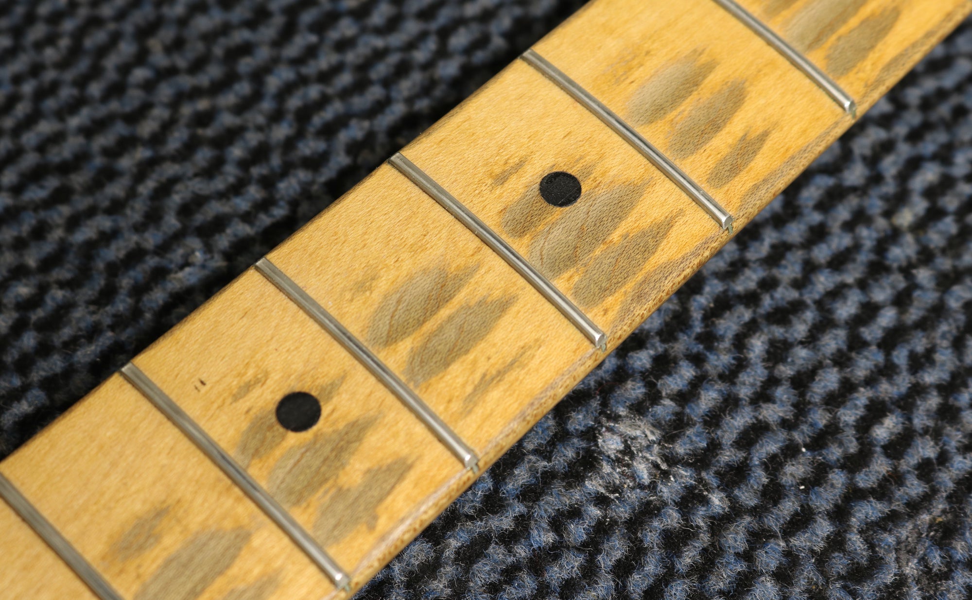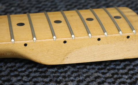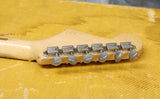 1957 Fender hard-tail Stratocaster. Original 2-Tone Sunburst finish over an ash body in very good condition. Great player with a straight neck which has a V profile consistent with this year's production. The lacquer has worn through in places on the fretboard but it's smooth to the touch and has no real depth. It had a new nut fitted and it's been re-fretted, with the appropriate size, vintage-style frets which lend to the feel of the neck. The re-fret and replacement nut have been fitted with great care and the work is excellent. The finish on the back of the neck is in very good condition and mostly intact with only light wear along the fretboard edges. The body finish has some playwear on the front and back with a few scuffs & dings around the edges. The wiring has clean and undisturbed solder joints. The pickups are well balanced and have good strong output, with great tone. Other than the re-fret and nut, this guitar is all original and complete including the tweed case.