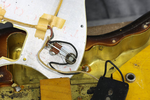 This guitar has been set up in our workshop with a fresh set of Ernie Ball strings and a medium-low action. The body has a pencil date of 9/60. The neck is pencil-dated 2/61. The tone pot dates to the 43rd week of 60, the volume pot, 50 th week of 59. Both pickups are original with black bobbins and original windings. Weight 8 lbs 4.5 oz / 3.75 kg. Nut width: 42. mm. Depth at 1st fret: 21.5 mm.