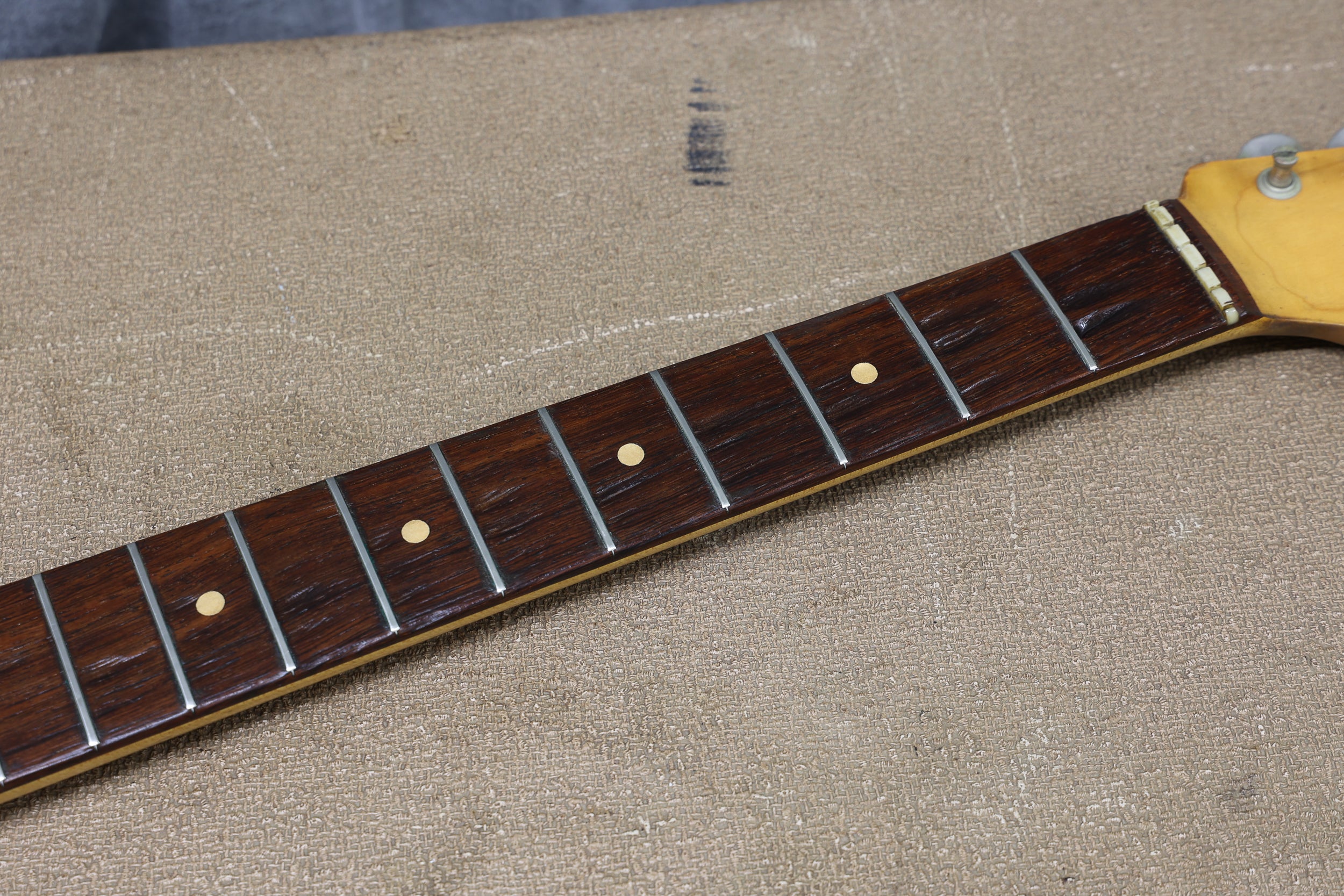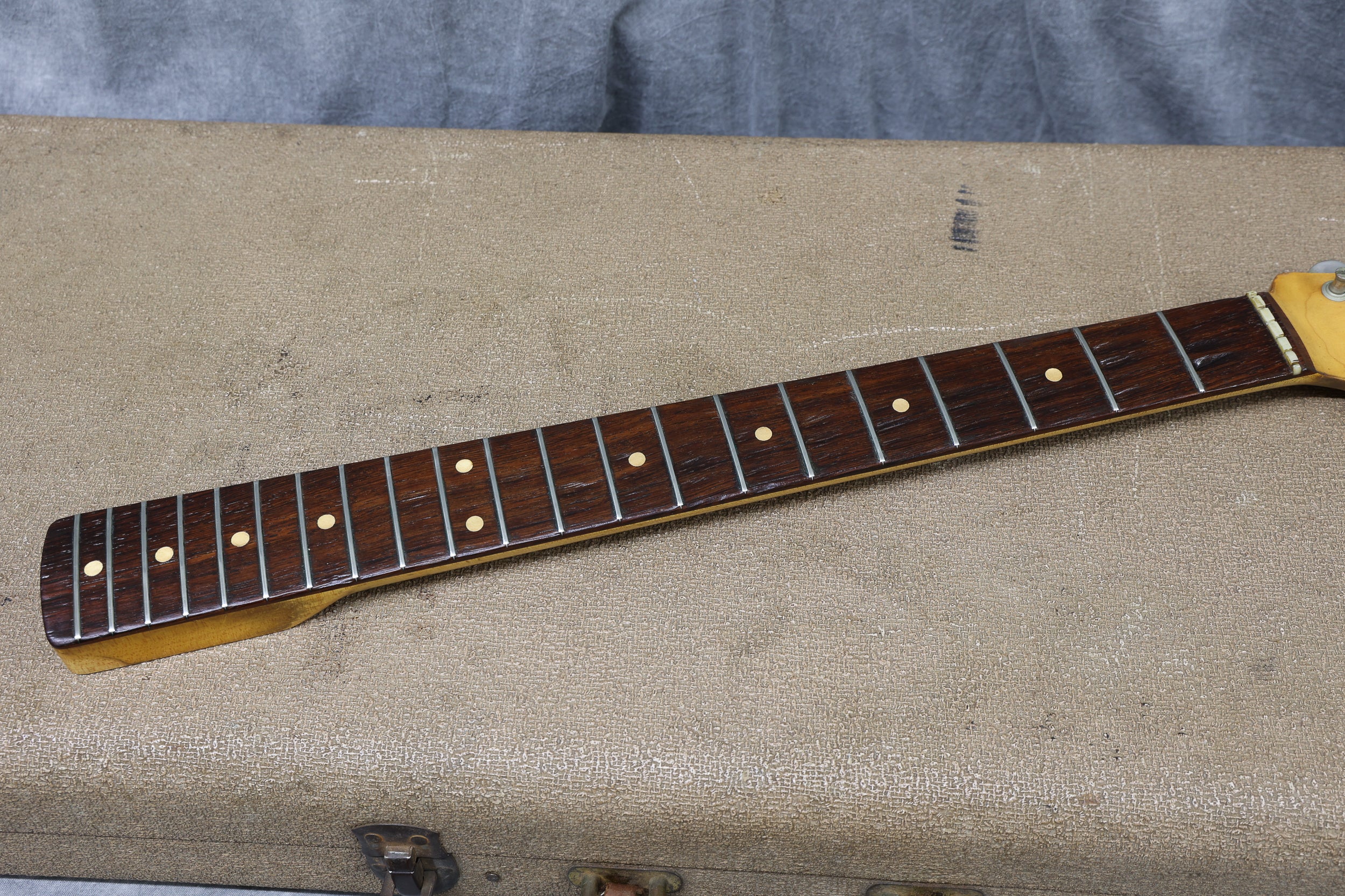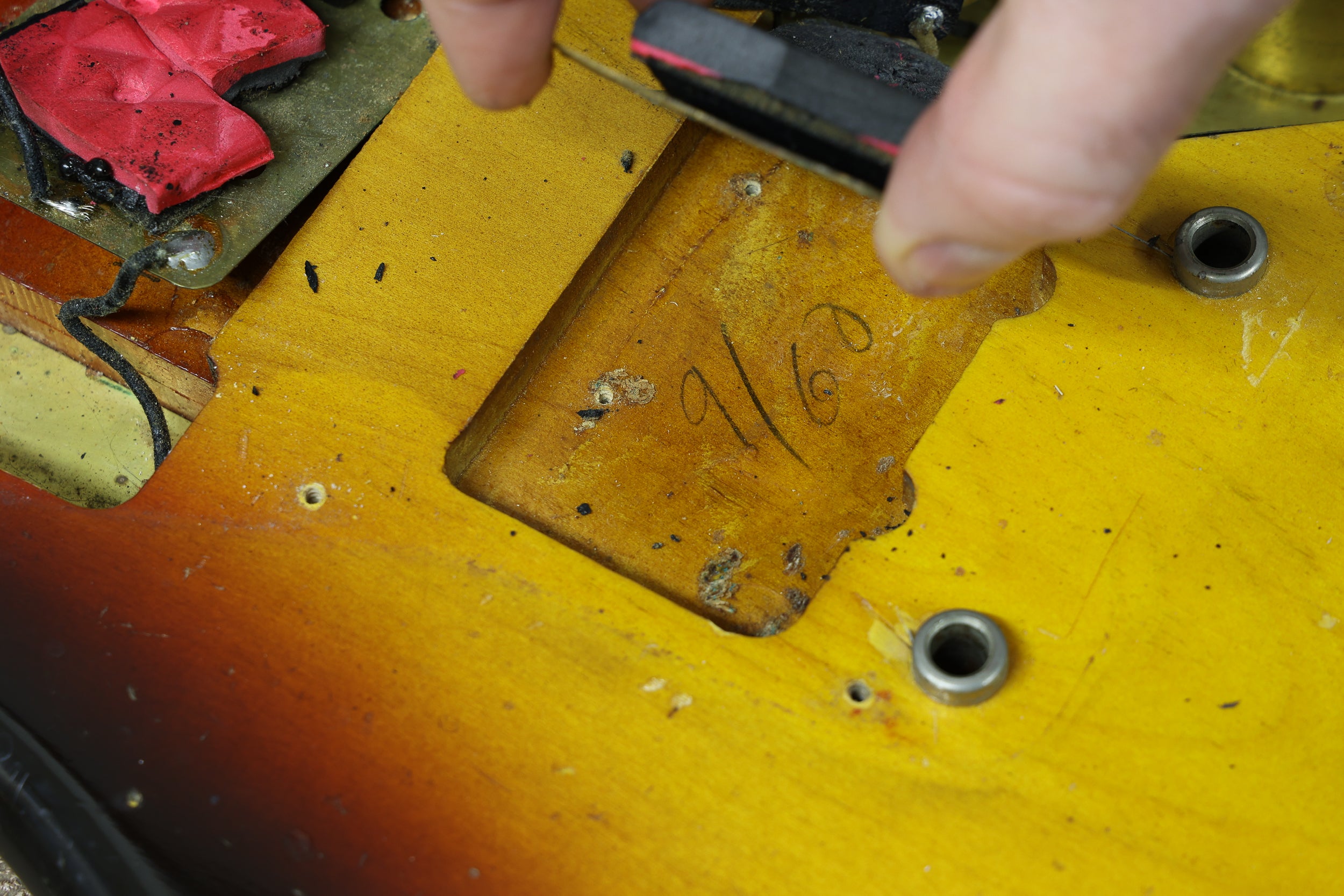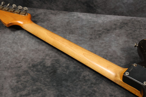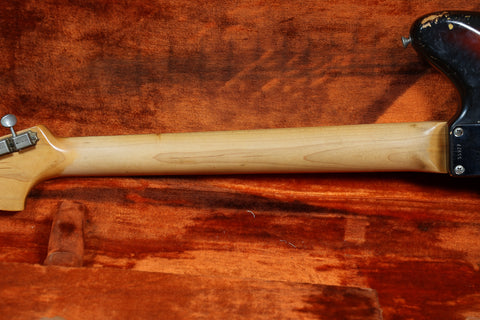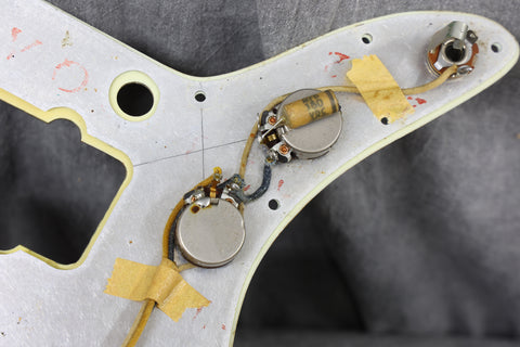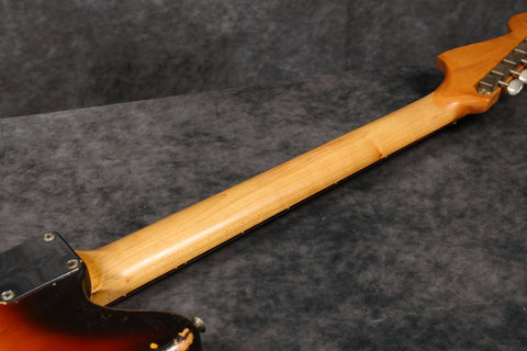 The Sunburst remains pretty strong throughout. There are numerous small nicks and dings, mainly around the edges of the body. The finish on the back of the neck has worn smooth. The edges of the headstock have some wear, but nothing major, and everything remains structurally sound with no breaks or repairs. The pickguard is in great condition with only minimal shrinkage and no warping. The frets have been cleaned and dressed in our workshop. Theyre on the lower side but still have some life left. The fingerboard has playwear. All hardware and electronics are in good working order, including the truss rod, which works correctly.