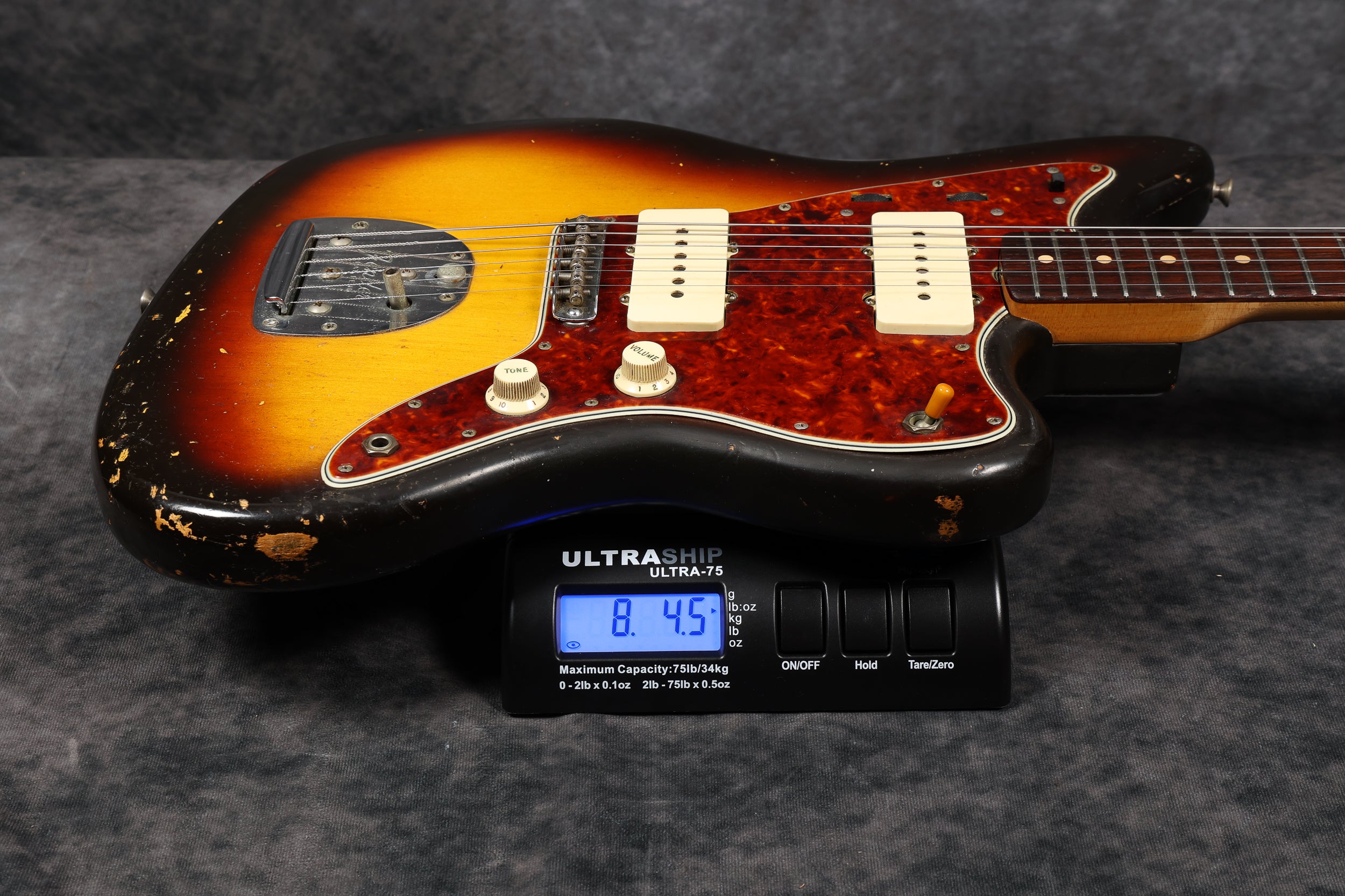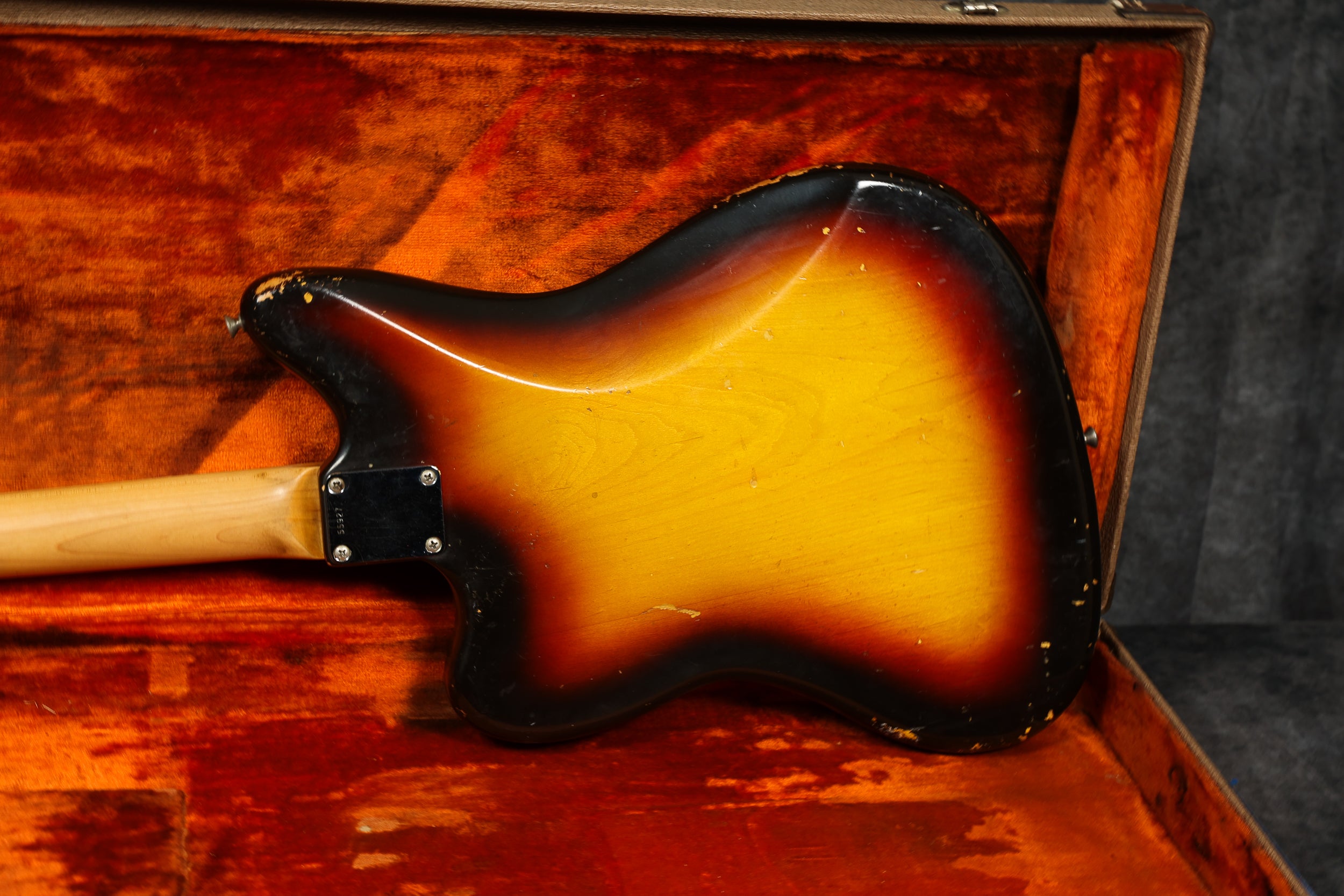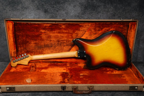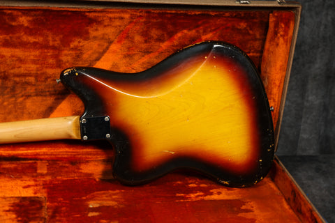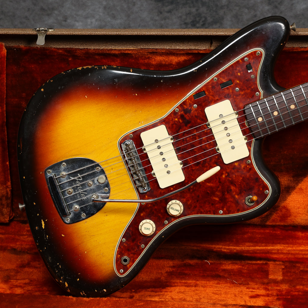 1961 Fender Jazzmaster, serial: 55927. Sunburst finish in good condition. Aside from the switch tip and some additional sponge under the pickups, this Jazzmaster is all original, including the case. It has a beautiful tortoiseshell pickguard and a slab rosewood fingerboard with clay dots. It's an amazing guitar to play, and it sounds fantastic. It comes supplied with a Mastery M1 bridge, should you wish to use it.
