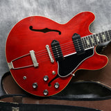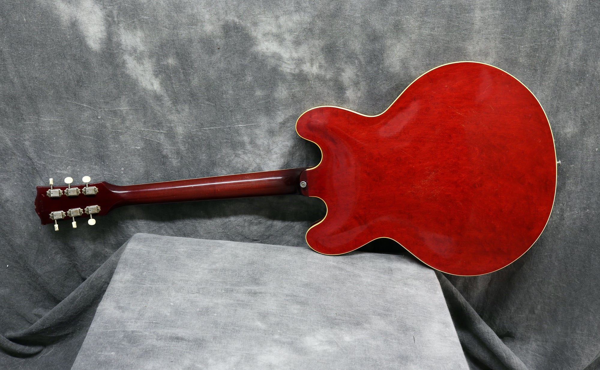 The ES-330 shares the body shape of the ES-335, ES-345 and ES-355 and is a lightweight, lively sounding guitar when played acoustically or plugged in. It's fitted with powerful P-90 single coil pick-ups which are nicely balanced. This example has a few small dings and scuffs around the headstock and on the back of the neck. The body finish is in great shape with a couple of patches of noticeable wear on the front and very minor play wear on the edges and back. The cherry finish remains very vibrant. The frets are in good condition with only minimal wear.
