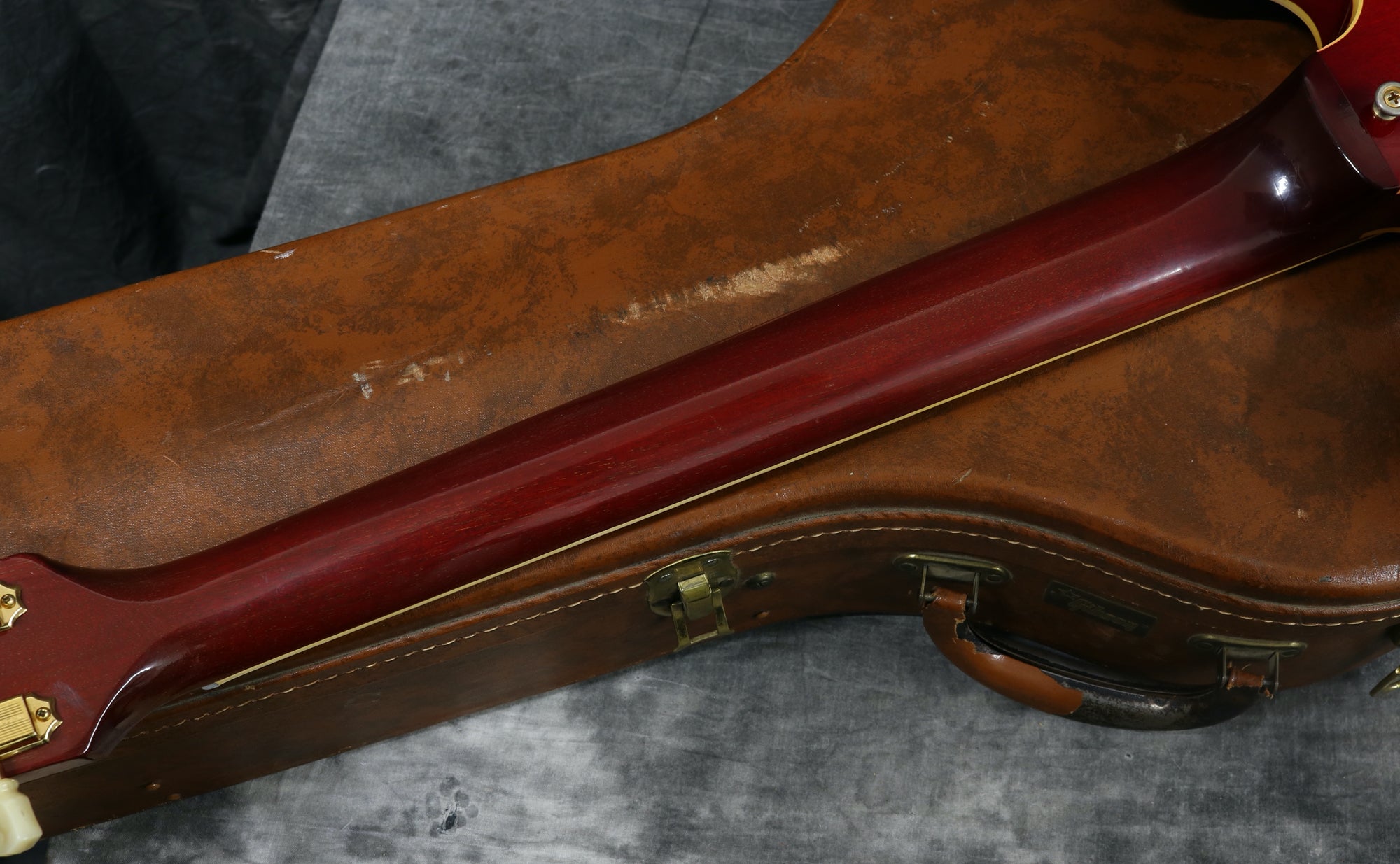 You have to look closely to find any imperfections on this guitar. Upon close inspection there are one or two small scuffs in the front face along with light play wear and tarnishing to the gold plating on the pickups and tail-piece. There are also a few small scuffs in the lower section in the back. The edges of the body have a couple of light scratches. The back of the neck is extremely clean with very little wear. The tuners are extremely clean with very little deterioration to the buttons. The headstock has a few small dings around the edges. There are no breaks/cracks or repairs and everything remains structurally sound. The frets have only the light signs of wear and all hardware & electronics are in excellent working order. The binding has yellowed over time but is all intact.