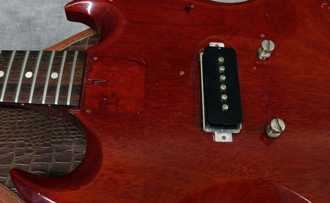 The Gibson SG Junior was introduced in 1960. The budget model of the new SG line quickly became a rock and roll workhorse. These were fitted with a dog ear P-90 pickup on a resonant lightweight mahogany body. Matched with a stud wrap tailpiece, the clarity, punch and power made these a favourite of the indie crowd.