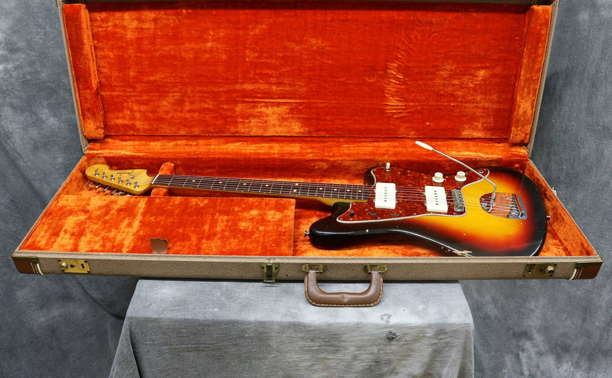 Early 1963 Fender Jazzmaster, Sunburst finish in good condition. It's missing the bridge cover but otherwise all original and complete including the brown case. It has a beautiful tortoiseshell pickguard and a rosewood fingerboard. The Jazzmaster was Launched in mid 1958 as the top of the range Fender guitar, and featured Fender’s first neck with a rosewood fretboard. It's an incredible Rock’n’Roll and Surf guitar and was a firm favourite of 90s bands like Nirvana, Sonic Youth and My Bloody Valentine.