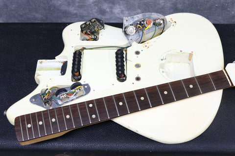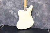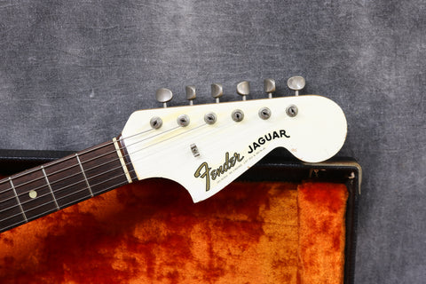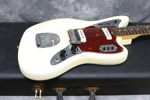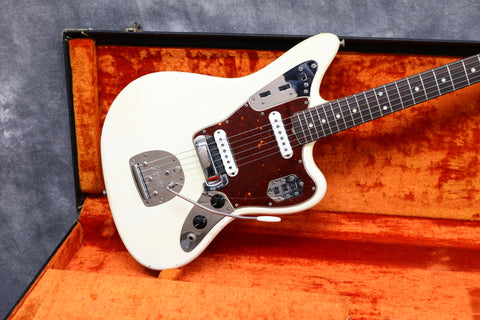 Late 1964 Fender Jaguar with serial number: L53728, Olympic White custom colour finish with matching headstock in very good condition. It has a beautiful tortoise shell pickguard and rosewood fingerboard. All original and complete including the bridge cover, tremelo arm and brown case. 3-month warranty and 7-day returns policy included.