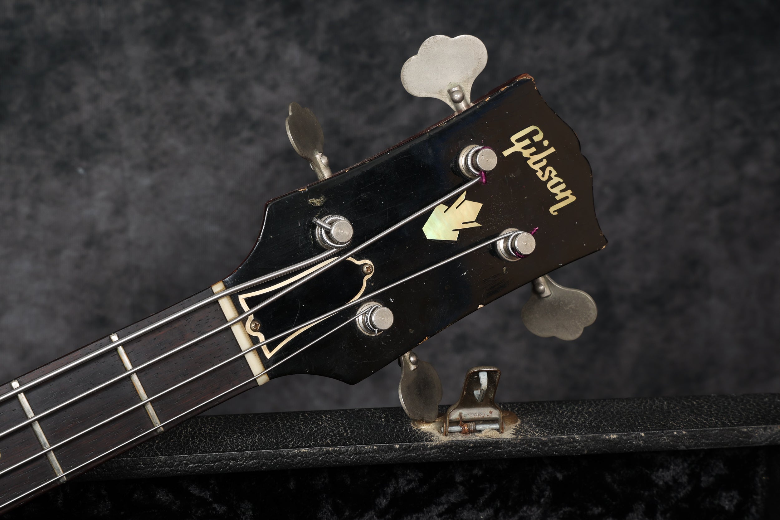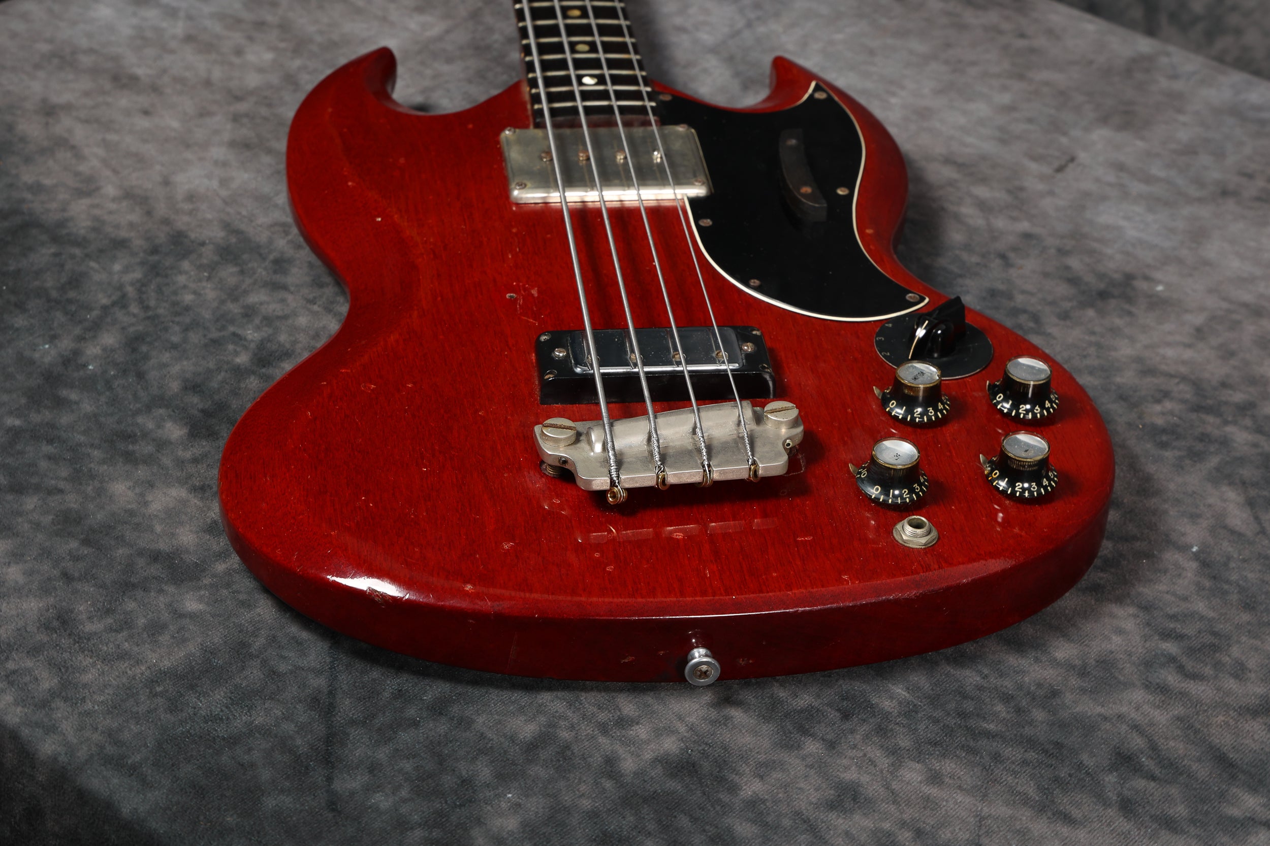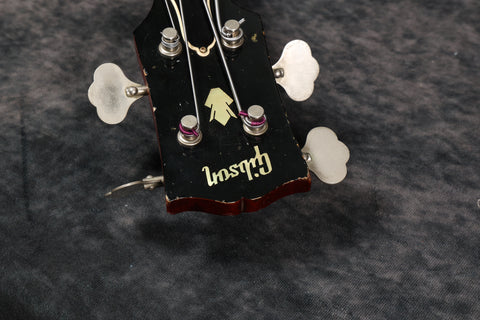 This bass started life as an EB0 model (1 neck pickup), and at some point, had the control cavity enlarged to accommodate the extra pots and varitone switch. The body was also routed for the bridge pickup. The parts used are correct Gibson parts and period correct.