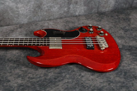 1964 Gibson EB3, Cherry *Converted From An EB0*. Supplied with a hard case. There's light wear and tear, including small scuffs and dings, mainly around the edges of the body and headstock, and a small repair by one of the bridge posts, but overall it's in good condition. The Cherry finish is still very vibrant and has some light lacquer checking.